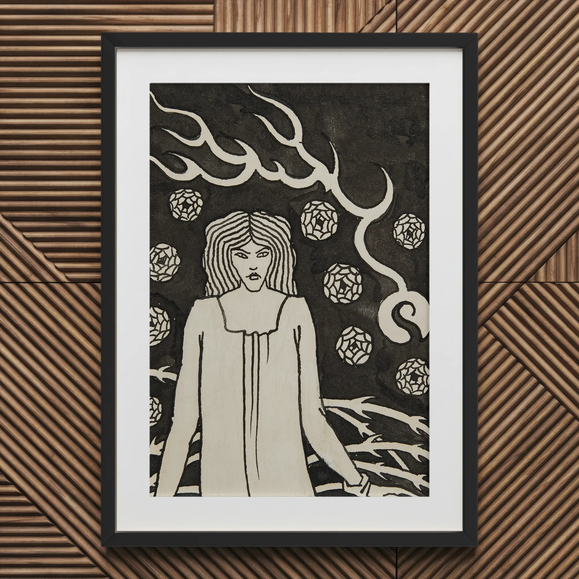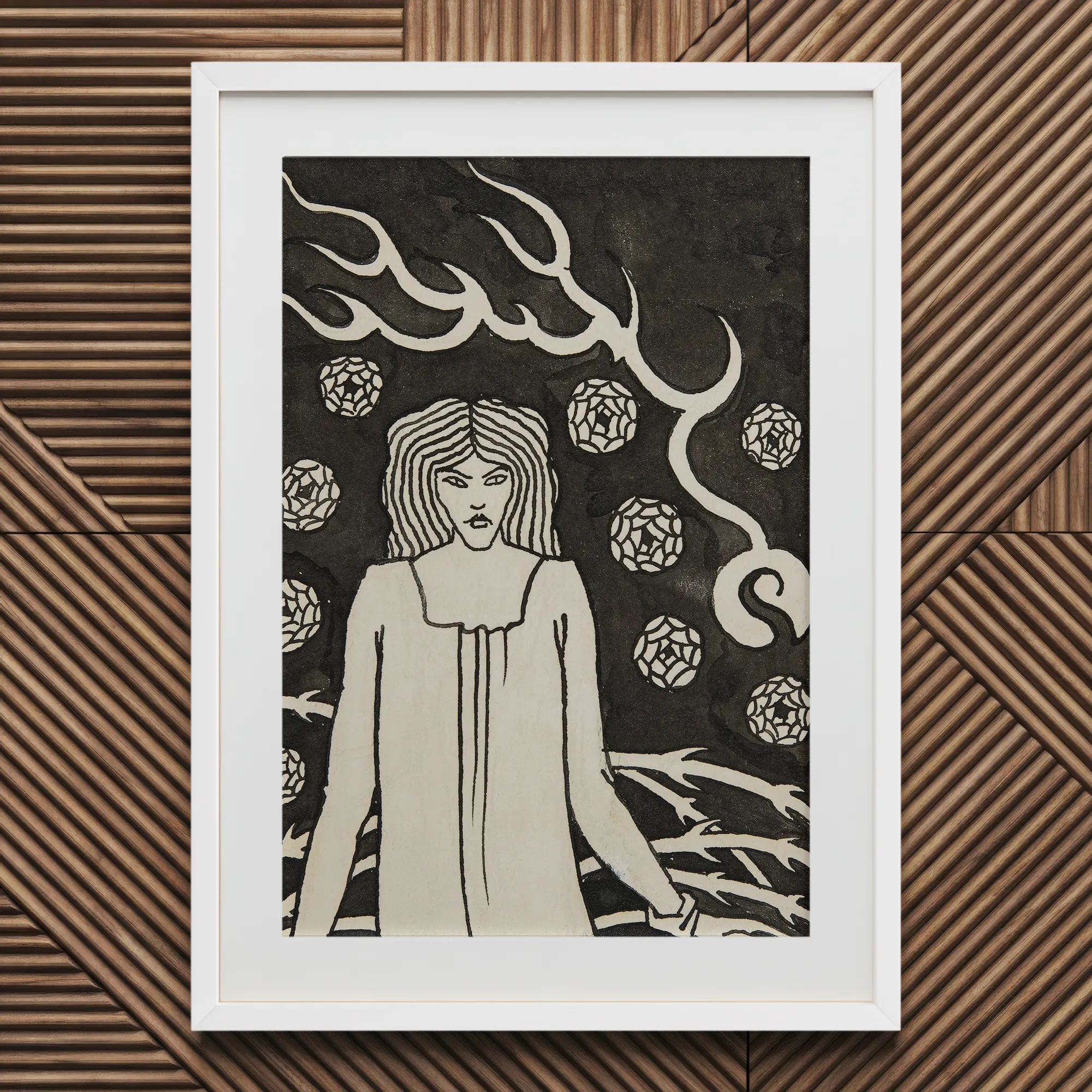 Das Profil der jungen Frau schwankt zwischen Heilige und Verführerin, ihr Blick über die Vernunft hinaus fixiert, als würde sie dem Summen im Inneren des Verlangens selbst lauschen. Stilisierte Rosen lodern gegen einen leeren Hintergrund, Blütenblätter umrandet von Bedrohung und Parfüm. Es fühlt sich dekadent, theatralisch an, verzehrt von dem Fieber des Symbolismus - die Welt zittert zwischen Vergnügen und Ruin, Schönheit und Zersetzung.