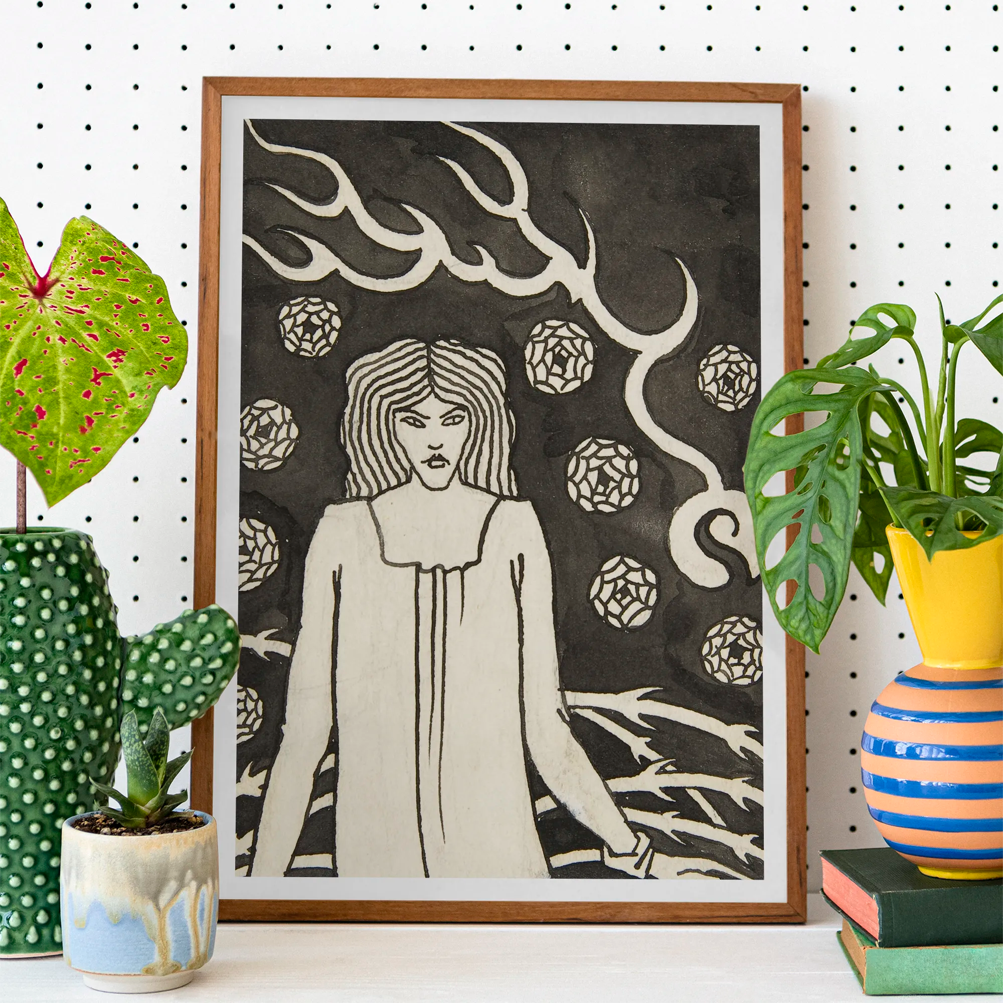 Dornen kräuseln sich wie Stacheln um ihre bleiche Gestalt, jede Linie geschärft von Beardsleys obsessiver Hand. Tinte wird zu Spannung, blüht in Windungen von Blitzen auf, die sich durch das Gestrüpp winden.
