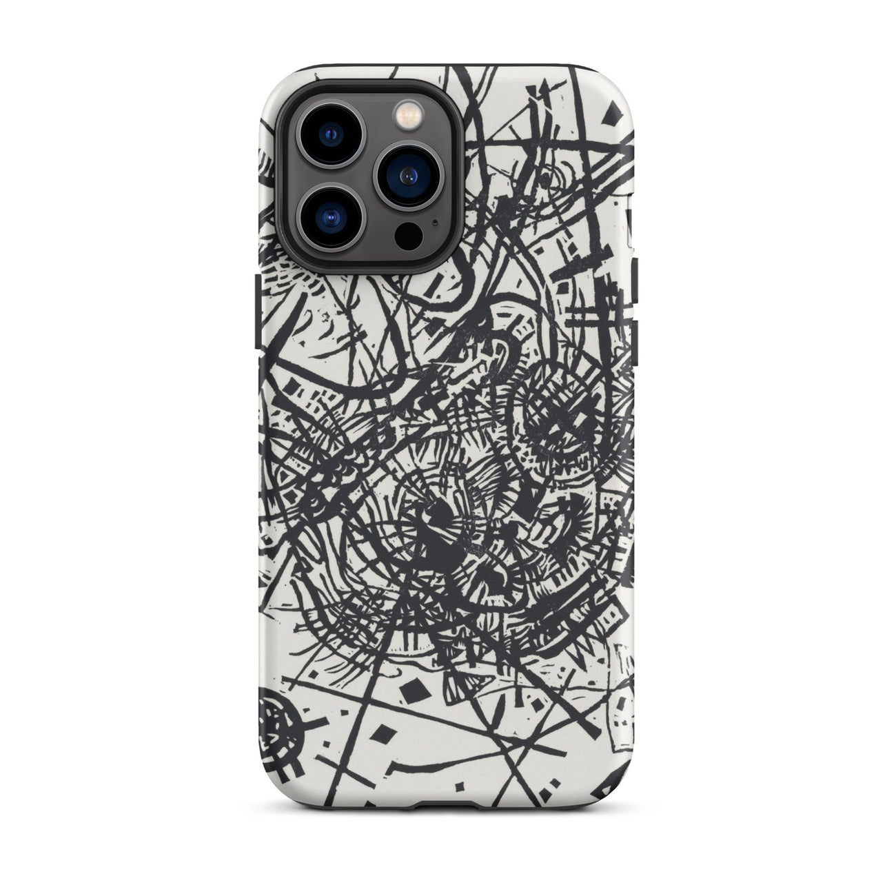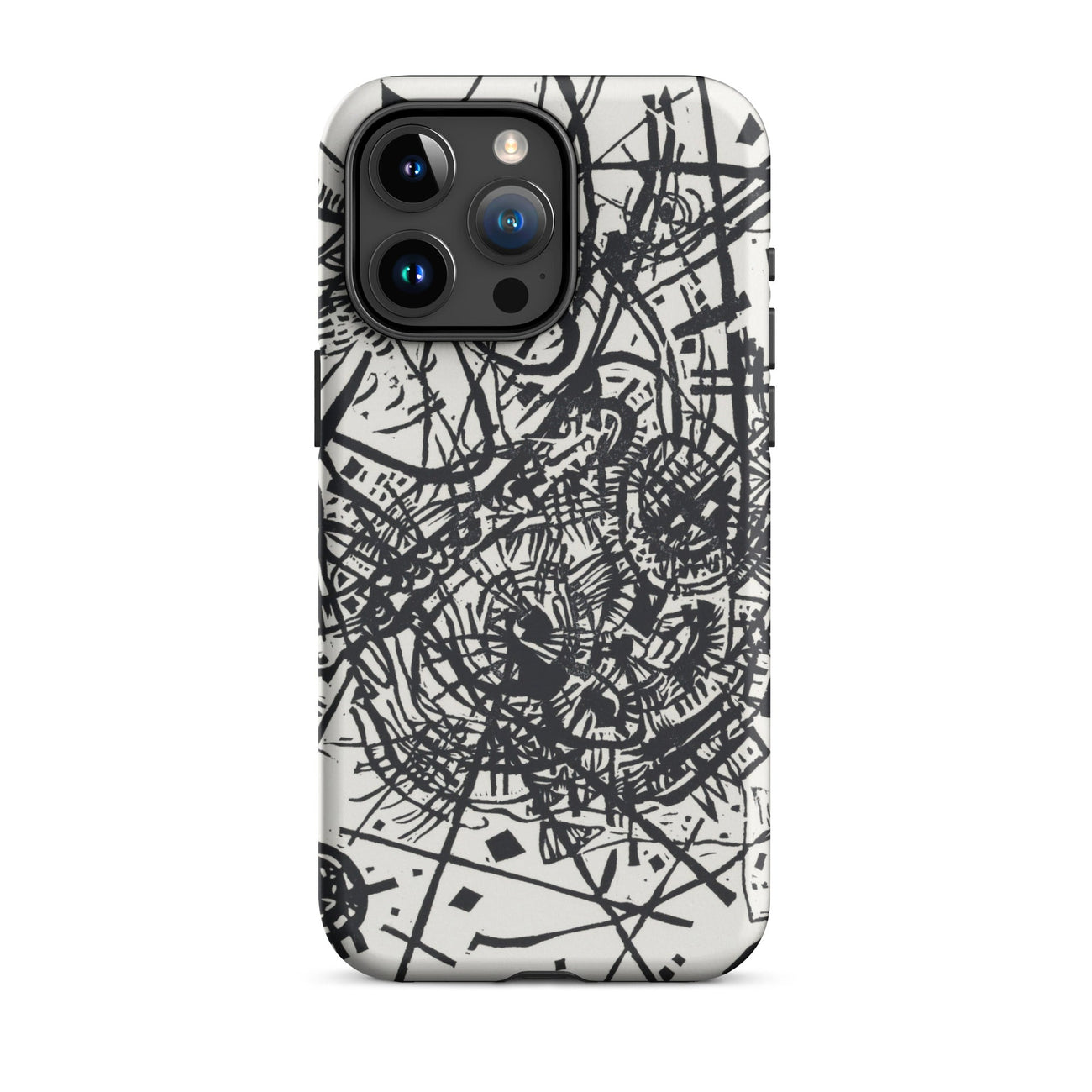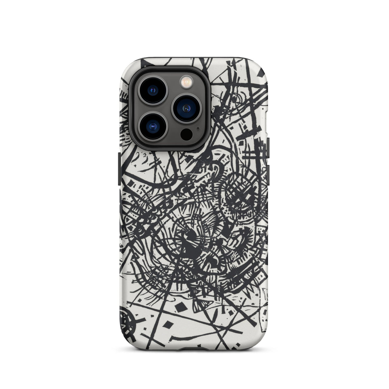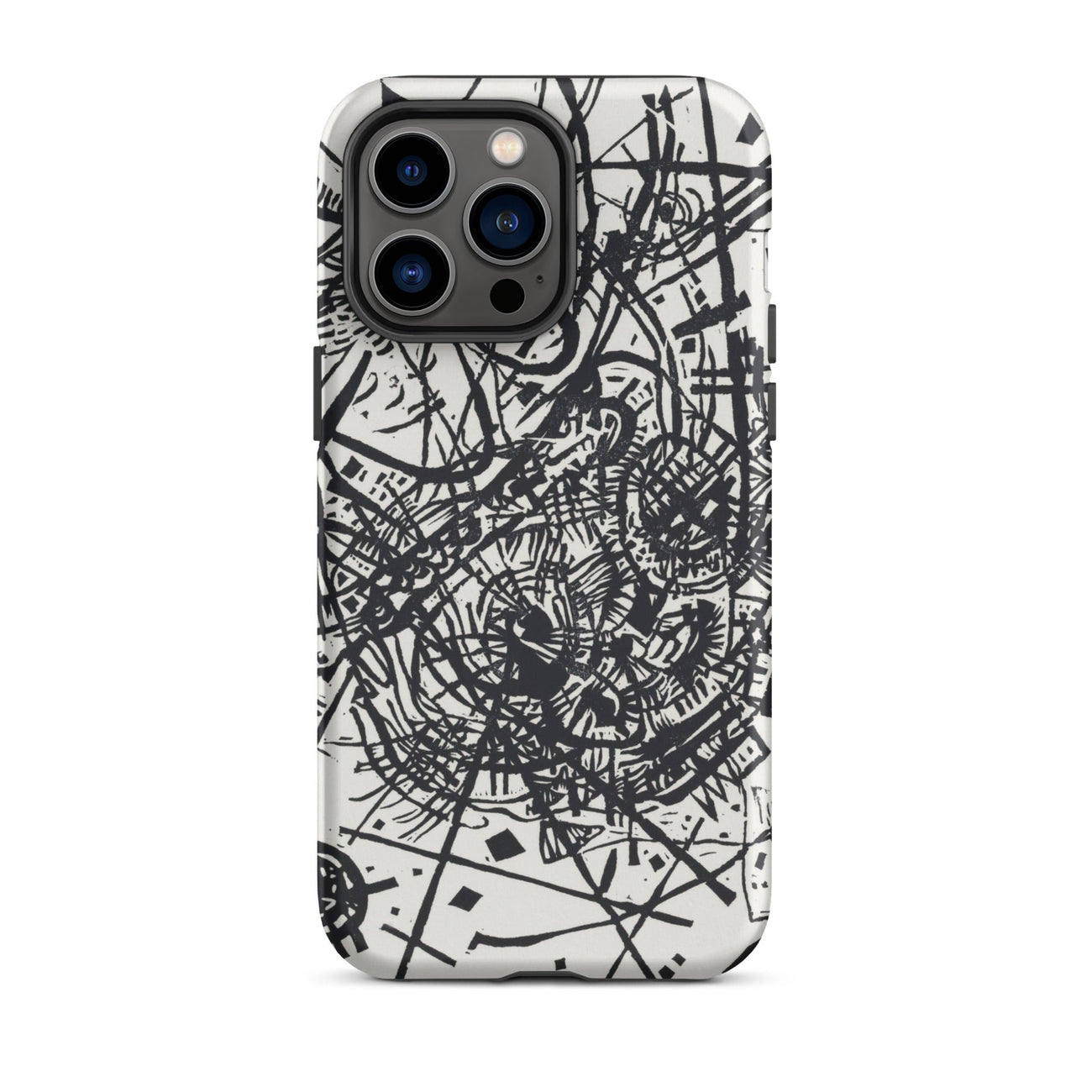 Keine Schwerkraft. Nur Wirbel. In Kleine Welten VIII zeichnete Wassily Kandinsky Satelliten der Absicht, die sich in heftiger Uneinigkeit drehten. Diese iPhone-Hülle wird zu einem Feld unausgesprochener Physik—wo Linie weder Messung noch Stimmung ist, sondern Bruch. Spiralen zerbrechen in Radarschreie. Striche schneiden durch den Raum wie mathematische Verletzungen.