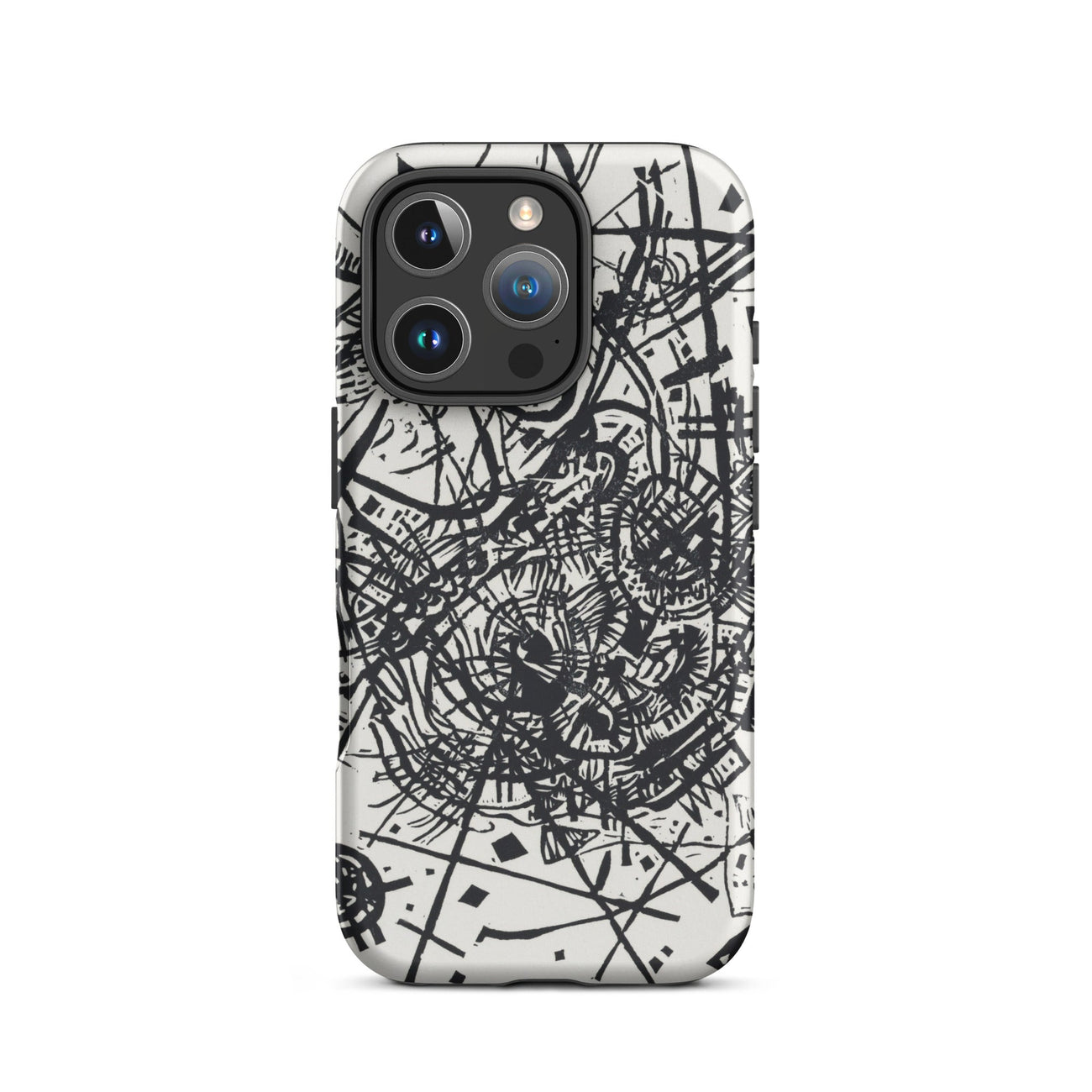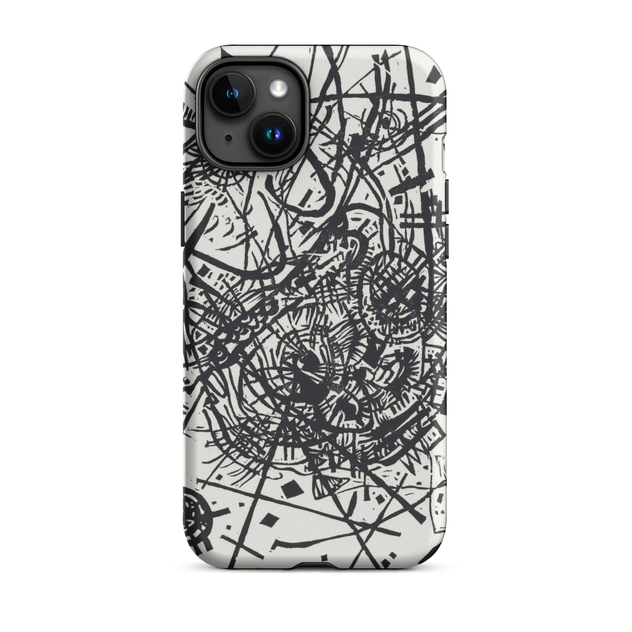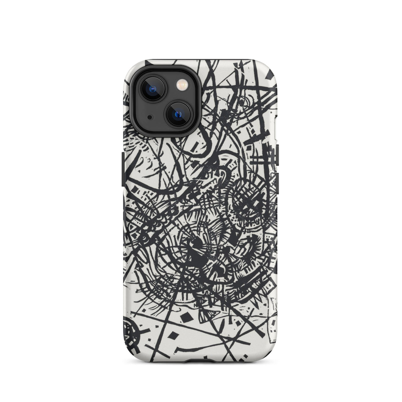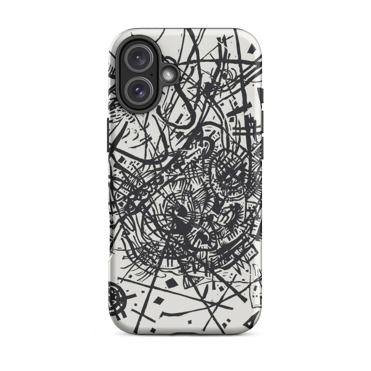 Keine Schwerkraft. Nur Wirbel. In Kleine Welten VIII zeichnete Wassily Kandinsky Satelliten der Absicht, die sich in heftiger Uneinigkeit drehten. Diese iPhone-Hülle wird zu einem Feld unausgesprochener Physik—wo Linie weder Messung noch Stimmung ist, sondern Bruch. Spiralen zerbrechen in Radarschreie. Striche schneiden durch den Raum wie mathematische Verletzungen.