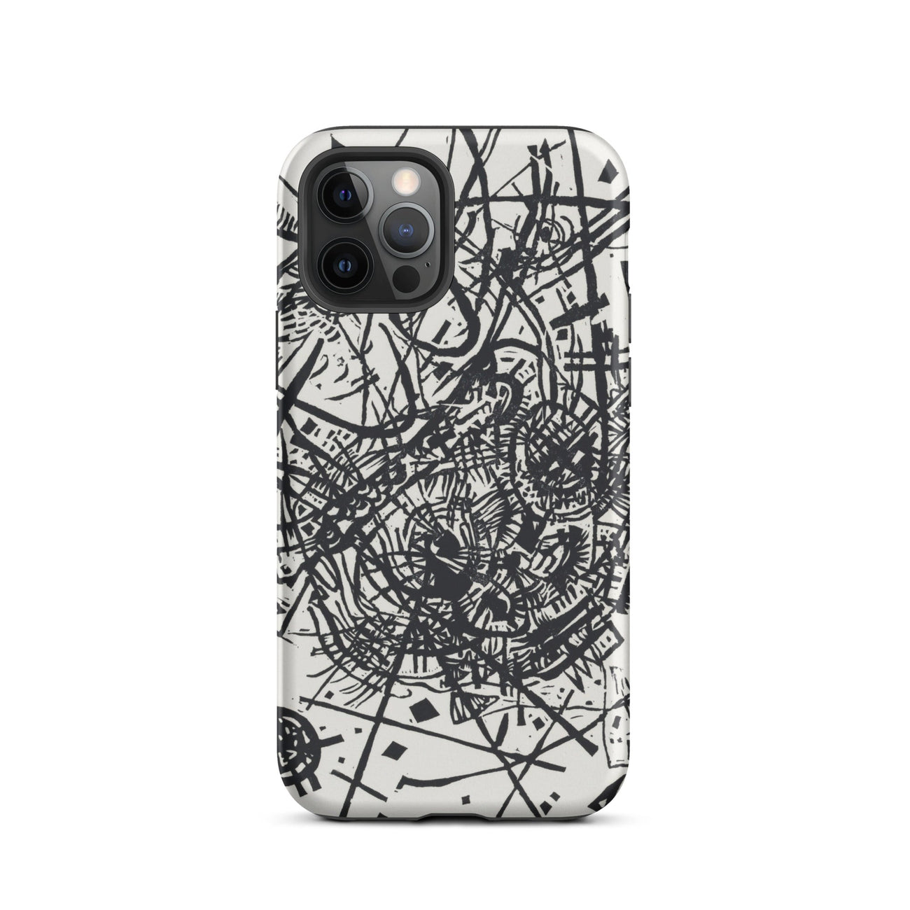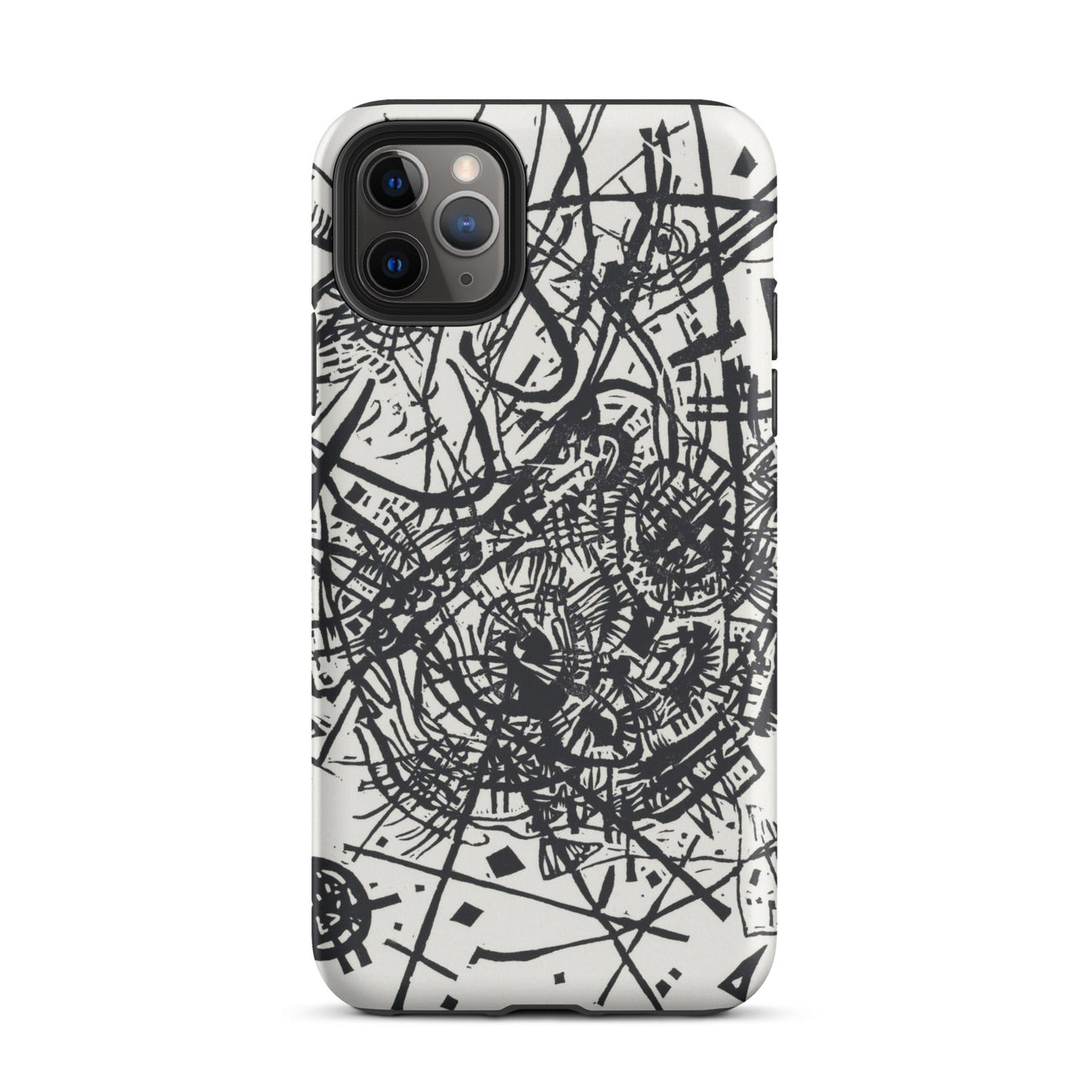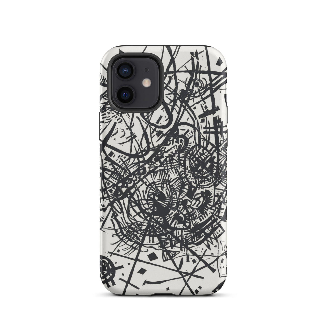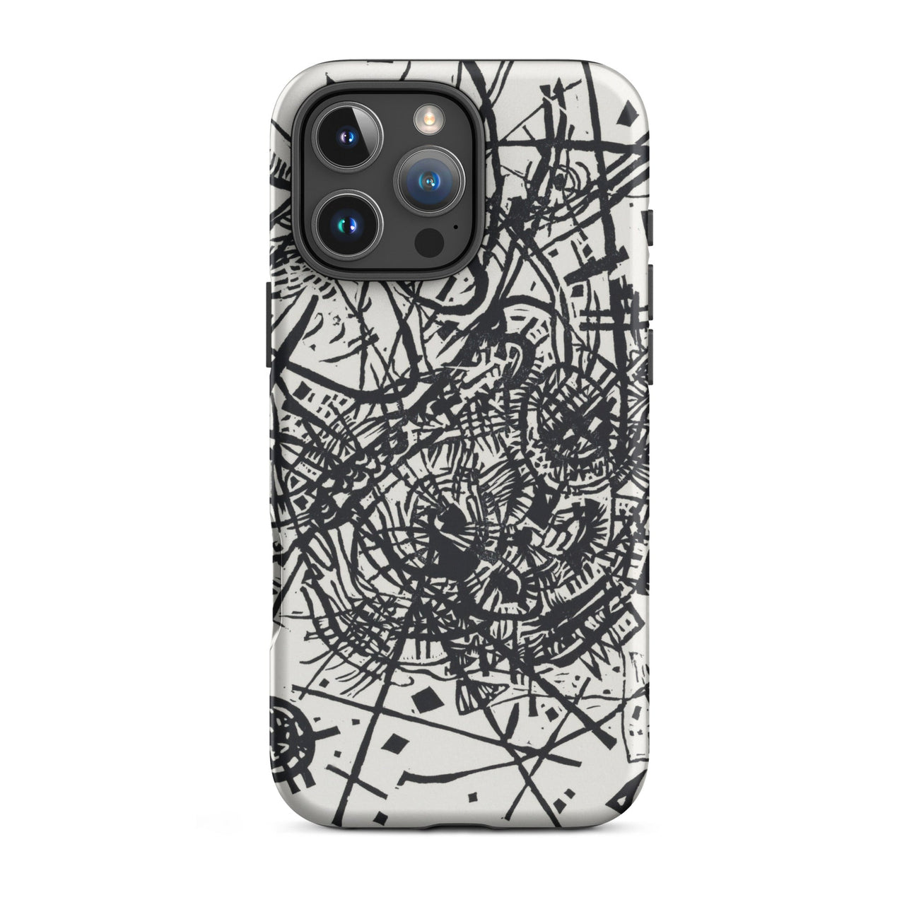 Keine Schwerkraft. Nur Wirbel. In Kleine Welten VIII zeichnete Wassily Kandinsky Satelliten der Absicht, die sich in heftiger Uneinigkeit drehten. Diese iPhone-Hülle wird zu einem Feld unausgesprochener Physik—wo Linie weder Messung noch Stimmung ist, sondern Bruch. Spiralen zerbrechen in Radarschreie. Striche schneiden durch den Raum wie mathematische Verletzungen.