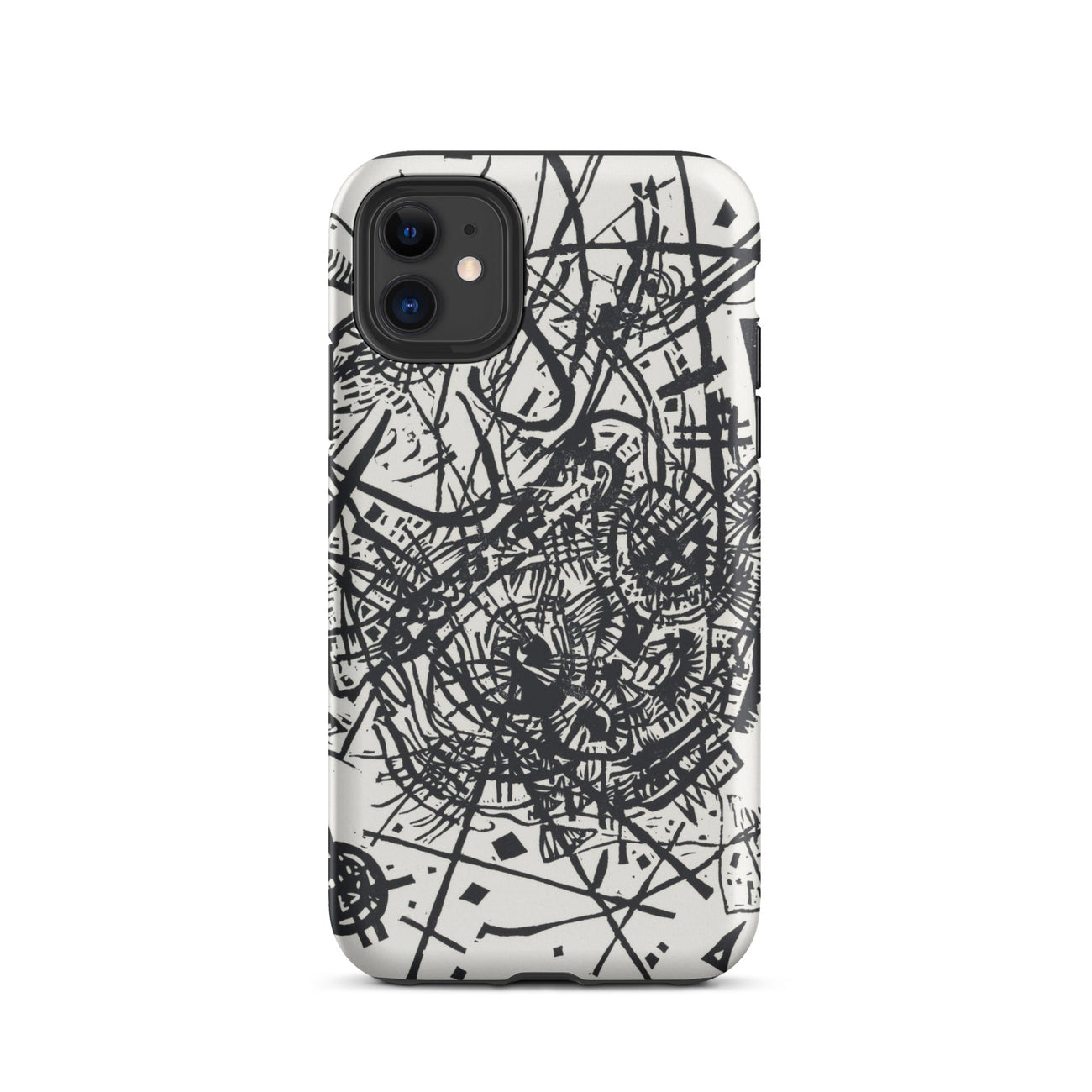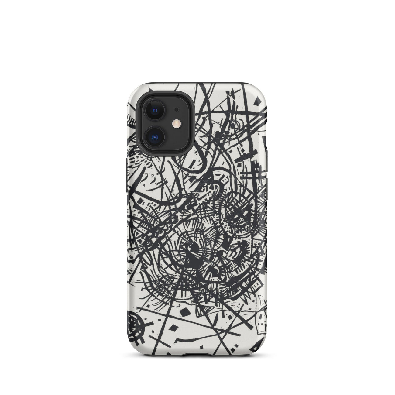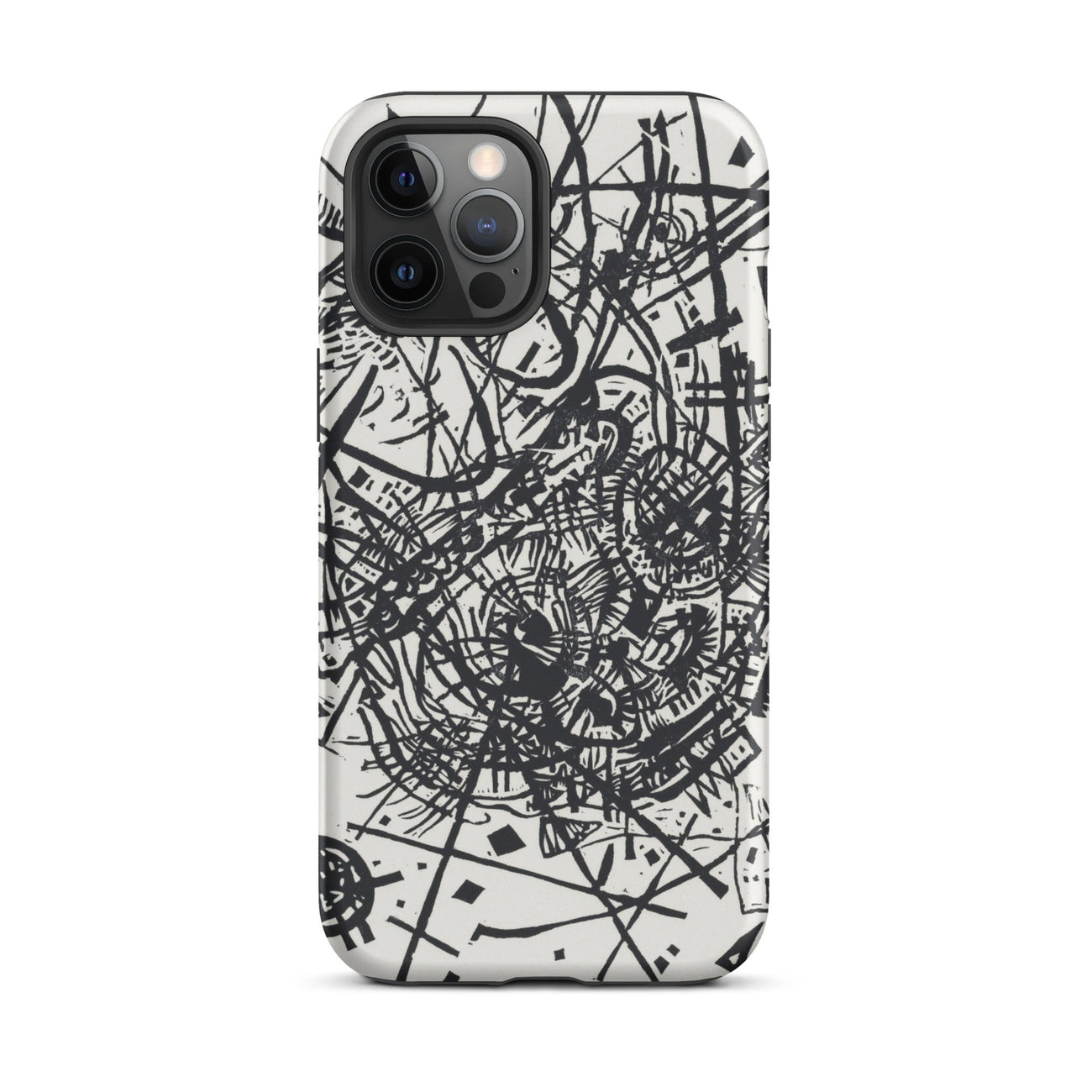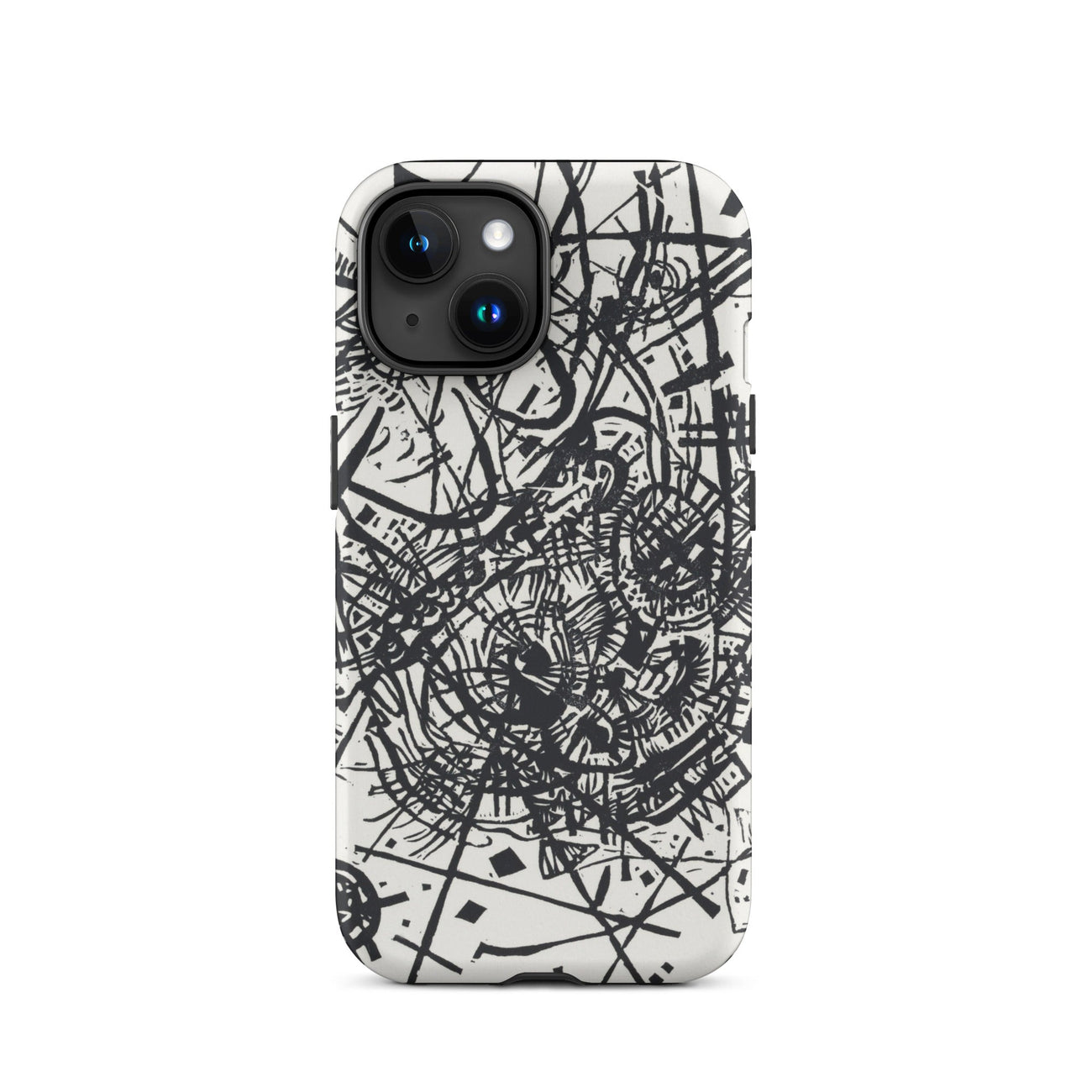 Keine Schwerkraft. Nur Wirbel. In Kleine Welten VIII zeichnete Wassily Kandinsky Satelliten der Absicht, die sich in heftiger Uneinigkeit drehten. Diese iPhone-Hülle wird zu einem Feld unausgesprochener Physik—wo Linie weder Messung noch Stimmung ist, sondern Bruch. Spiralen zerbrechen in Radarschreie. Striche schneiden durch den Raum wie mathematische Verletzungen.