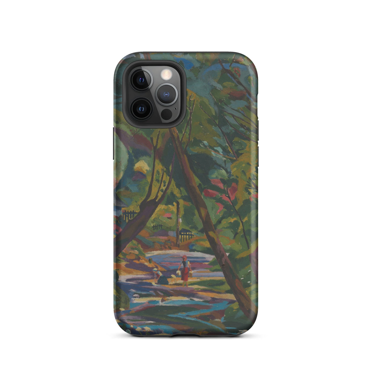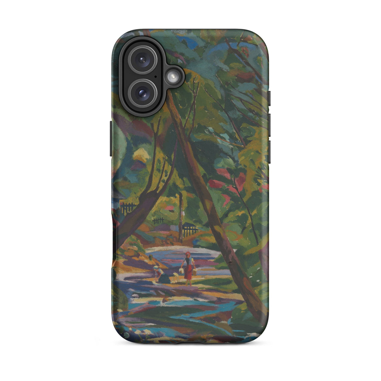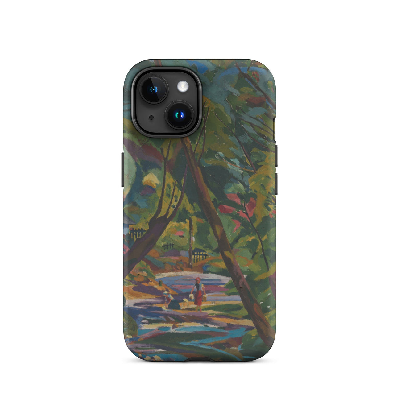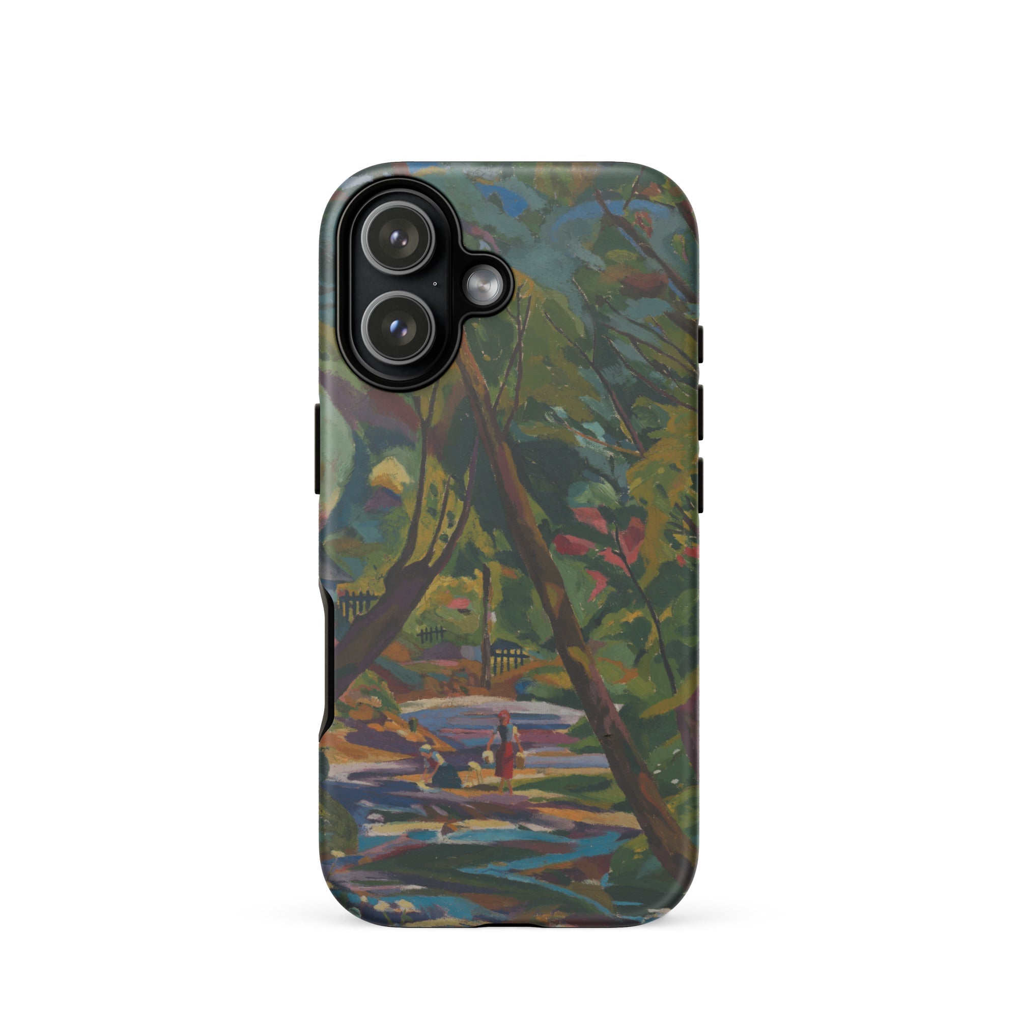 Ein Fluss aus Farbe, ein Wald aus ungezähmtem Rhythmus—Kubinsky Stream von Arnold Peter Weisz-Kubínčan ergießt sich über dieses expressionistische Kunst iPhone-Case wie ein halb erinnerter Traum. Üppige Schatten pulsieren vor Energie, durchzogen von kräftigen Rottönen, gebrochenem Gold und dem kühlen Rauschen eines sich windenden Baches. Figuren verweilen am Wasserufer, flüchtig und doch ewig, als wären sie im flackernden Licht einer verlorenen Welt gefangen.