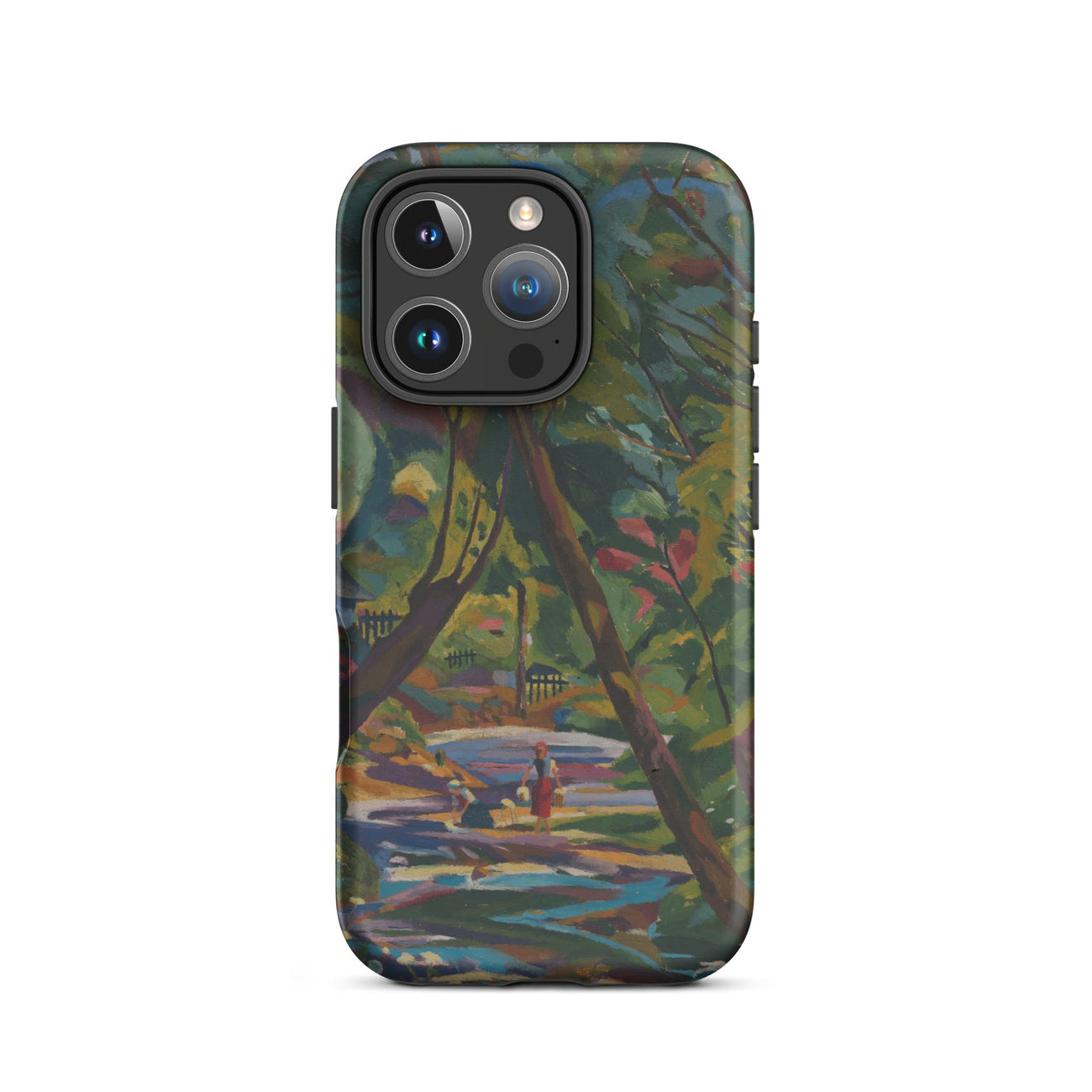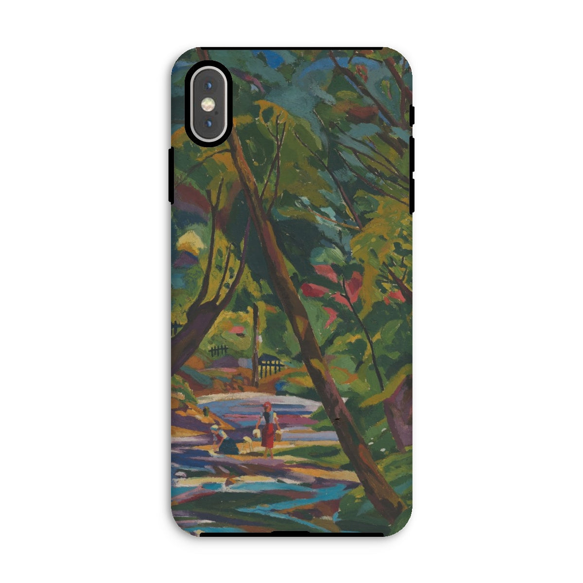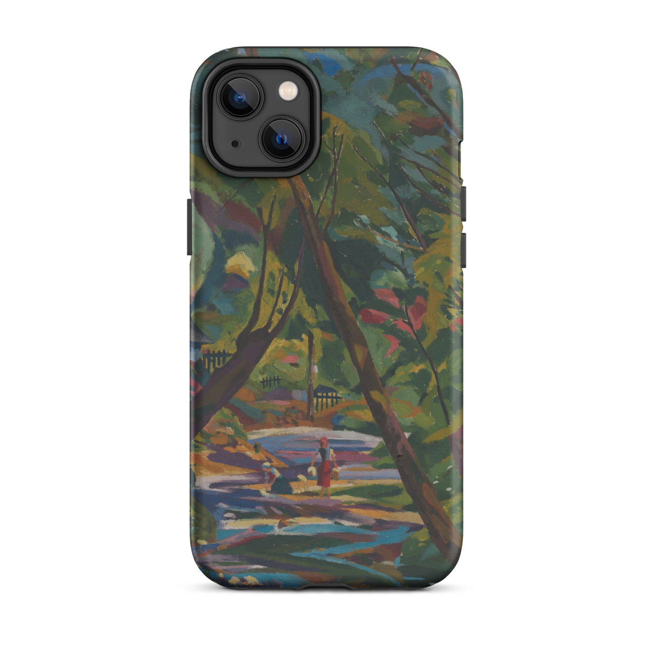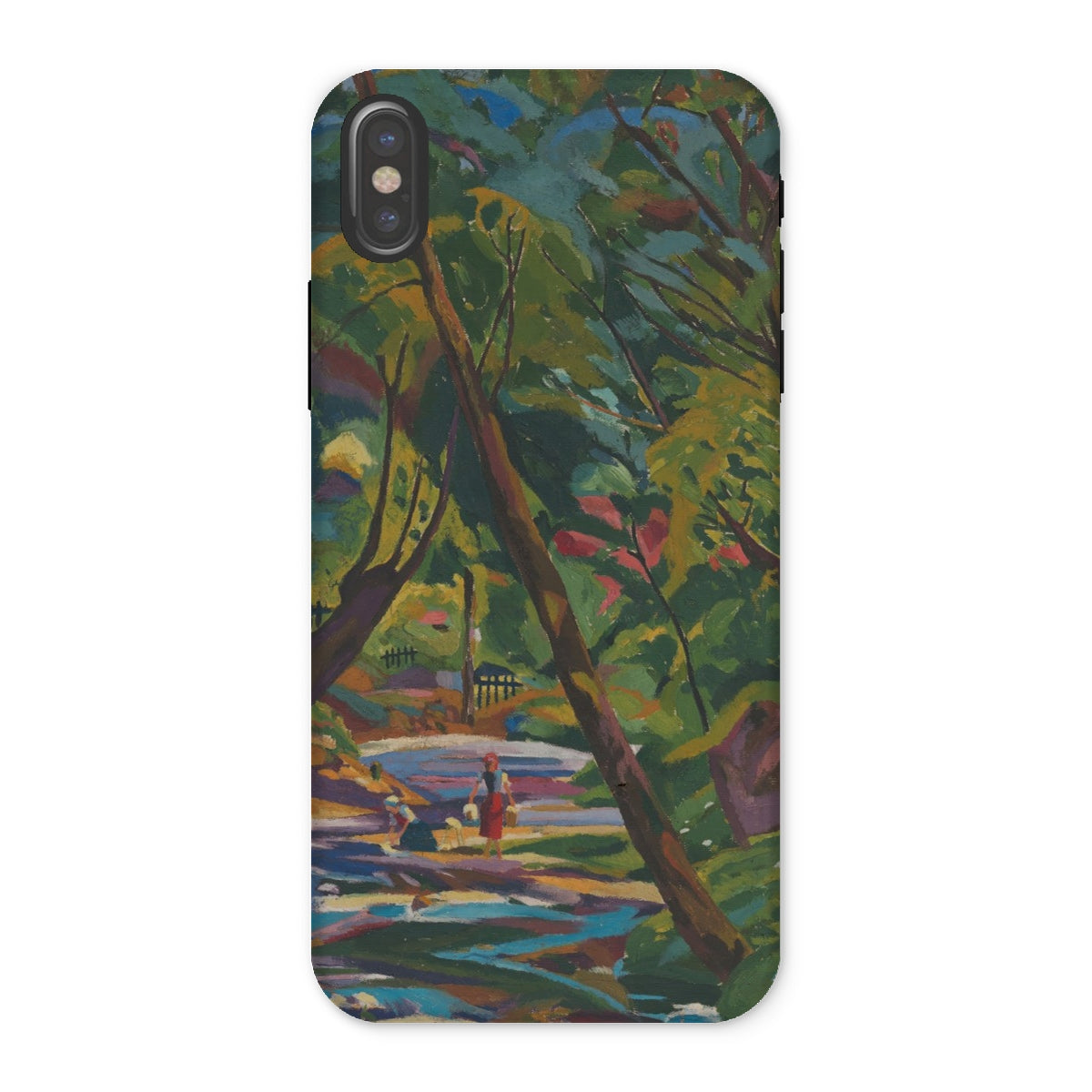 Ein Fluss aus Farbe, ein Wald aus ungezähmtem Rhythmus—Kubinsky Stream von Arnold Peter Weisz-Kubínčan ergießt sich über dieses expressionistische Kunst iPhone-Case wie ein halb erinnerter Traum. Üppige Schatten pulsieren vor Energie, durchzogen von kräftigen Rottönen, gebrochenem Gold und dem kühlen Rauschen eines sich windenden Baches. Figuren verweilen am Wasserufer, flüchtig und doch ewig, als wären sie im flackernden Licht einer verlorenen Welt gefangen.