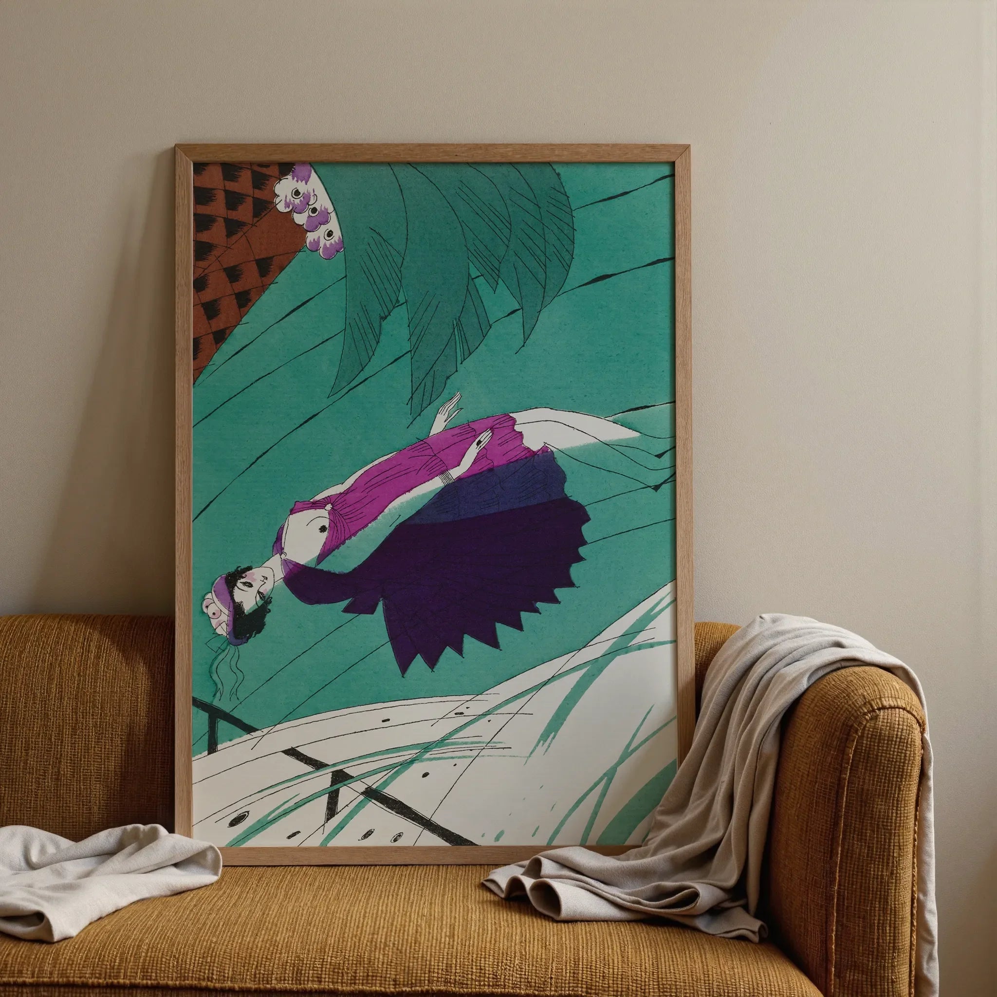 Martins kubistisch inspirierte Linien schnitzen eine Szene exquisiter Melancholie - eine liegende Figur in lebendiger Fuchsia und tiefviolettem, ausgebreitet über a Meer von blaugrün. Die Winkelformen und die kühne Farbe kontrastieren die künstlerische Revolution der zwanziger Jahre. Sie werden Ihren Blick auf die mysteriösen weißen Blüten angezogen finden, die von oben spähten, ein Symbol der Hoffnung inmitten der emotionalen Intensität des Tableaus.