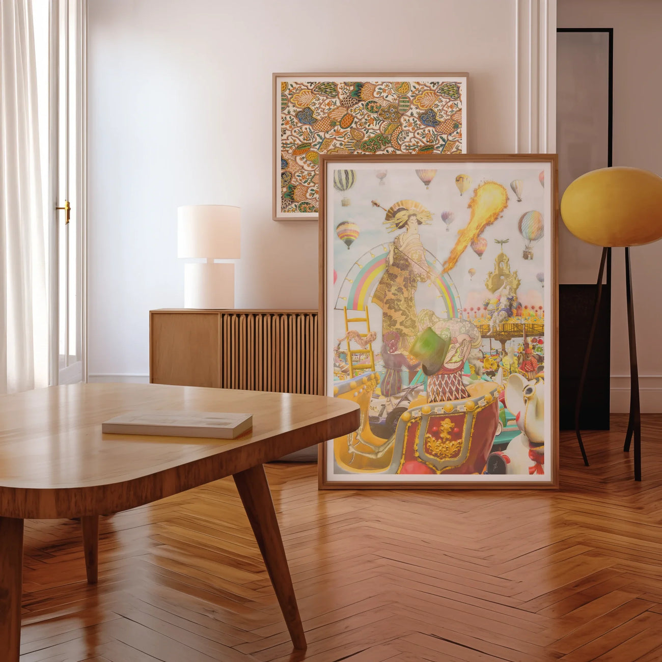 Diese neo-surrealistische Collage zerschmettert den vergoldeten Käfig von Orientalist Fantasie. Ein feuriger Komet fließt über den Pastellhimmel und symbolisiert Madame Fireflys triumphale Neuerfindung. Lassen Sie diese Reproduktion in Museumsqualität Ihre Mauern in ein Portal verwandeln, in dem East in einer aufrührerischen Feier der Selbstbestimmung nach Westen trifft.