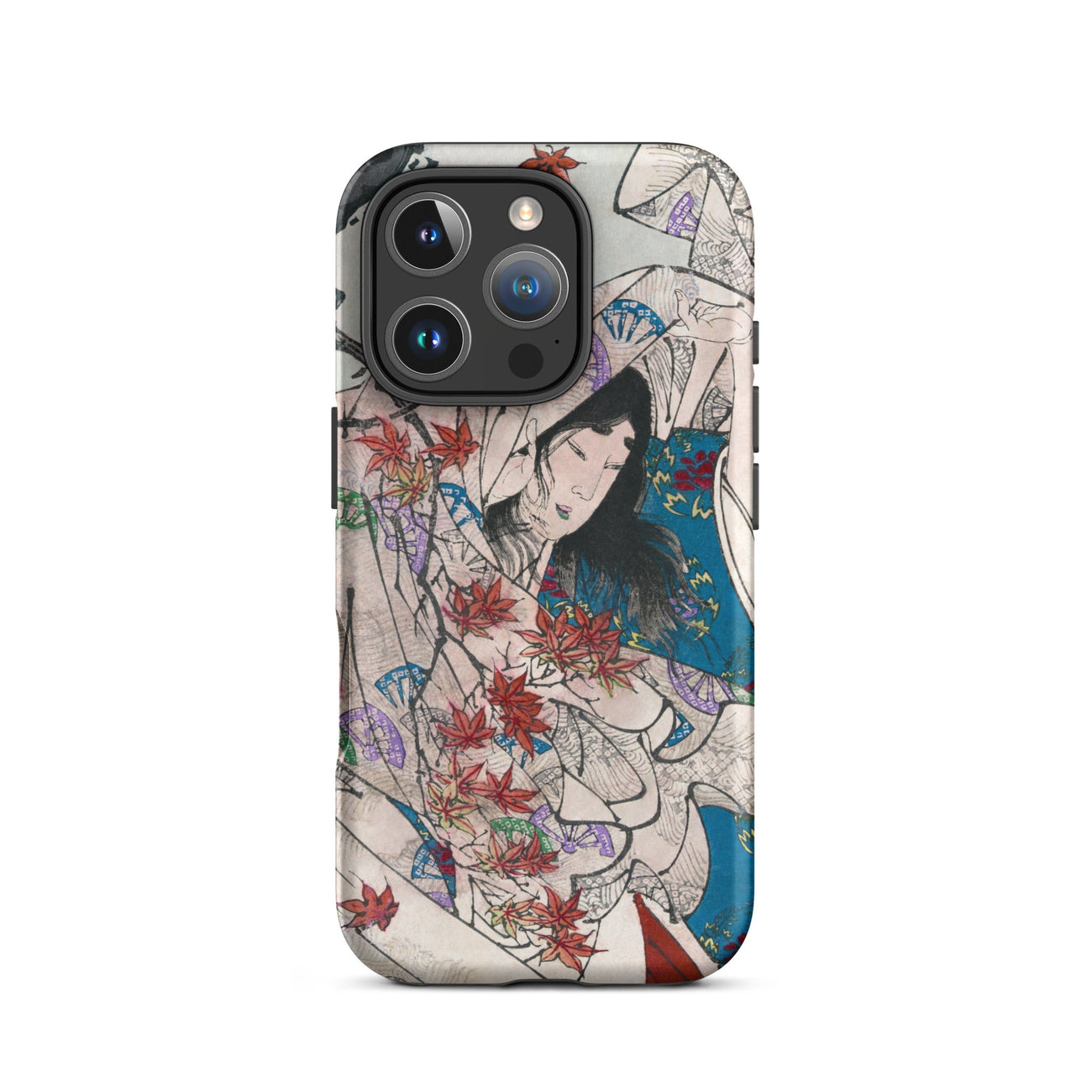 Dieser Ukiyo-e-Traum von Taiso Yoshitoshi—verwirrt mit herbstlichem Ahorn und zeremoniellen Fächern—blüht auf Ihrem iPhone wie eine geflüsterte Erinnerung an Heian-Hofpoesie. Jetzt wird diese Edo-Periode Träumerei zur Rüstung: vergänglich, elegant, mit Mythen gesäumt. Ihr Gerät schützend in einer Saison der Stille, wo der Fluss der Zeit durch bemalten Stoff und lackierten Schatten verlangsamt wird.