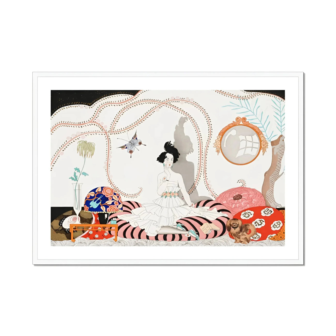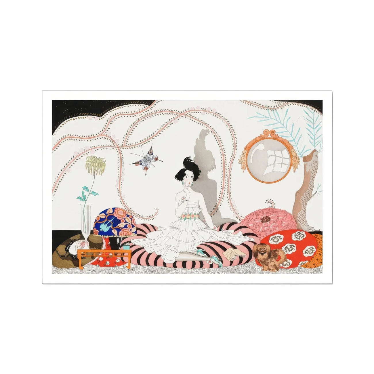 Dieser Druck ist nicht nur Kunst; er ist ein Portal in die wilden Zwanziger, das die Dekadenz, Mode und Lebensfreude der Ära einfängt. Barbiers Beherrschung der Pochoir-Technik erweckt jedes Element zum Leben, von der subtilen Schattierung der Haut der Frau bis zu den komplizierten Mustern, die die Möbel zieren. Besitzen Sie ein Stück Art-Deco-Geschichte und tauchen Sie ein in den Glamour des Paris der 1920er Jahre.