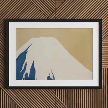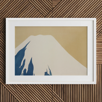 Stark White Snow krönt den Berg, seine makellosen Pisten für blaue Schatten, die wie Kalligraphie -Striche tanzen. Der Ocker -Himmel flüstert von Dawns goldener Stunde und stellt Fujis Majestät in ruhiger Einfachheit. SekkaDie Brillanz in der Meiji-Ära strahlt durch minimalistisches Design und verwandelt den heiligen Berg Japans in eine Untersuchung von Form und negativem Raum.