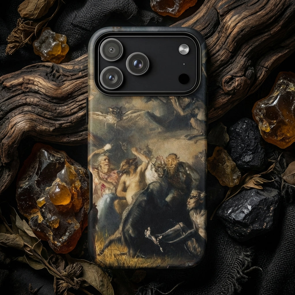 Ein Sturm von Figuren windet sich über dieses iPhone-Case, wo Pryanishnikov Hexen, gehörnte Bestien und schattige Reiter in infernalischem Jubel inszeniert. Fackeln lodern auf, Fledermäuse ziehen über den Himmel, Körper verdrehen sich in grotesker Erhebung.