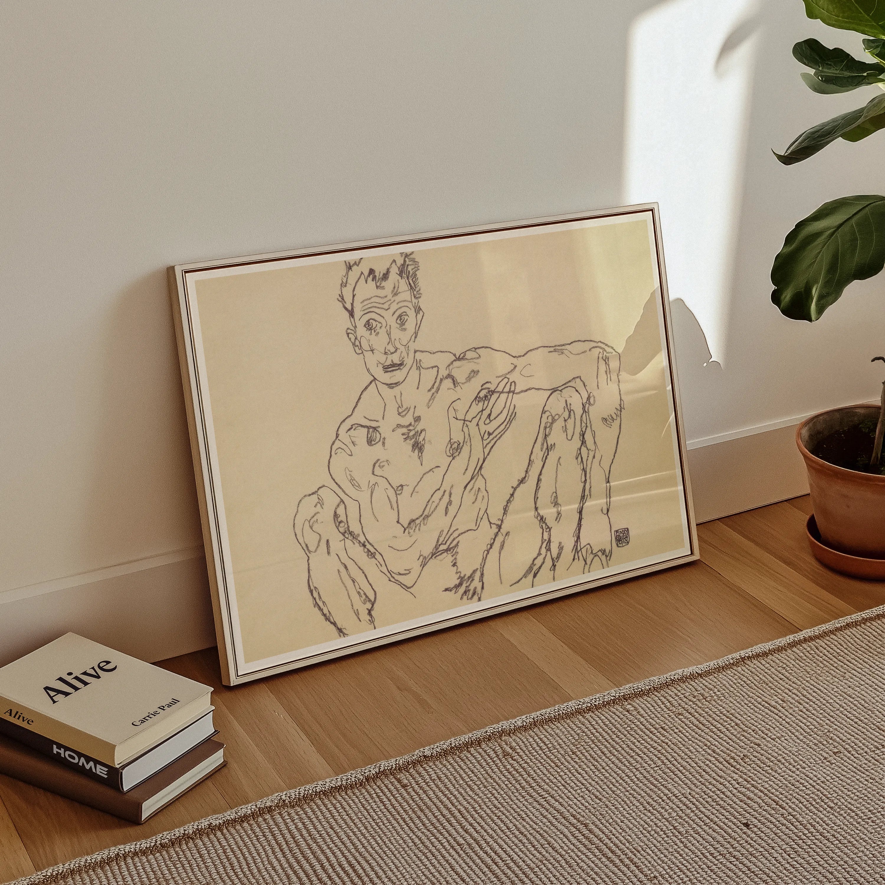 Das Fleisch ist zerkratzt, nicht geformt. Gliedmaßen winden sich in eine Geometrie des Voyeurismus, Buße geschärft zum Stil. Die Augen filmen deinen Blick im Gegenzug. Und Schiele zeichnet sich selbst als Verkörperung des Bruchs: nicht Mann, nicht Märtyrer, sondern Artefakt erotischer Fraktur. Es ist ein Porträt männlicher Erregung - heidnisch, punkig, unbußfertig. Fleisch kartiert wie ein Fiebertraum am Rande seines eigenen Untergangs.