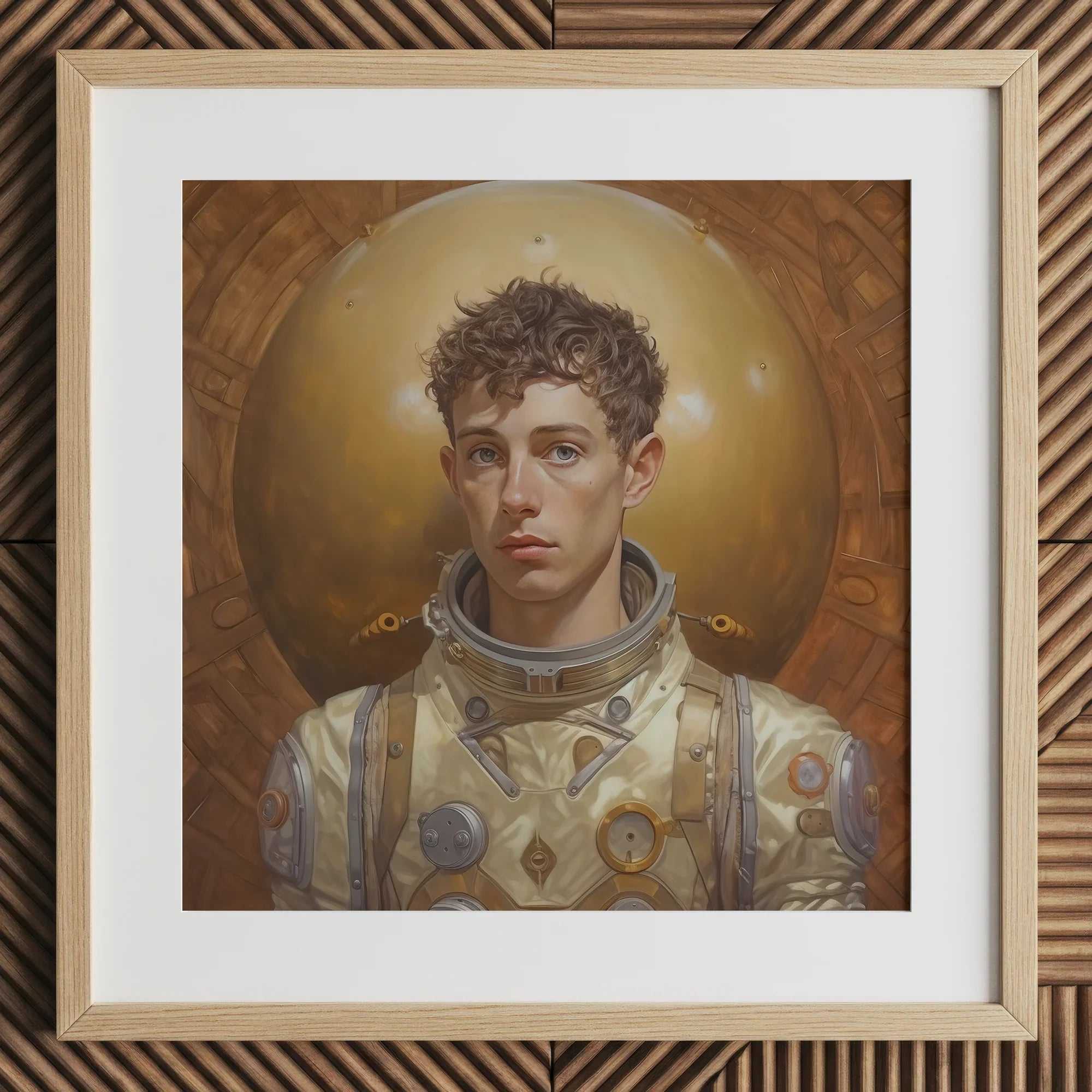 Noah treibt in der weiten Stille des Weltraums, ein einsamer Reisender, gehüllt in die vergoldete Umarmung seines Astronautenanzugs. Das polierte Messing seines Helms glänzt wie ein antikes himmlisches Relikt und spiegelt Konstellationen wider, die Träumern seit Jahrtausenden zuflüstern. Er ist mehr als ein gutaussehender schwuler Astronaut; er ist ein kosmischer Pionier, ein queerer Raumfahrer, der seinen Platz unter den Sternen einnimmt. Ein Reisender nicht nur durch Galaxien, sondern auch durch Identität, Zugehörigkeit und die unendliche Grenze der Selbstentdeckung.