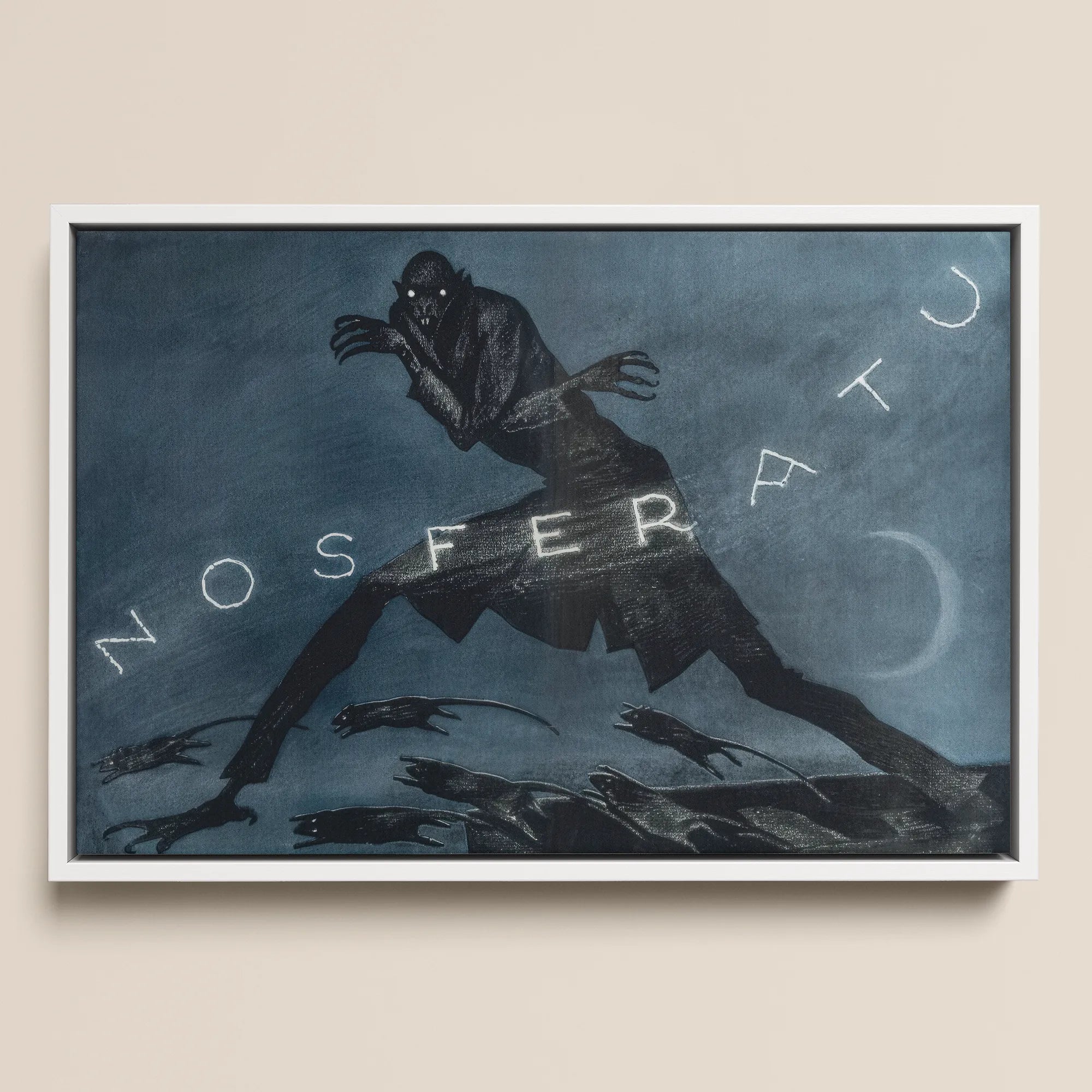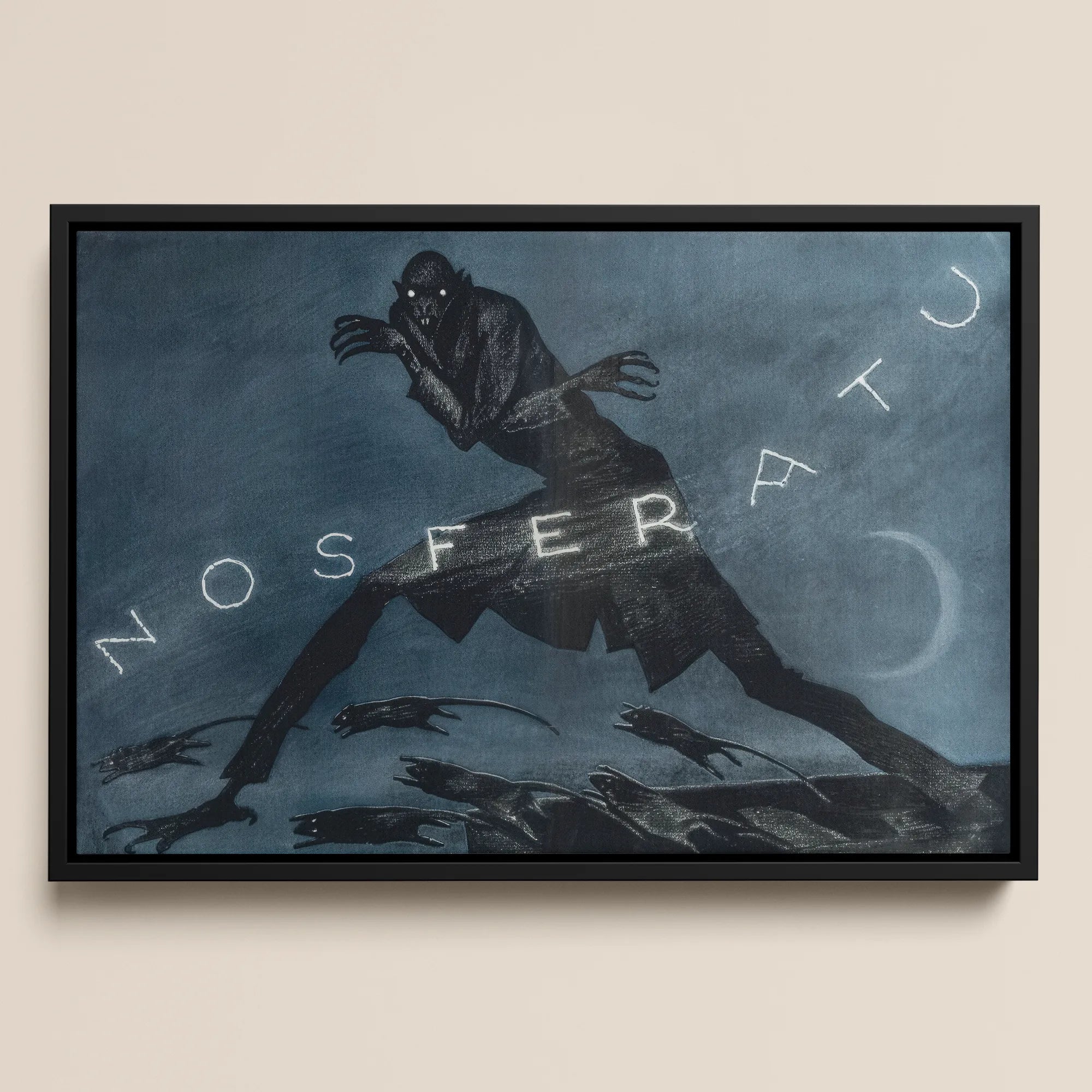 Er schreitet voran wie eine Kompassnadel, die zum Verfall gebogen ist, mit weit gespannten Beinen, kurz geschnappter Mantel, Krallen, die die Luft durchschneiden. Das Wort NOSFERATU schwebt diagonal über ihm, pudrig und gebrochen, als wäre es in die Emulsion geätzt. Mondsichel rechts, niedrig und dünn. Ein Gewebe von Ratten zieht sich entlang seines Weges.