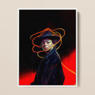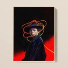 Die Welt biegt sich, wo sie stehen, sie biegt sich, weil sie es so wollen. Ihr Mantel, schwarz wie ein kollabierter Stern, verschluckt das Leuchten, doch das Licht weigert sich, verschlungen zu werden. Es windet sich um ihren Hut wie eine geflüsterte Beschwörung, umschlingt ihren Hals wie ein ungebrochenes Gelübde. Tiefes Rot ergießt sich hinter ihnen—ein Riss, eine Schwelle, die letzte Glut vor dem Abgrund.