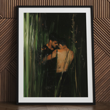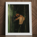 Neo-romantische Leidenschaft trifft auf filmische Beleuchtung, eine zarte Begegnung, die von Laub verdeckt, aber dennoch in ihrer Präsenz stark ist. Das Paradies ist hier nicht fern. Es erscheint als homoerotischer Blick, der sich weigert zu verblassen, gehalten in Schilfrohren und atemwarmer Beleuchtung.
