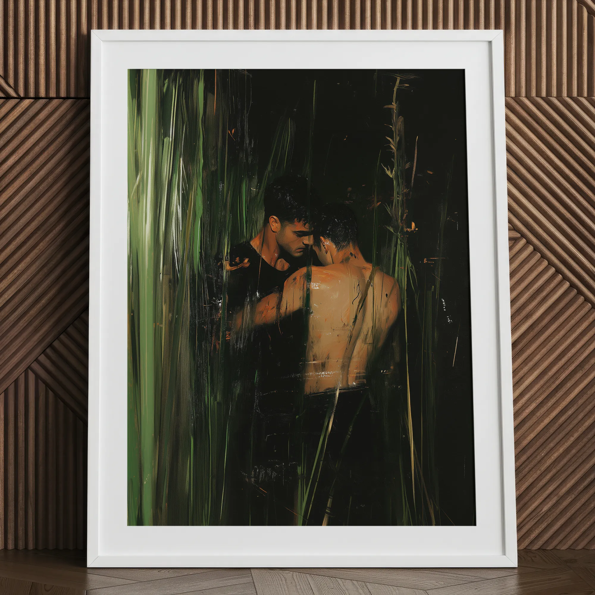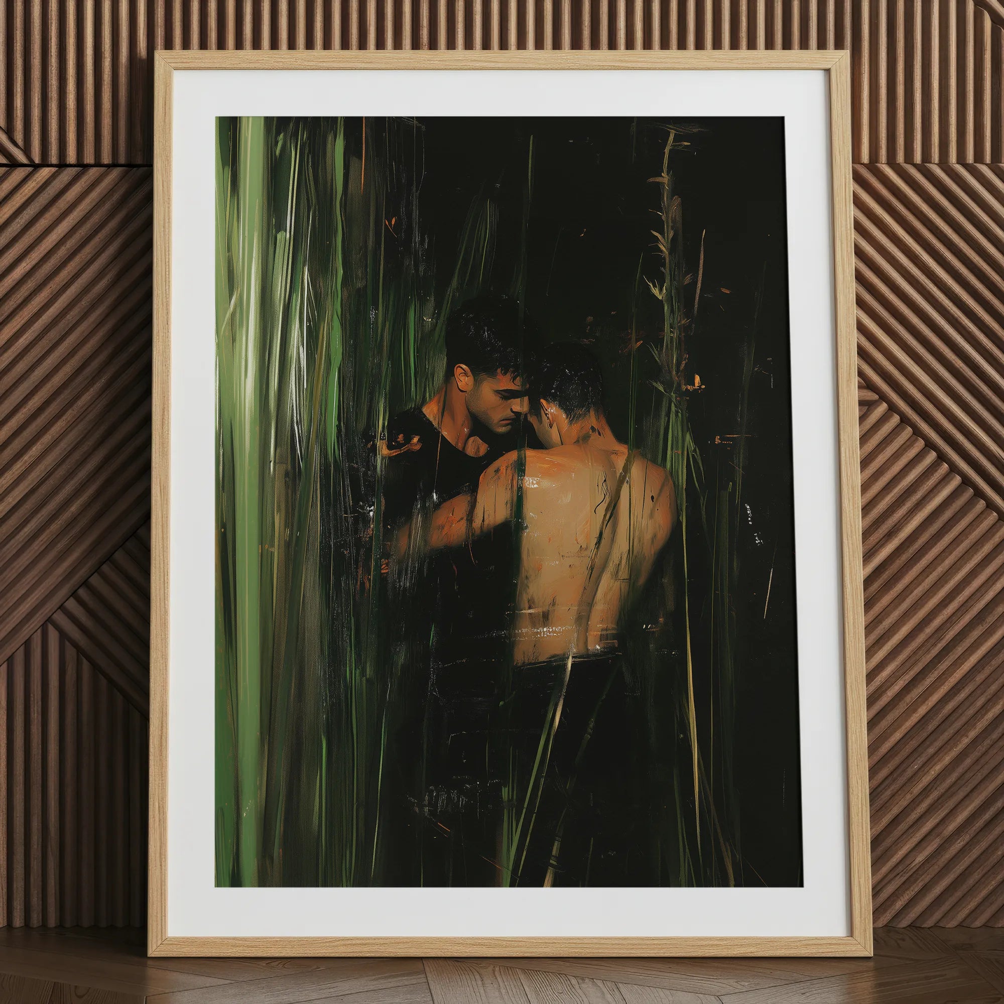 Mondbeschienene Schilfrohre versiegeln die Welt zu einem unaufhörlichen Summen, und zwei Männer lehnen sich wie ein Gelübde aneinander. Kupferne Highlights streifen siennafarbene Haut, während die onyxfarbene Nacht den Rest umhüllt. Viridianblätter flackern mit Saftgrün und Olive, jeder Strich ein Pinselzug, jeder Kratzer eine Palettenmesserspur.