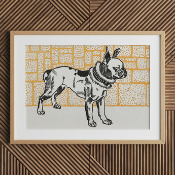 Jungs Pitbull Terrier wird Wache an Ihren Wänden stehen, ein kühner Wächter der grafischen Kunst des frühen 20. Jahrhunderts. Dieser Druck fängt die muskulöse Form der Rasse mit scharfen monochromen Strichen vor einer pulsierenden goldenen Stadtsilhouette ein. Voller roher Energie des entfesselten Modernismus in Hundegestalt, wo Stärke in jeder Linie auf Loyalität trifft.