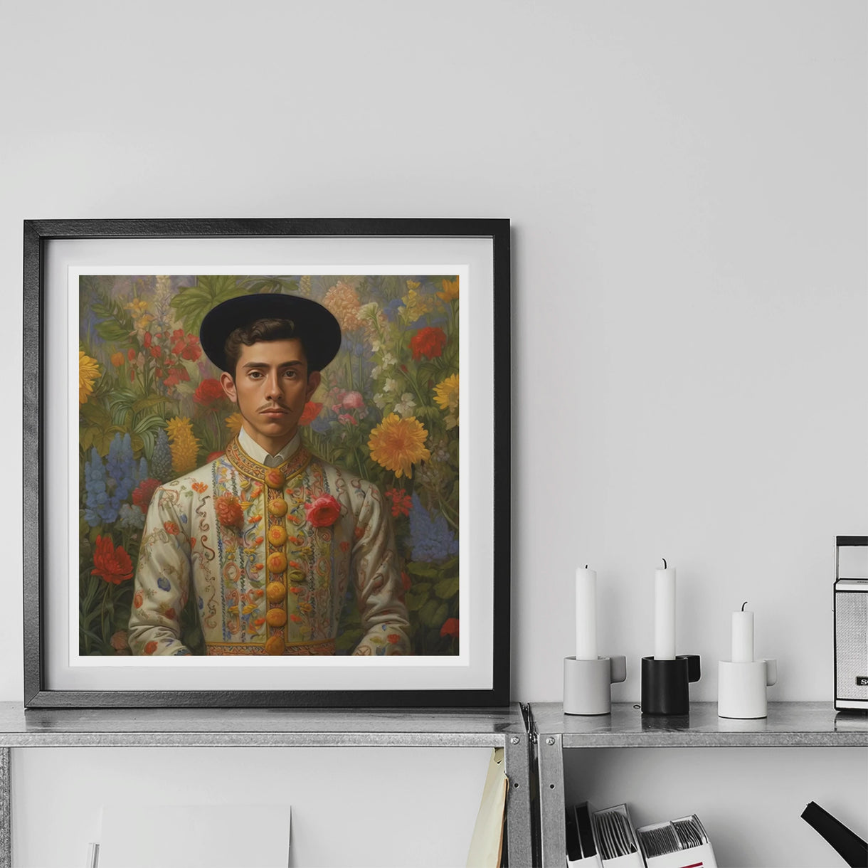 Hänge ihn an deine Wand, und Bernardino ist kein bloßer Prinz—er ist ein Souverän vergessener schwuler Abstammungslinien, ein mestizischer queerer Monarch, dessen Krone nicht aus Gold besteht, sondern aus jeder ungezähmten Blüte, die sich weigert zu verwelken.
