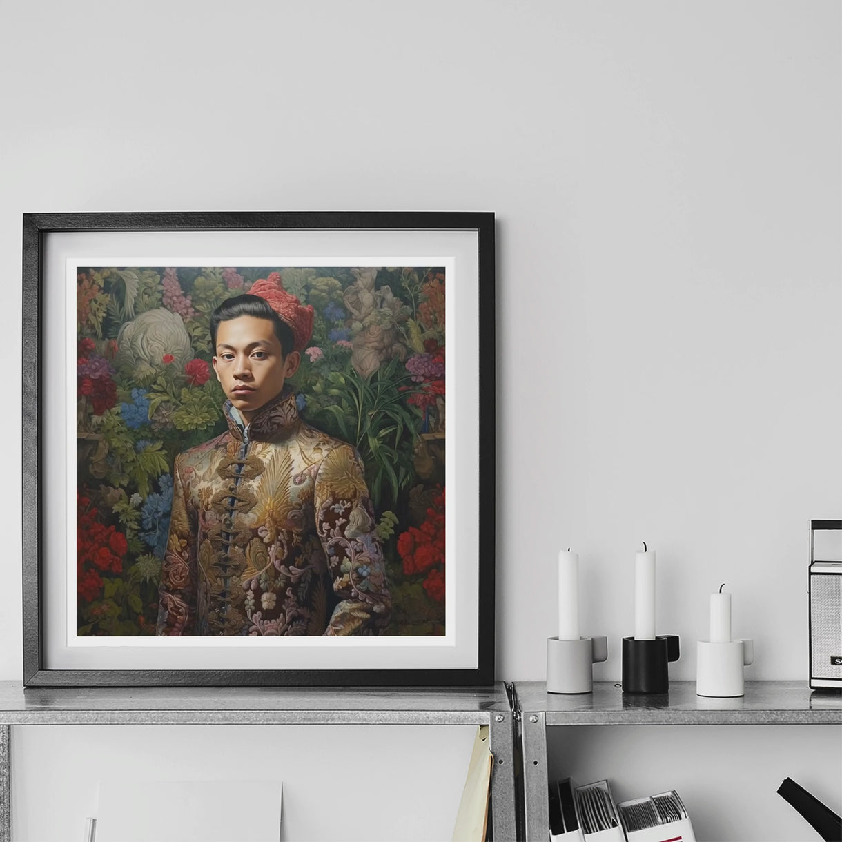 Eine Chada-Krone, rot wie betelfleckige Lippen, thront auf seinen dunklen Wellen—ein Diadem des Trotzes, ein Relikt von Khon-Tänzern, die einst ihre Wahrheiten hinter bemalter Göttlichkeit verbargen. Sein Blick ist fest, die Art, die Klatsch in Prophezeiung verwandelt, die verweilt wie Weihrauch, der durch Tempelkorridore kräuselt, wo Mönche noch von unsanktionierter, aber unbestreitbarer Liebe flüstern. Irgendwo, jenseits des barocken Überwuchses seines geheimen Gartens, summt ein Ranat ek seine langsame, klagende Melodie—ein Requiem für Prinzen, die über die Grenzen der Dynastie hinaus liebten, die keine Erben hinterließen, sondern unendliche Echos.