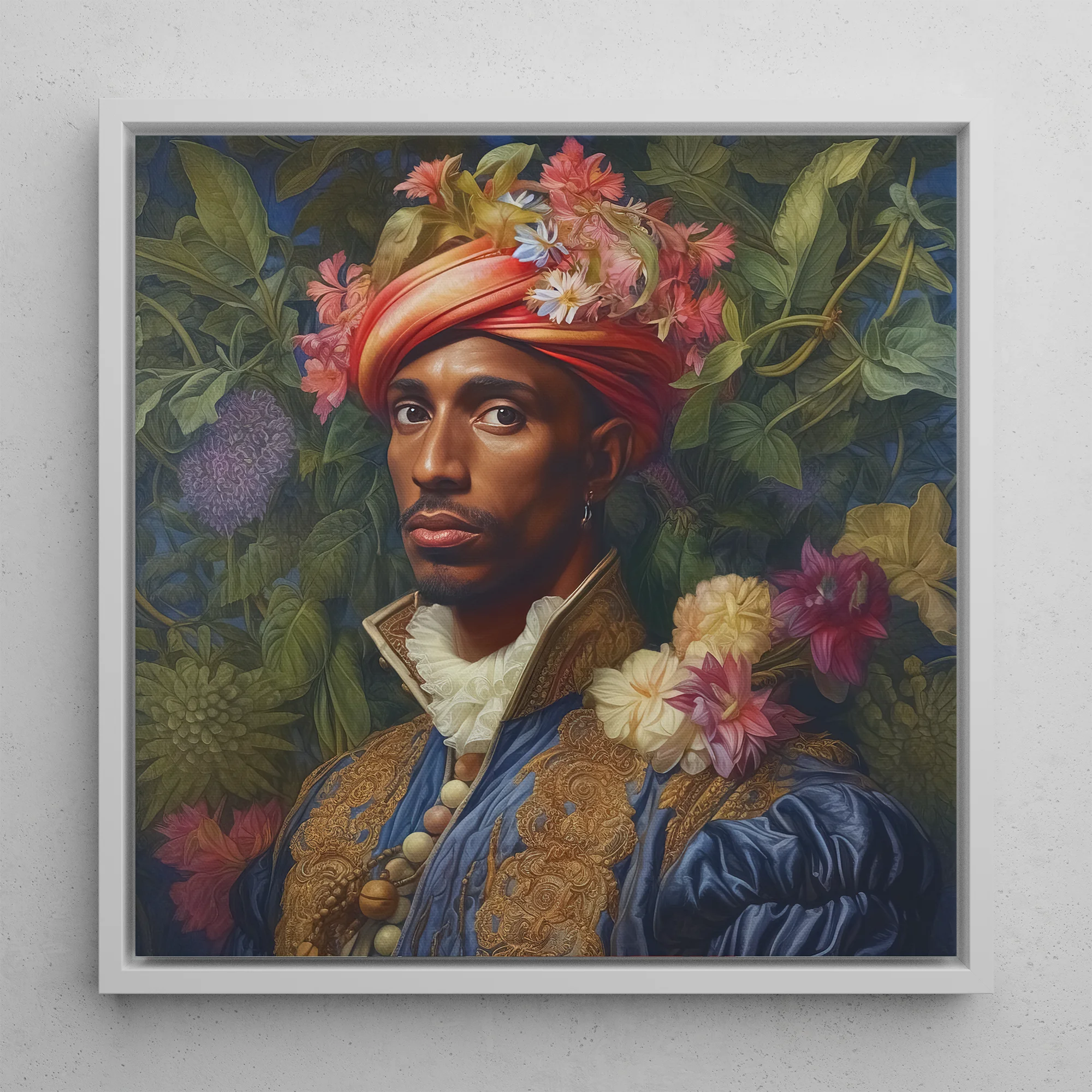 Nicht länger an die Ränder verbannt, verweigert Isaiah die Auslöschung. Sein Porträt steht im Widerspruch zu einer Welt, die versucht hat, Männer wie ihn aus ihren vergoldeten Geschichten zu streichen. Aber hier ist er—ein schwarzer schwuler Prinz, ein Königlicher ohne Monarchie, eine Ikone der barocken queeren Ästhetik, gehüllt in die Echos einer Geschichte, die er zurückerobert hat. Und durch all das hindurch wachsen die Blumen weiter.