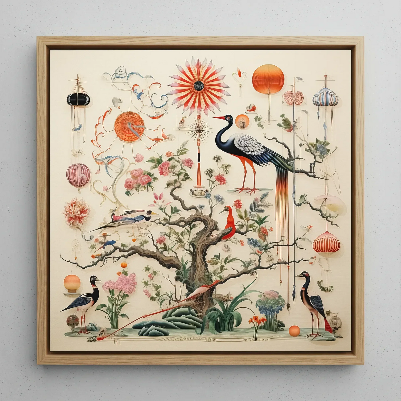 Zwischen seinen Ästen schwebt ein Sternbild aus schwebenden Laternen, zarten Glasgefäßen und botanischen Kuriositäten, die wie Flüstern aus einer anderen Welt flackern. Die Farbpalette—eine Rhapsodie aus Korallenrosa, tiefen Blautönen und leuchtenden Orangen—pulsiert gegen einen pergamentfarbenen Hintergrund und erinnert an ein opulentes Kuriositätenkabinett, das in der Zeit treibt.