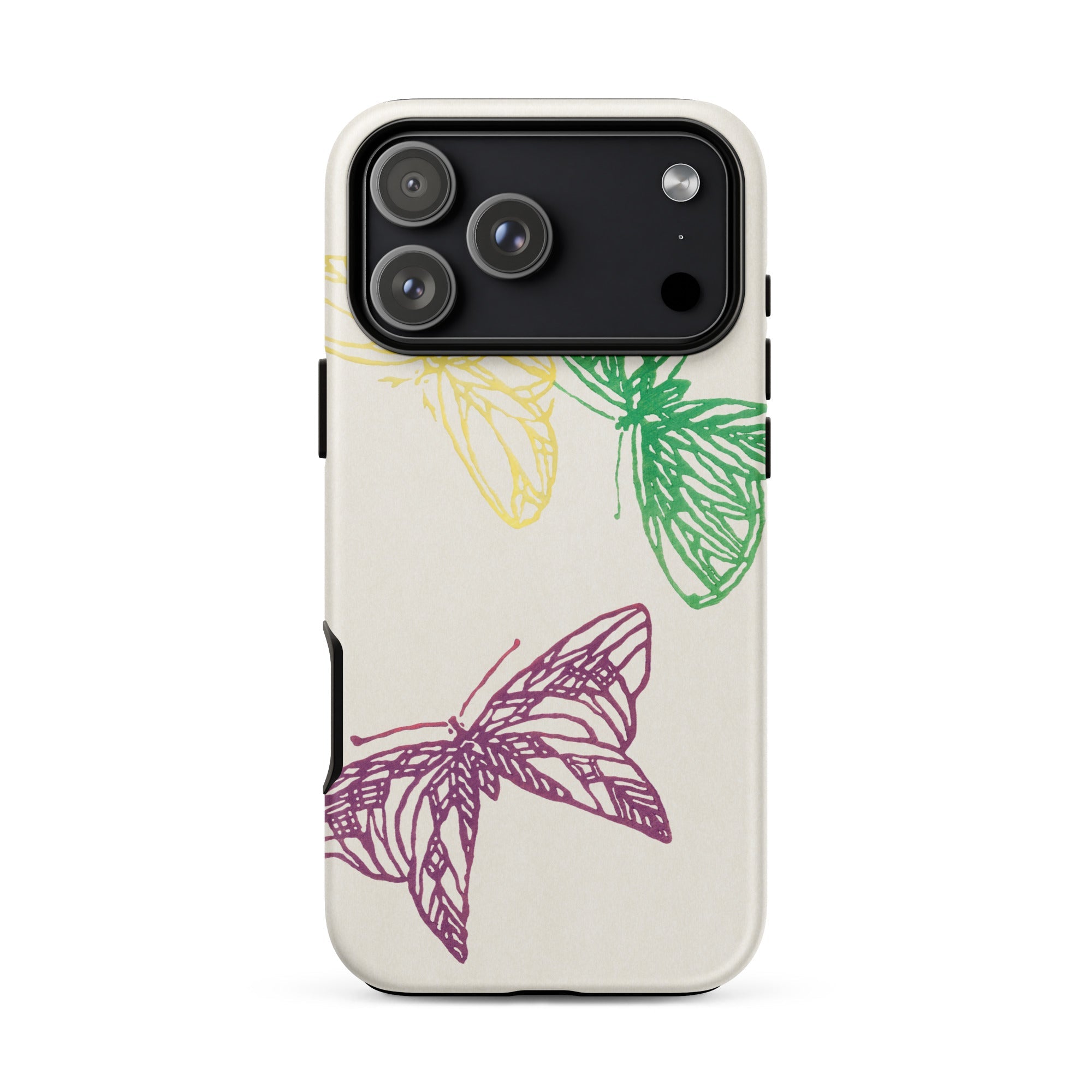 Fein in fließender Einfachheit geätzt, verwandelt Kamisaka Sekkas "Butterflies" ein alltägliches Motiv in eine ruhige Meditation über Form und Farbe. Diese iPhone-Hülle fängt drei Schmetterlinge ein, deren Silhouetten in lebhaften Tönen von Lila, Gelb und Grün dargestellt sind, mit filigranen Linien, die an feine japanische Kalligrafie erinnern. Ihre Flügel, definiert durch schwungvolle, fast tintenpinselartige Striche, scheinen im Flug zu flattern, eingefangen in der minimalistischen Reinheit des leeren Hintergrunds.
