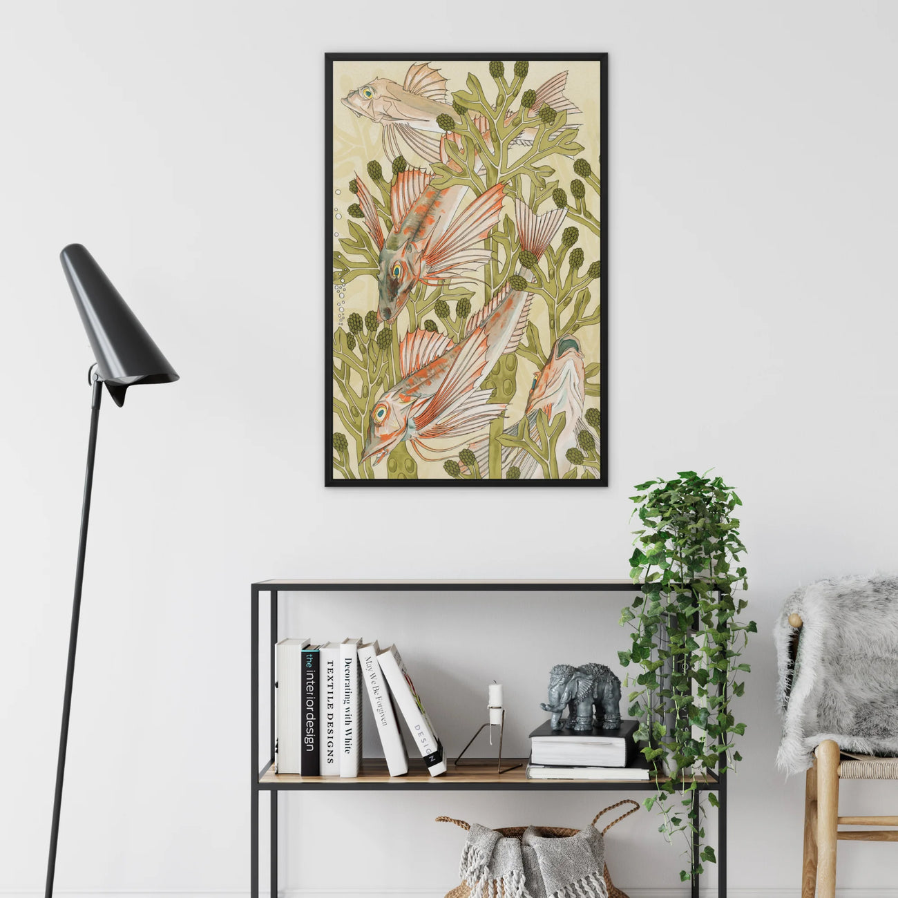 Sie werden von dieser schwebenden gerahmten Leinwand verzaubert sein, die Verneuils "Rouget" in all seiner Art Nouveau-Pracht zeigt. Der schlanke schwarze Rahmen wird das aquatische Ballett des Kunstwerks betonen, in dem stromlinienförmige Fische durch einen Wald aus olivfarbenen Algen gleiten.
