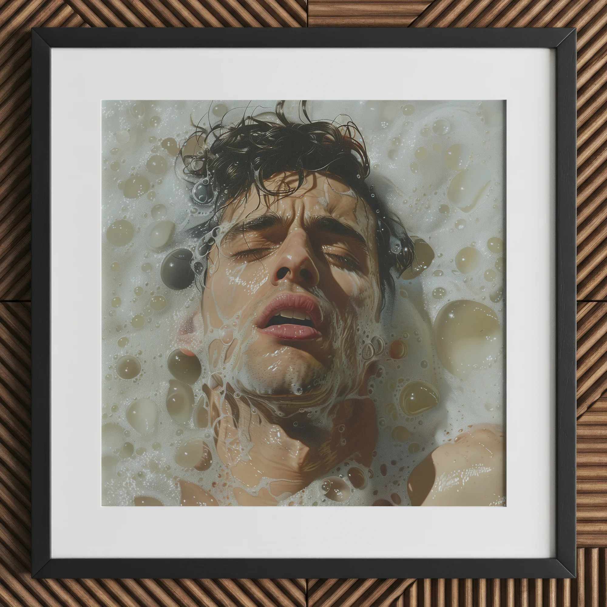 Dies ist nicht nur eine Szene des Eintauchens; es ist eine Reise nach innen, eine Rückkehr zu sich selbst. Der Schaum und die Blasen wirbeln im Rhythmus seines Atems, als würde das Wasser selbst ihn in einer zarten Umarmung halten. Hier, in diesem Schwellenraum, findet er das stille Versprechen der Erneuerung, wo jede Welle ihn näher zur Erleuchtung trägt. Das Gemälde lädt Sie ein, diesen intimen Moment zu erleben, ein Porträt der Gelassenheit und Transformation, eingefangen in exquisiten Details.