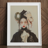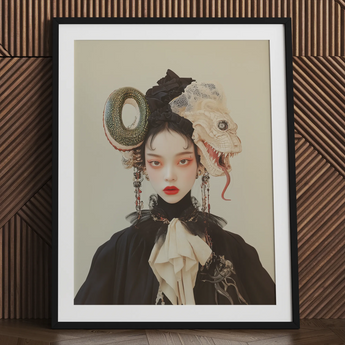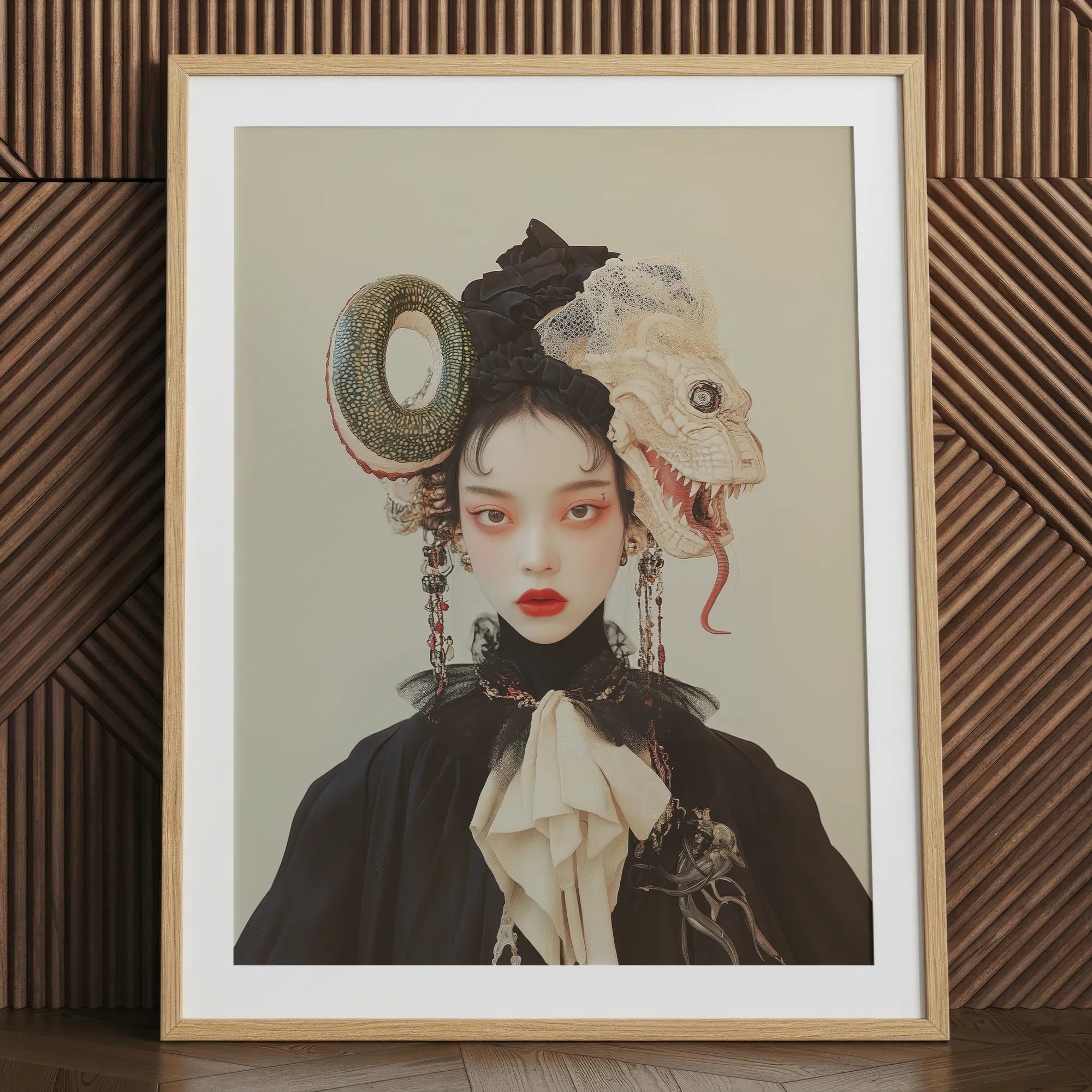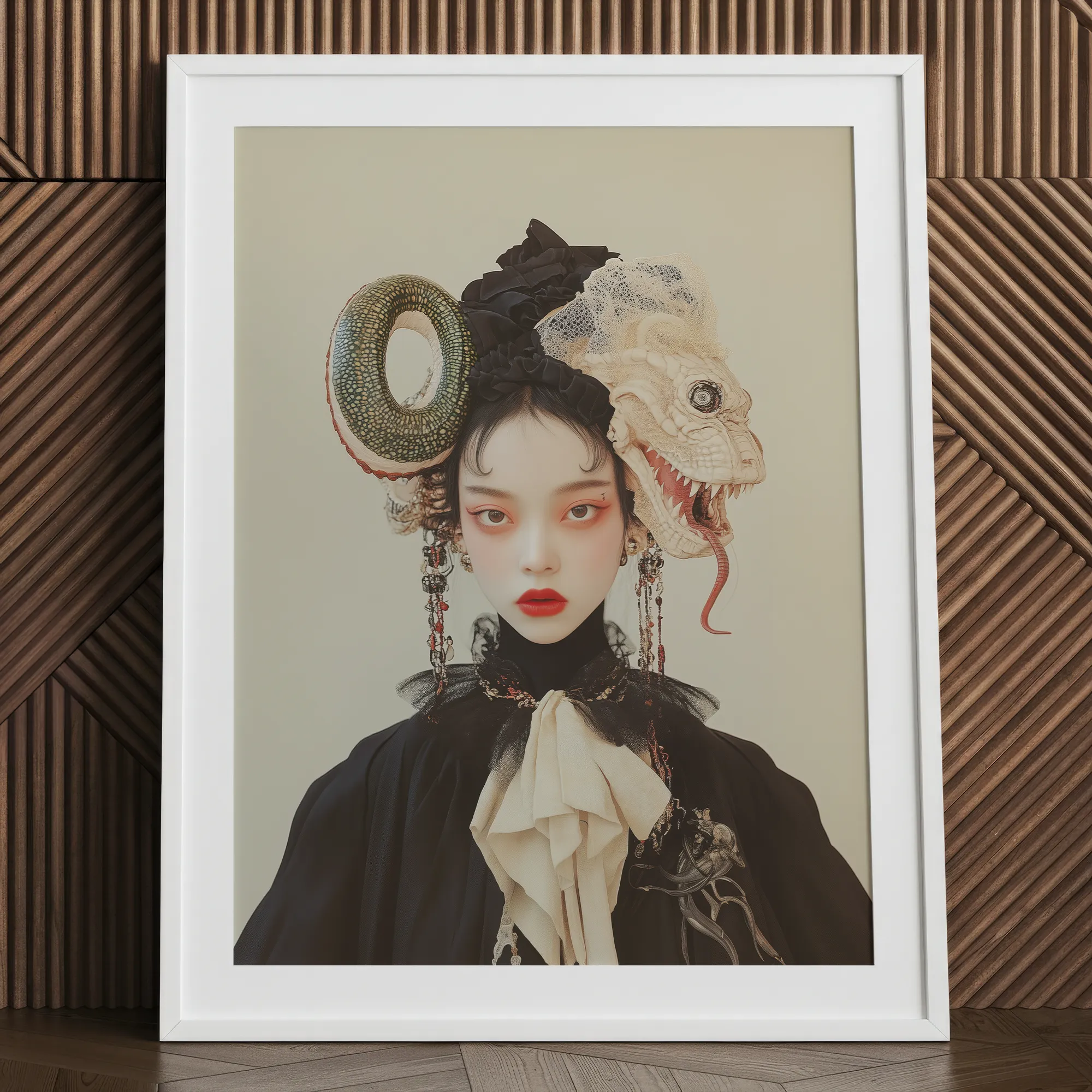 Ryoko steht vor dir, eine ätherische Kraft, die in die Majestät der Antike eingewickelt ist Mythos und queere Rebellion. Ihr Blick durchdringt die Zeit und lädt Sie in eine Welt ein, in der die Grenzen zwischen Schönheit und Terror zusammenbrechen. Die Serpentinenkopfschmuckteile wie lebende Drachen um ihre Haare und ihre Schuppen strahlen vor einer Textur, die so lebendig ist, dass Sie ihre Anwesenheit spüren. Auf ihrem Kopf ruhen sich der Schädel eines besiegten Tieres - kein bloßes Ornament, sondern eine Eroberungskrone, die sie als Herrscher eines Bereichs markiert, der über das Verständnis von Sterblichen hinausgeht.