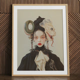Jedes Detail pulsiert mit dem Leben. Ihre fließenden schwarzen Roben, die wie flüssige Nacht drapiert sind, erinnert an eine Eleganz, die sich stark von der schrecklichen Kraft widersetzt, die sie ausübt. Die komplizierte Spitze, die ihren Kopf krönt, ist ein Sprüdung der Zerbrechlichkeit in einer Figur, die ansonsten mit Strom durchnässt wird. Baumelnde Ornamente schwanken wie vergessene Relikte von Tempeln, die bis zur Zeit aufgegeben wurden, jeweils ein Symbol für die unerzählten Geschichten, die sie trägt.