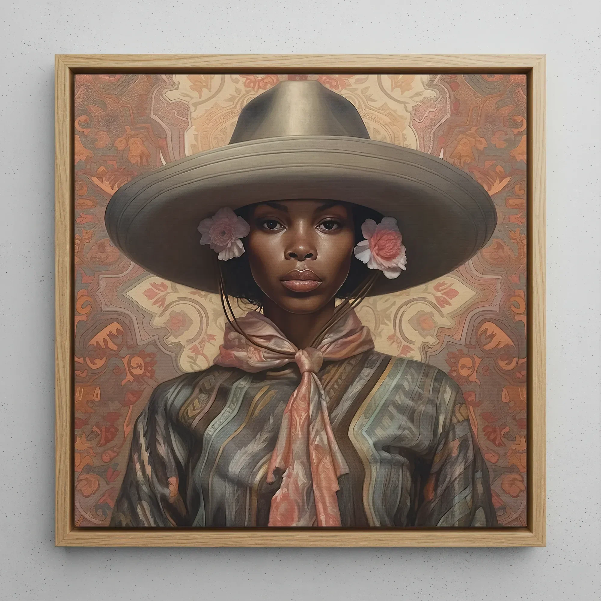 Ihr Poncho hängt über ihren Schultern, gewebt in Mustern, die die Gullah-Traditionen ihrer Verwandten widerspiegeln, die geometrischen Flüstern der Textilkunst der afrikanischen Diaspora in das Gewebe des Westens eingeflochten. Ein verziertes Lederpistolengürtel, schwer mit den Geschichten von Buffalo Soldiers und schwarzen Siedlern, schnürt sich um ihre Taille—schwer mit der stillen Kraft einer Person, die Raum geschaffen hat, wo keiner gegeben wurde. Das Seidenhalstuch an ihrem Hals, dessen Farbe von der kupfernen Glut eines Sonnenaufgangs in San Antonio entlehnt ist, schwingt mit jedem Atemzug—ein Hymnus an die Cowboys, die vor ihr ritten, an die rebellischen Frauen, die das Gesetz herausforderten und heimlich liebten.