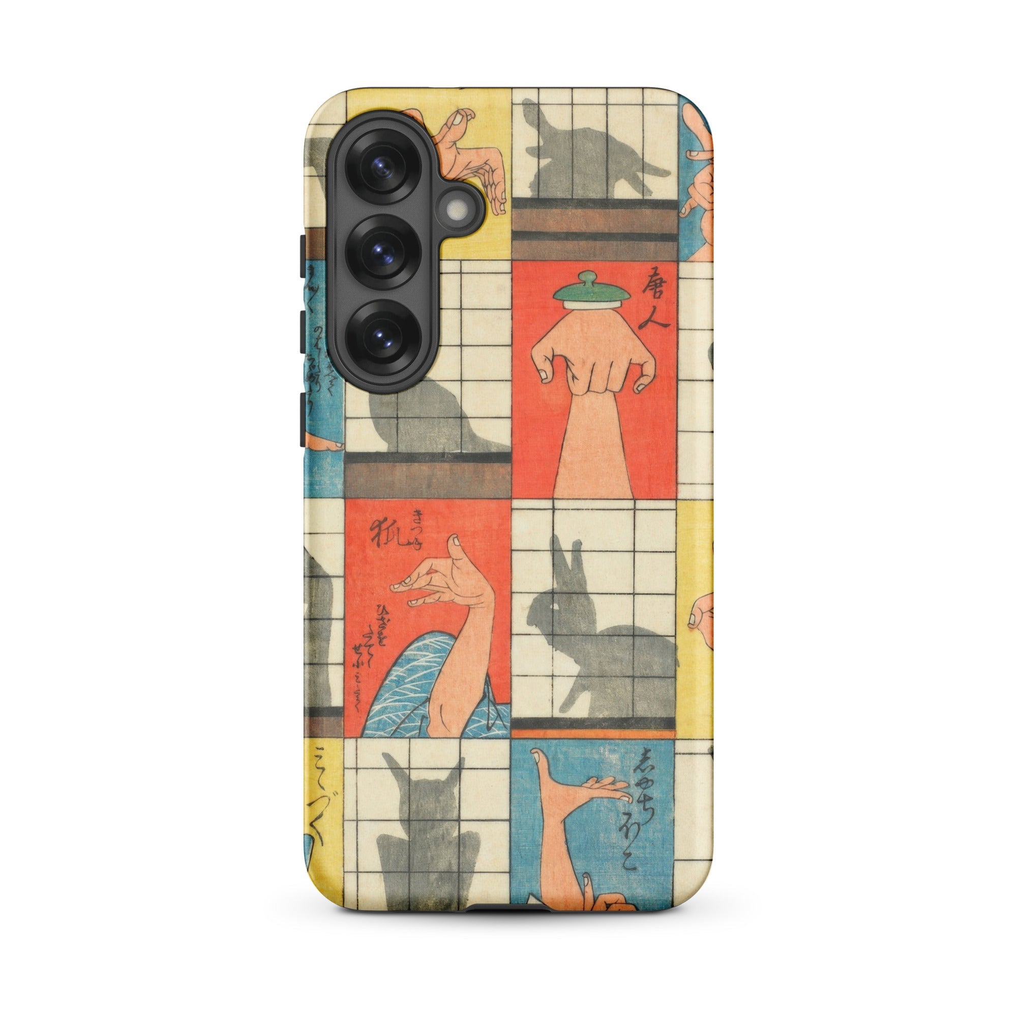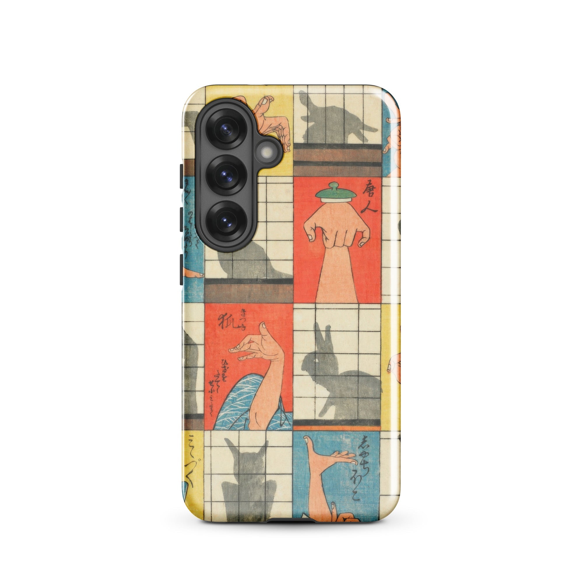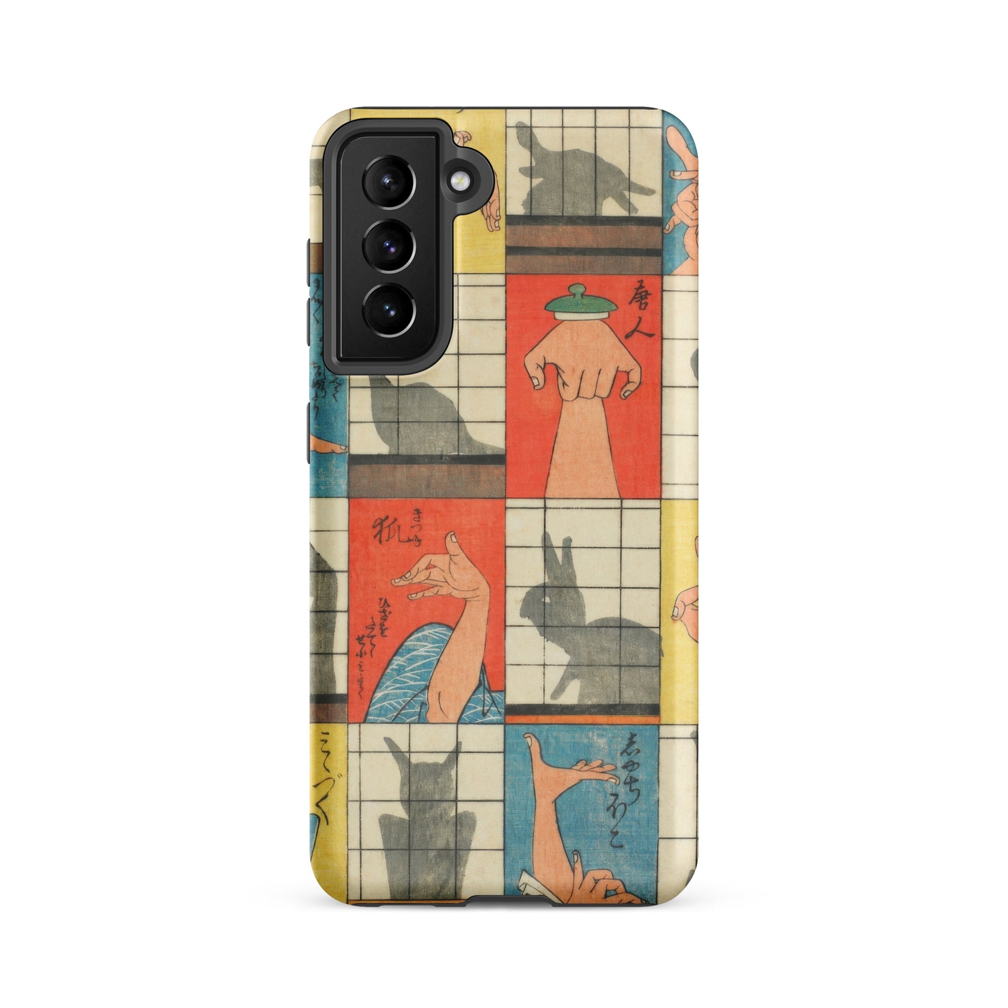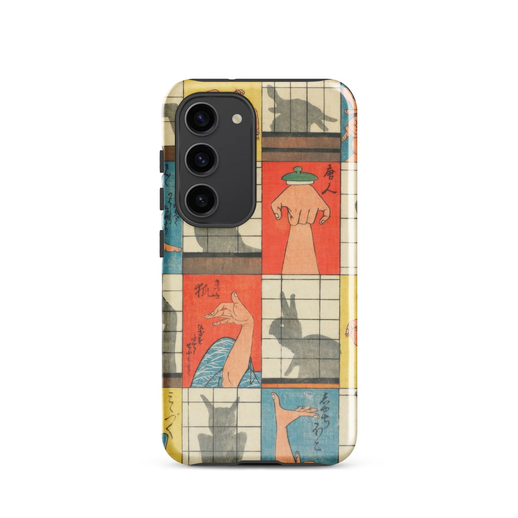 Diese Handyhülle fängt die Magie der Edo-Zeit der 1840er Jahre ein, eine Aufzeichnung des Kageboshi-Spiels, das kerzenbeleuchtete Räume in Puppenbühnen verwandelte. Nishiki-e-Druck bewahrt die zarten Fleischfarben geschickter Hände in der Mitte der Geste, für immer zwischen menschlicher Form und tierischem Spektakel schwebend.