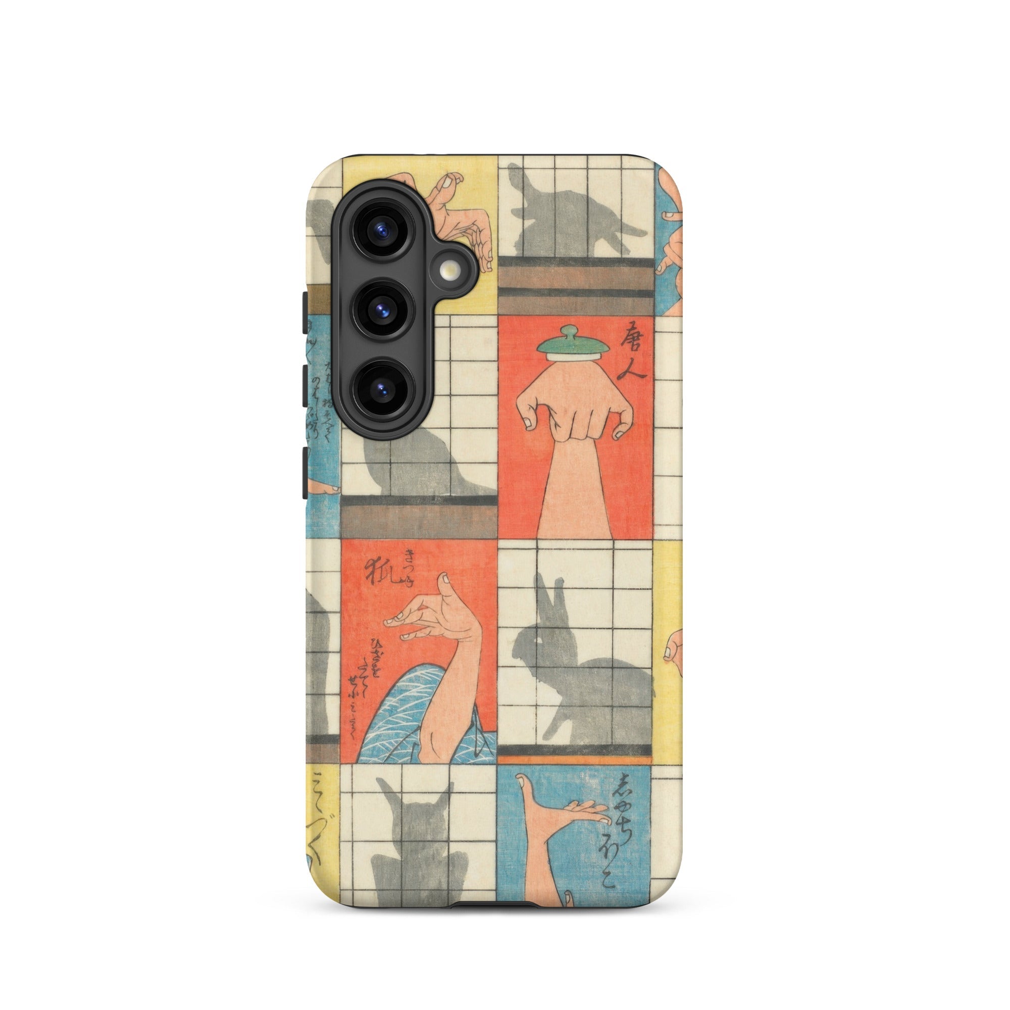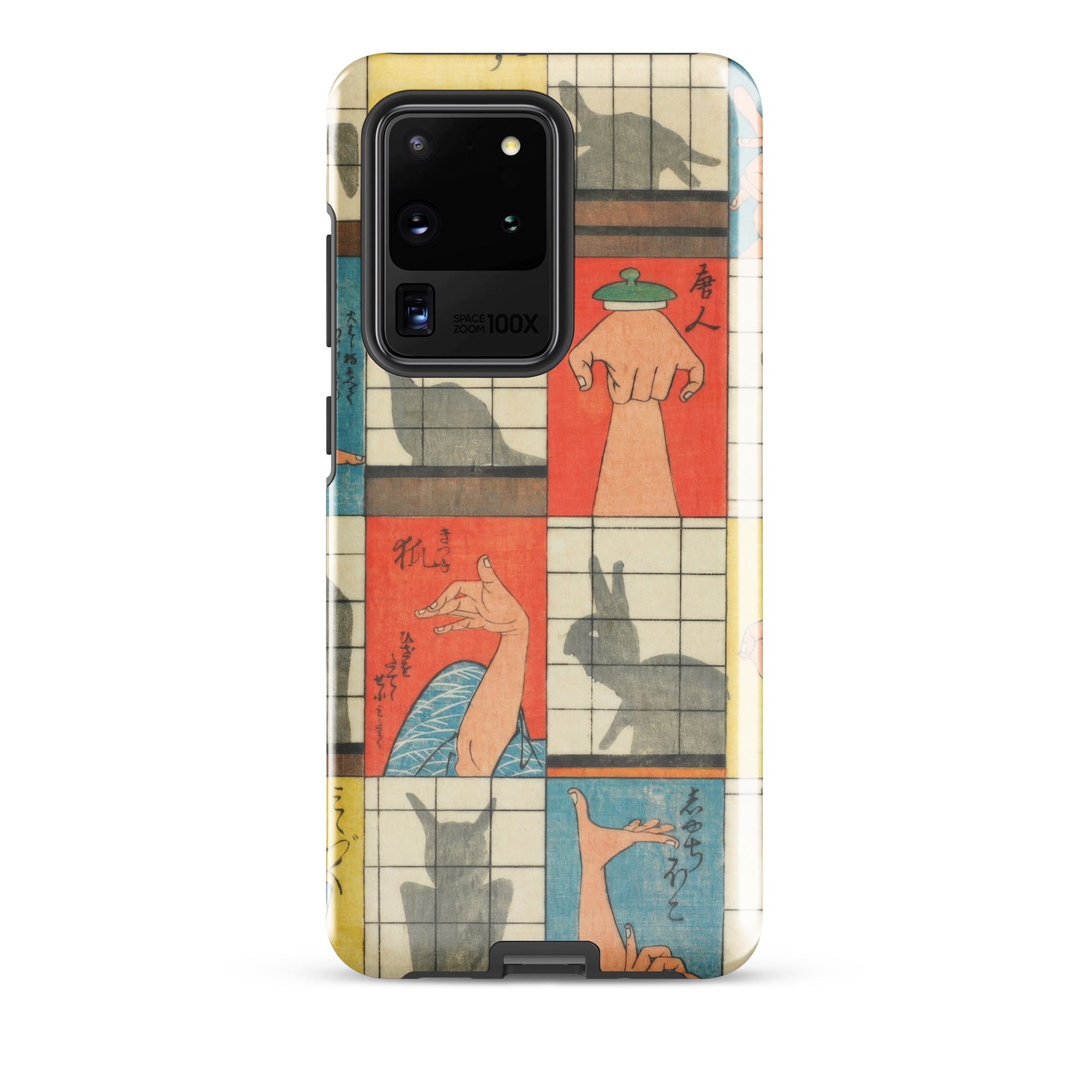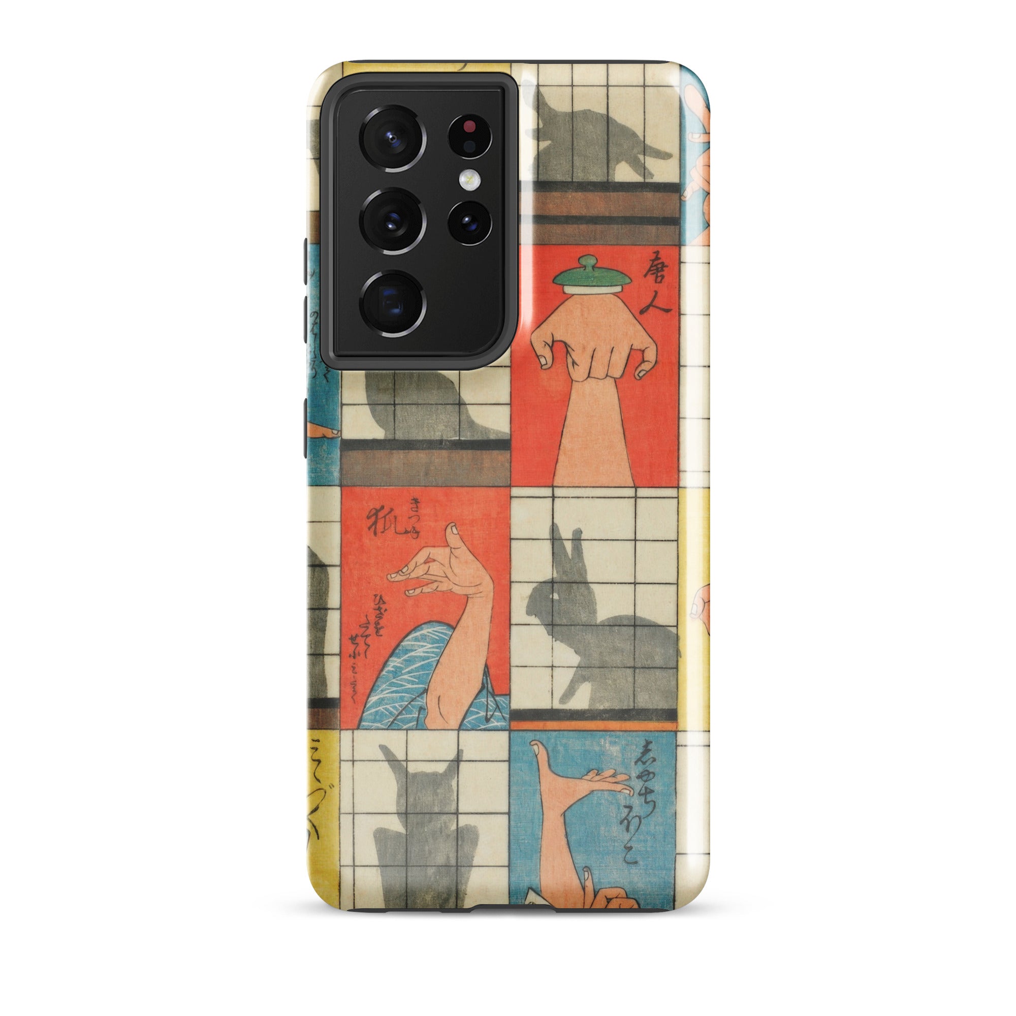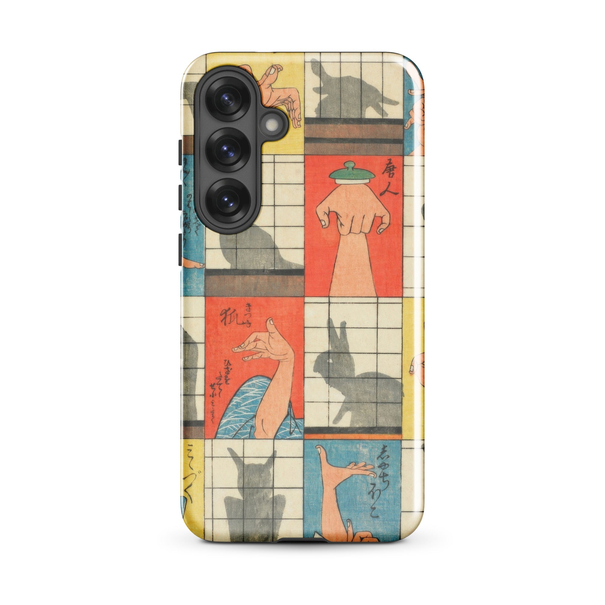 Diese Handyhülle fängt die Magie der Edo-Zeit der 1840er Jahre ein, eine Aufzeichnung des Kageboshi-Spiels, das kerzenbeleuchtete Räume in Puppenbühnen verwandelte. Nishiki-e-Druck bewahrt die zarten Fleischfarben geschickter Hände in der Mitte der Geste, für immer zwischen menschlicher Form und tierischem Spektakel schwebend.