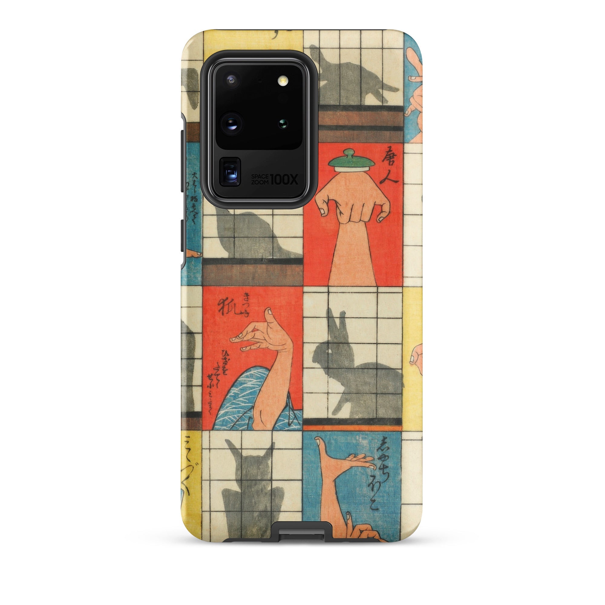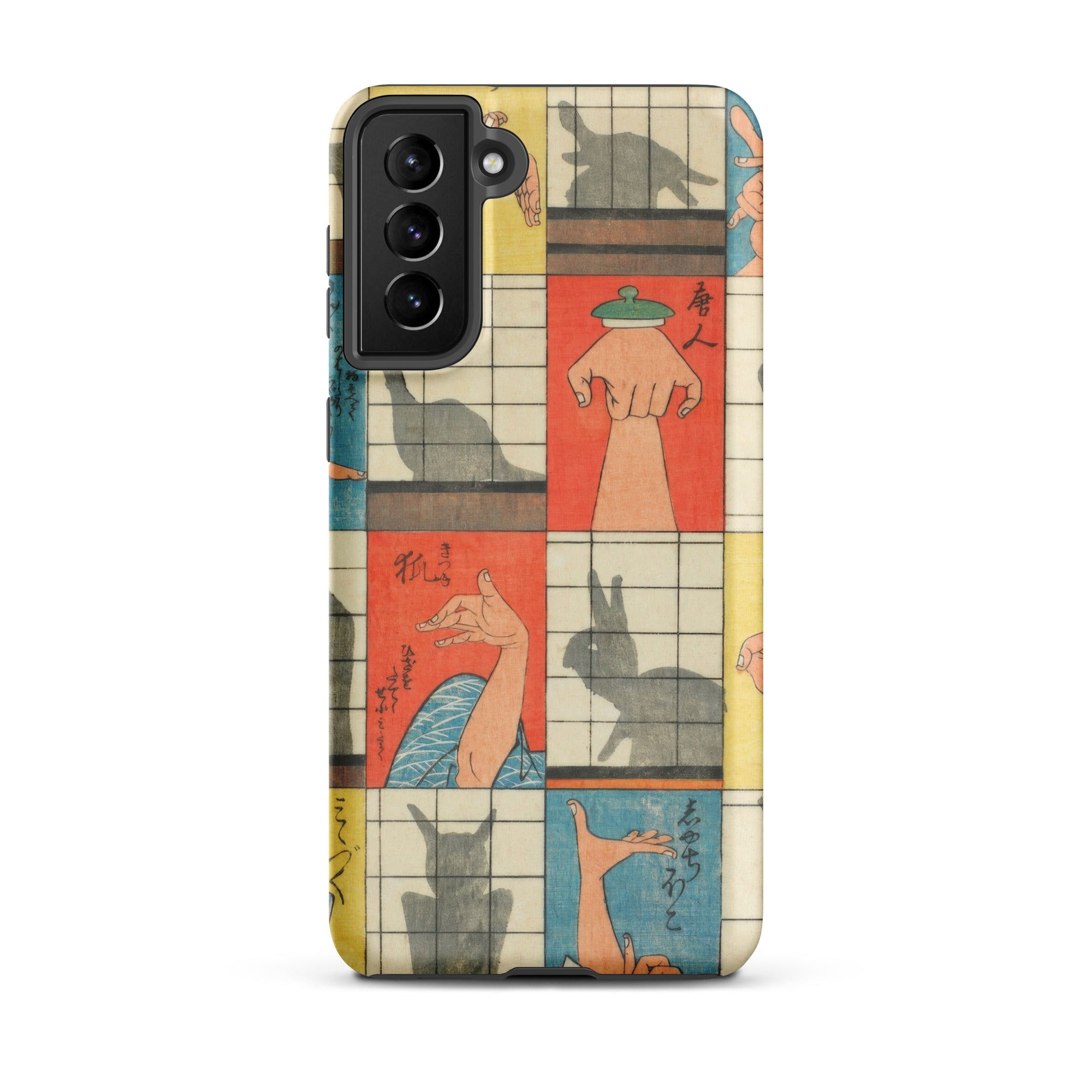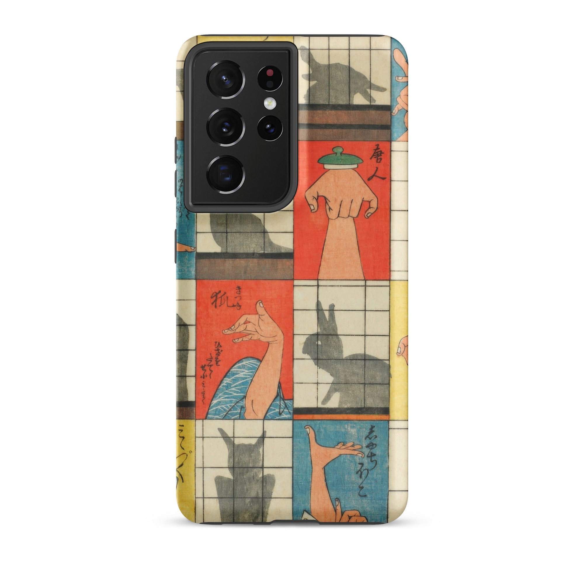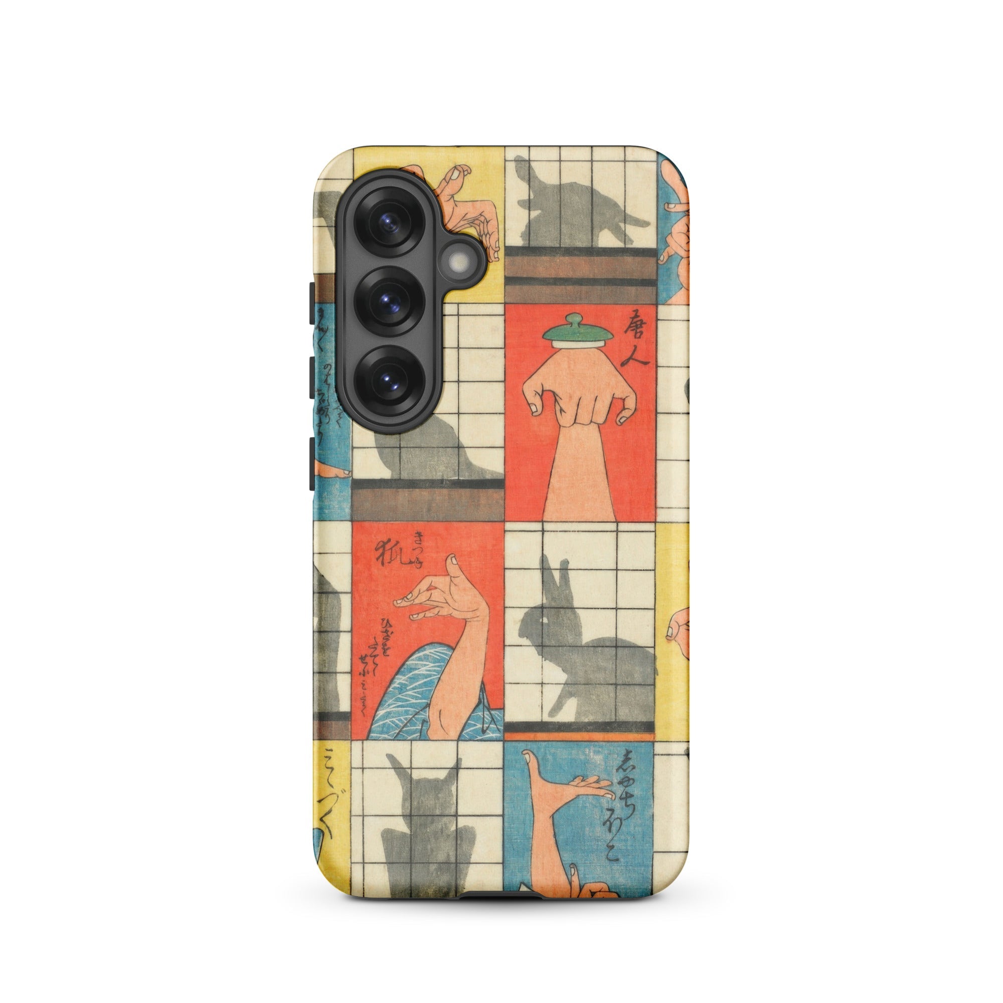 Diese Handyhülle fängt die Magie der Edo-Zeit der 1840er Jahre ein, eine Aufzeichnung des Kageboshi-Spiels, das kerzenbeleuchtete Räume in Puppenbühnen verwandelte. Nishiki-e-Druck bewahrt die zarten Fleischfarben geschickter Hände in der Mitte der Geste, für immer zwischen menschlicher Form und tierischem Spektakel schwebend.