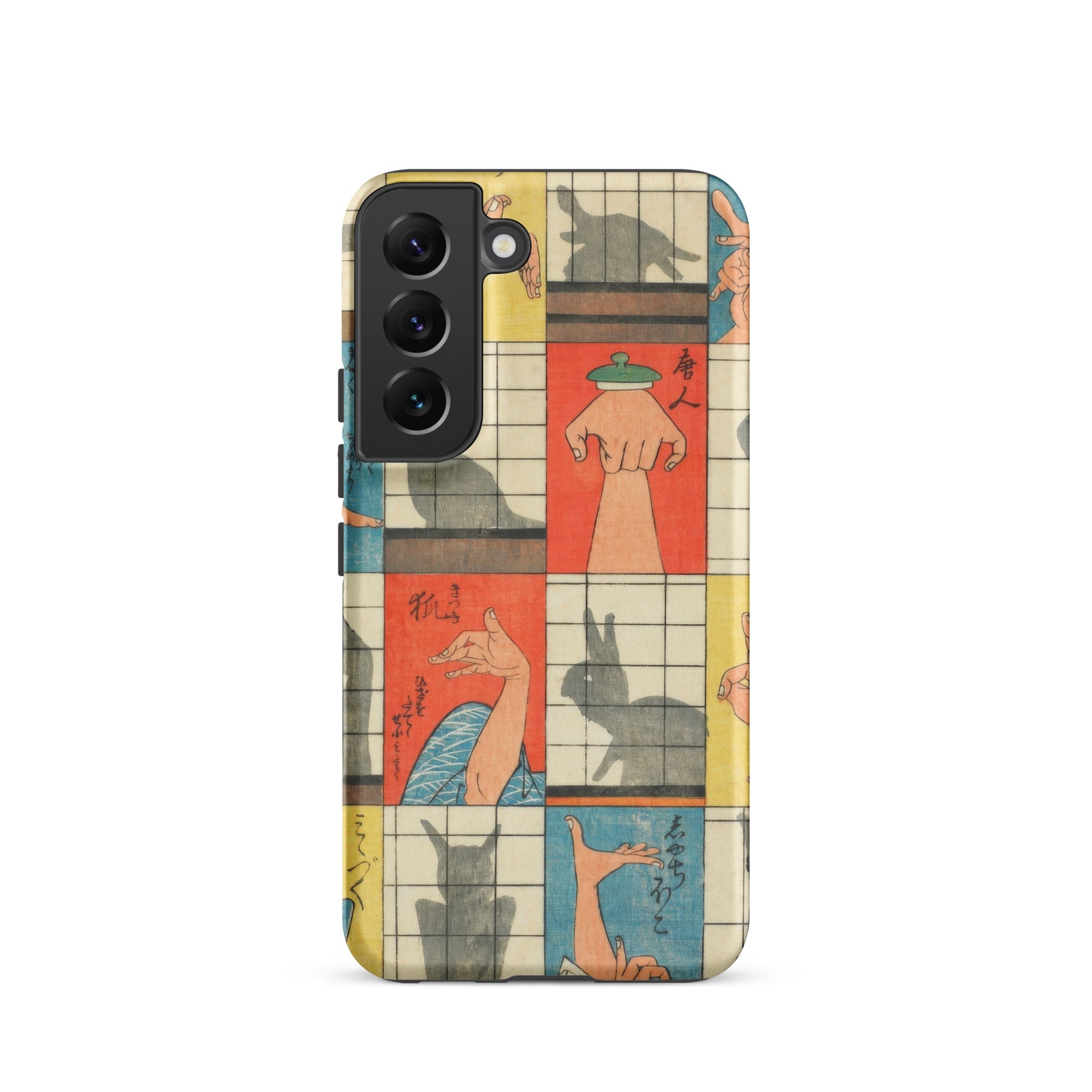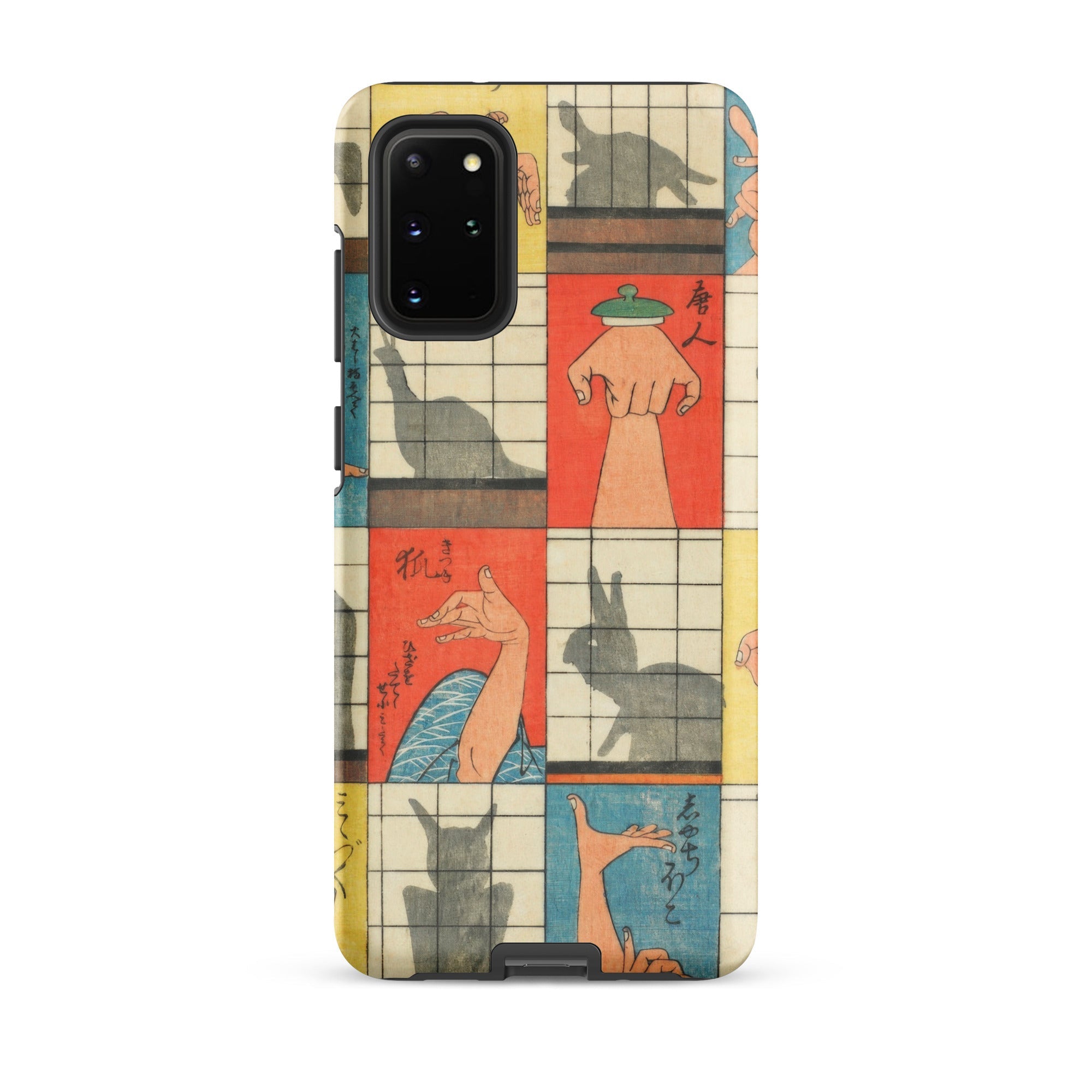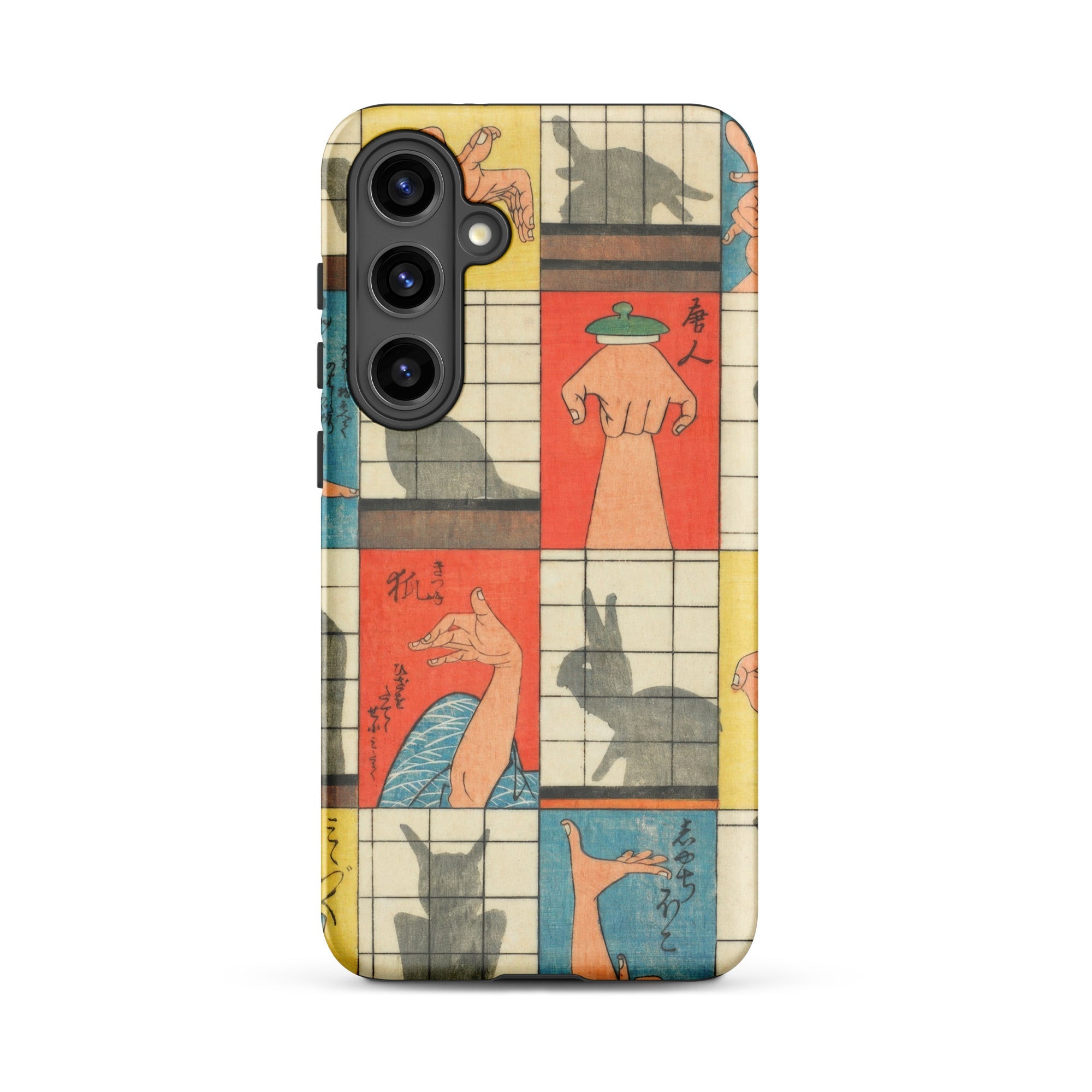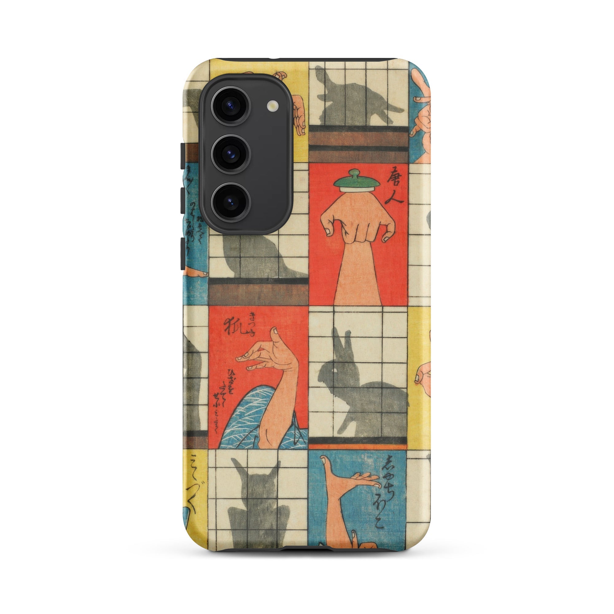 Diese Handyhülle fängt die Magie der Edo-Zeit der 1840er Jahre ein, eine Aufzeichnung des Kageboshi-Spiels, das kerzenbeleuchtete Räume in Puppenbühnen verwandelte. Nishiki-e-Druck bewahrt die zarten Fleischfarben geschickter Hände in der Mitte der Geste, für immer zwischen menschlicher Form und tierischem Spektakel schwebend.