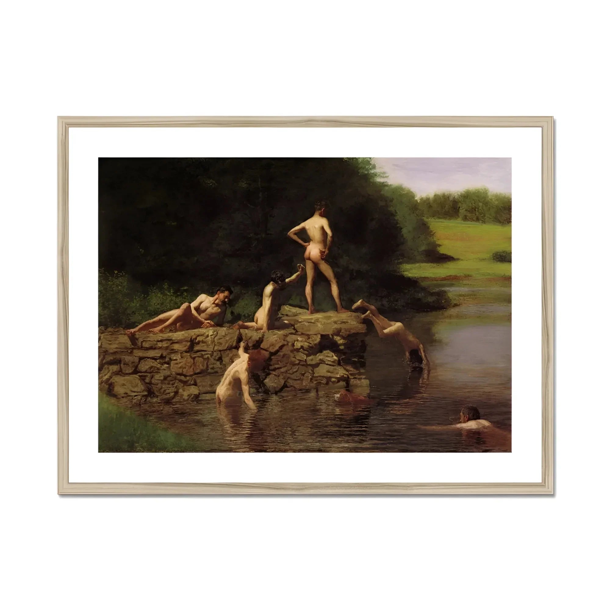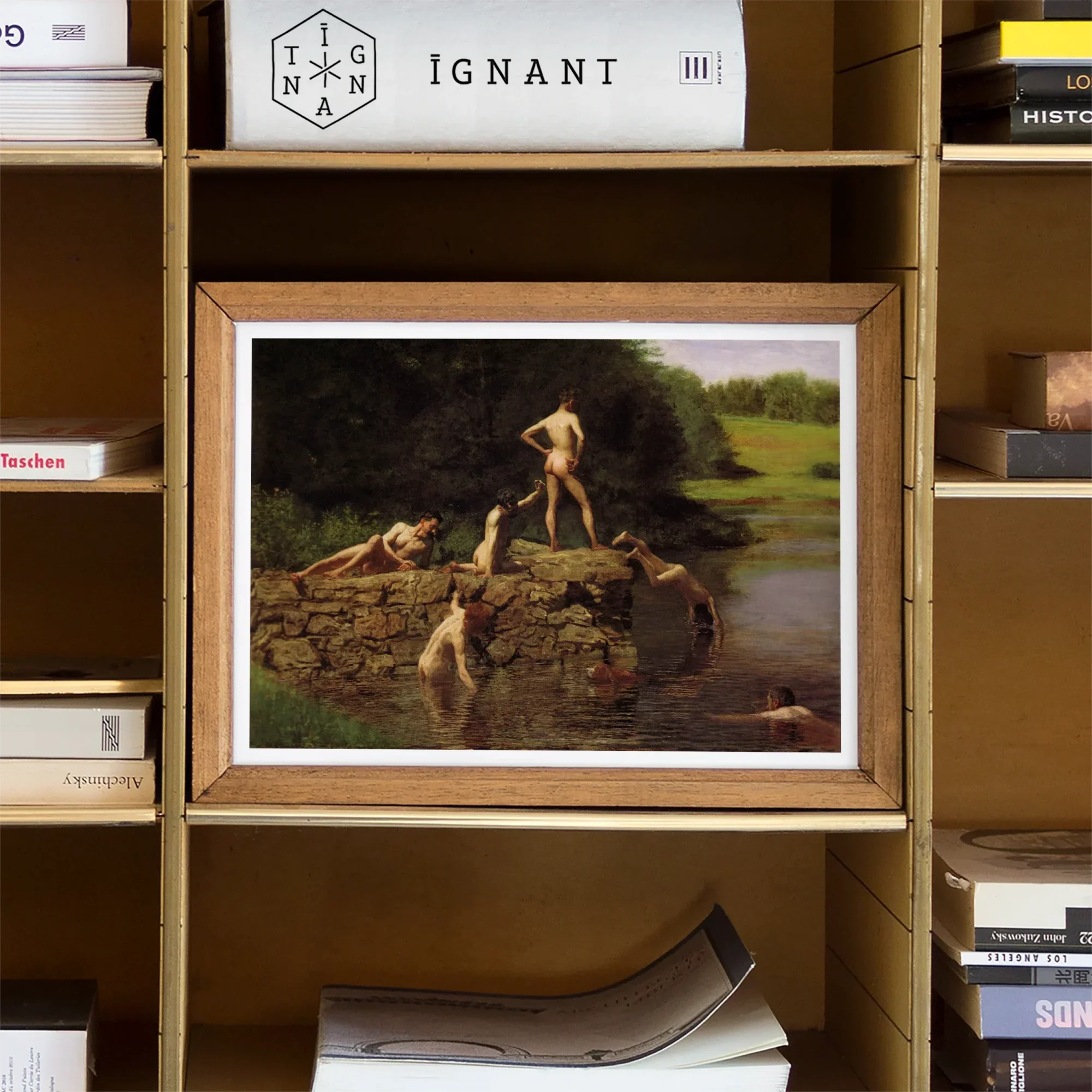 Thomas Eakins' "The Swimming Hole" fängt einen Moment der ruhigen, aber dennoch robusten Männlichkeit ein. Dieses bahnbrechende Werk wird oft als Eakins' Höhepunkt in der Aktfigur-Malerei gepriesen. Ein Meisterwerk der Öl-auf-Leinwand-Kunst des schwulen Verlangens, zeigt es sechs Männer, darunter der Künstler selbst, die in der natürlichen Intimität eines abgelegenen Sees versunken sind. Die Komposition ist eine Feier der männlichen Form, dargestellt mit exquisiter Aufmerksamkeit für anatomische Präzision und Flüssigkeit. Die erdigen Töne der Figuren kontrastieren lebhaft mit der üppigen Landschaft, wodurch ein dynamisches Zusammenspiel von Licht und Schatten entsteht.