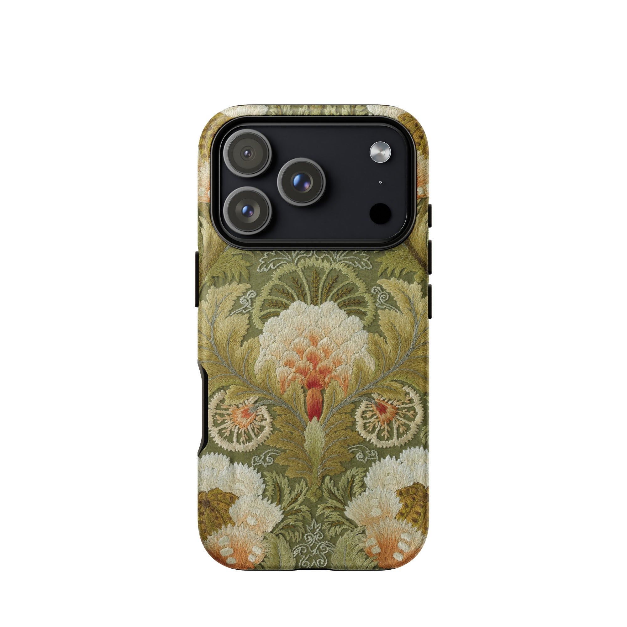 Ihr Telefon, jetzt in Seide und Geschichte gehüllt, trägt ein Textilmanifest — wo die Nadel zum Archiv wird und Blumen in der Sprache von Imperium, Botanik und Mythos sprechen.