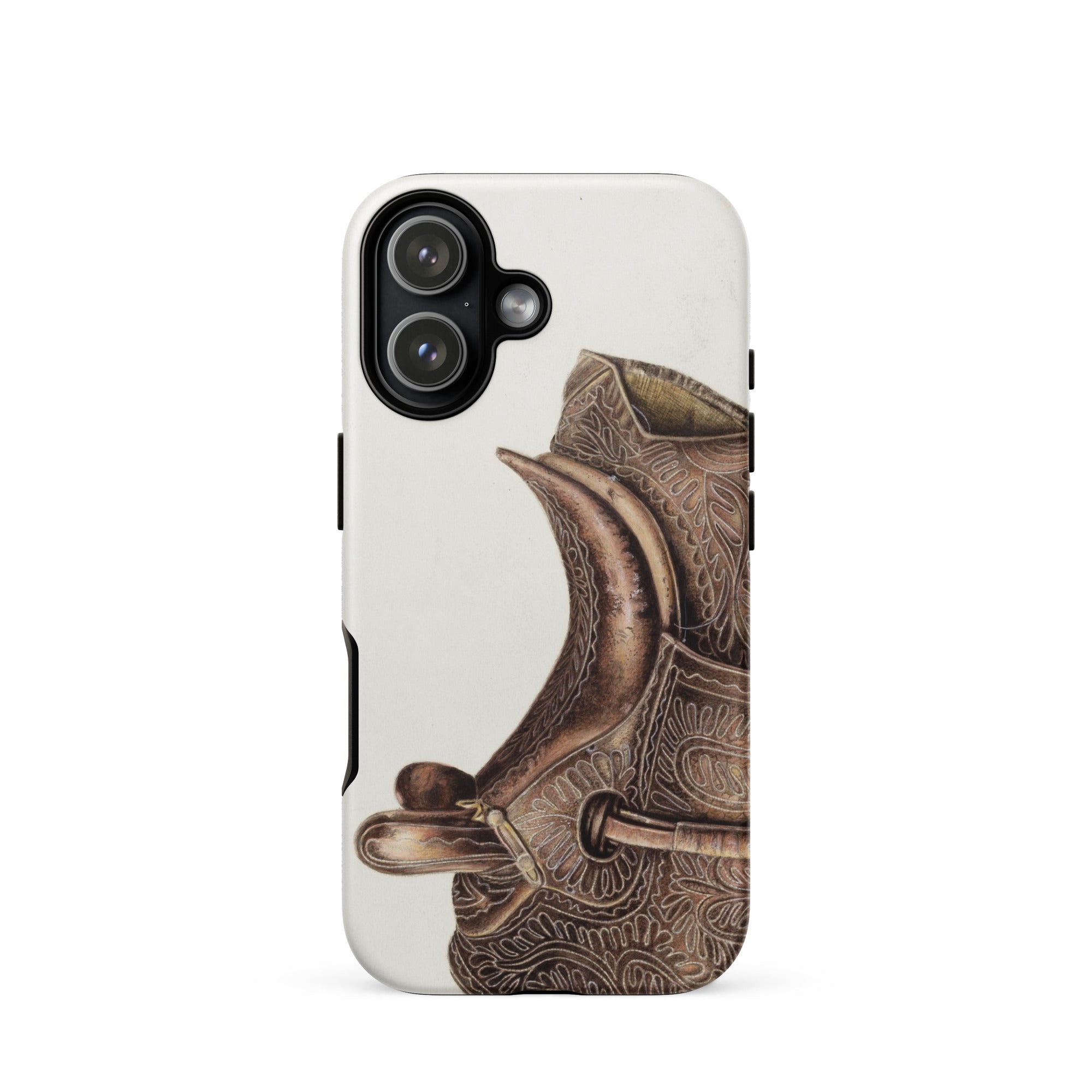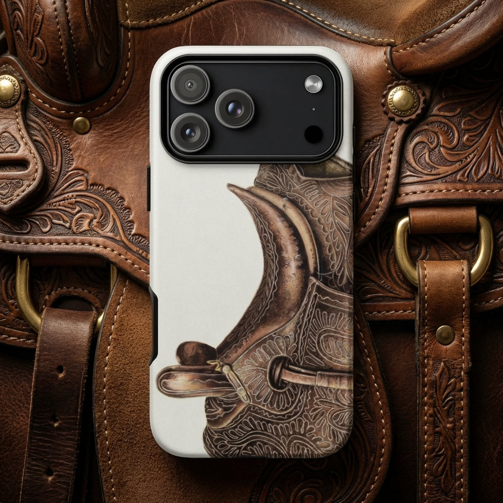Diese iPhone-Hülle ist ein Portal zum Reitererbe, wo Kunstfertigkeit auf Tradition trifft. Bertha Semples meisterhafte Darstellung eines antiken Damensattels haucht dem Design von Reiterausrüstung Leben ein, jede verzierte Ledergravur flüstert von vergangenen Ritten und eleganter Haltung.