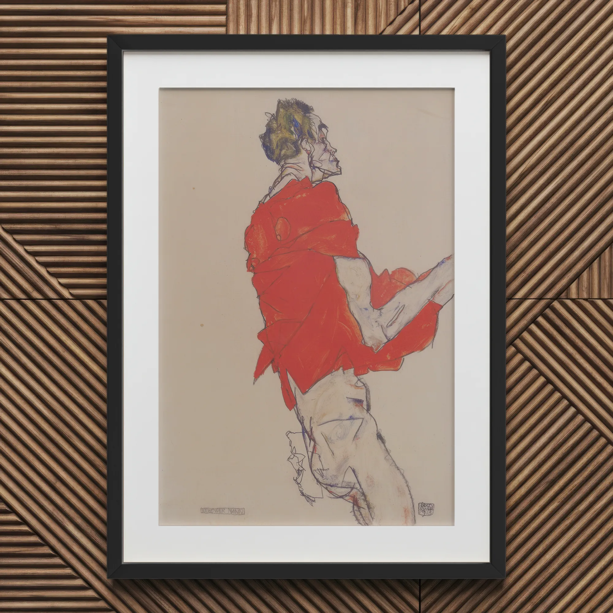 Schiele verdreht seinen Körper in eine rohe Silhouette, ein Arm schneidet nach oben, der andere verschwindet im Schwung des Stoffs. Dieses scharlachrote Hemd, gezackt wie eine Flamme, haftet und fällt zugleich zusammen und enthüllt blasses Fleisch, das mit unruhigen Konturlinien geschnitzt ist. Haare ragen in grünlich schattierte Schatten, Wangenknochen schneiden die Leere, Lippen sind gegen eine unsichtbare Ladung zusammengepresst. Der Körper wirkt, als wäre er mitten in der Geste ergriffen, halb aus der Leinwand gerissen, halb von ihr verschlungen.
