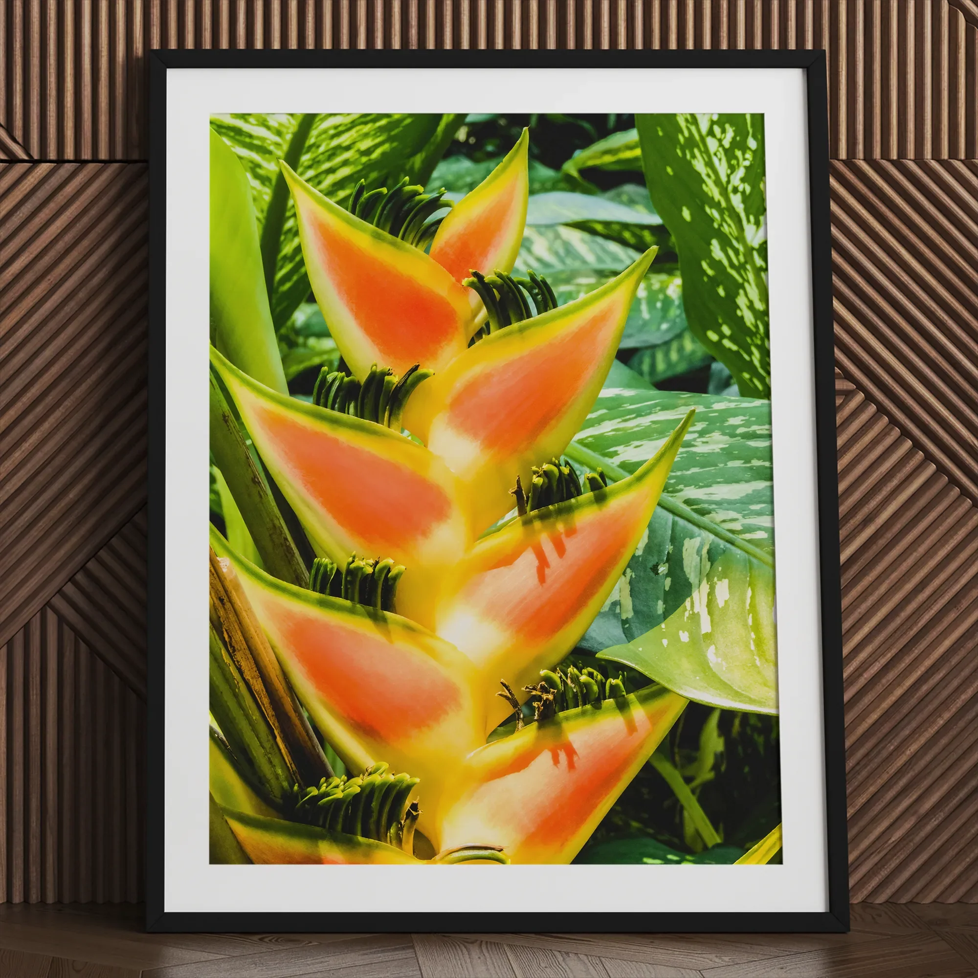 Mit dieser faszinierenden Heliconia werden Sie in eine üppige tropische Oase transportiert Kunstdruck. Die Blume der Hummerklaue bricht in einer schillernden Ausstellung von Bernstein- und Korallenfarben hervor, wobei sich die Deckblätter wie das eigene Feuerwerk der Natur entfalten.
