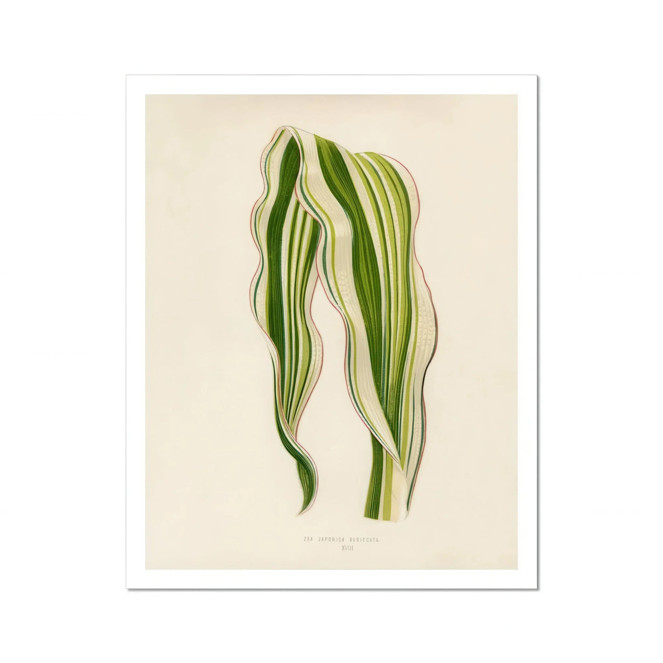 Sie schauen auf eine Kunstreproduktion, die die Essenz von Zea japonica variegata mit exquisiter Präzision einfängt. Dieser antike botanische Druck zeigt die bunten Blätter der Pflanze, ihre Smaragd- und Elfenbeinstreifen, die über die Leinwand tanzen.