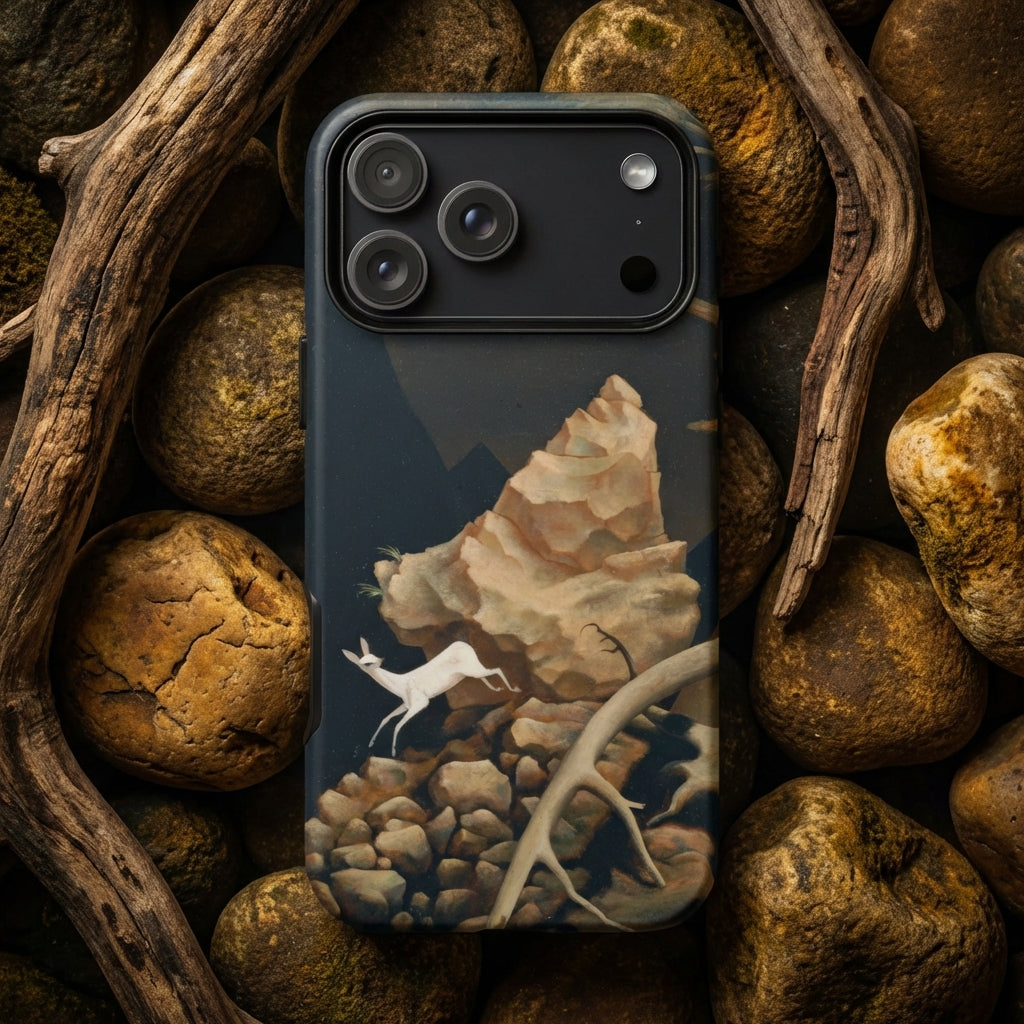 Ein Gletscherhirsch friert mitten im Schritt ein. Hufe zerbröckeln die spröde Asche darunter. Bäume schwanken heftig, ihre Stämme sind in Bögen gesplittert wie gebrochene Kompassnadeln. In 'Sturm' von Franz Sedlacek ist Überleben nicht theatralisch. Es ist anatomisch. Und diese iPhone-Hülle spiegelt nicht den Sturm wider. Sie archiviert seinen Rückzug.