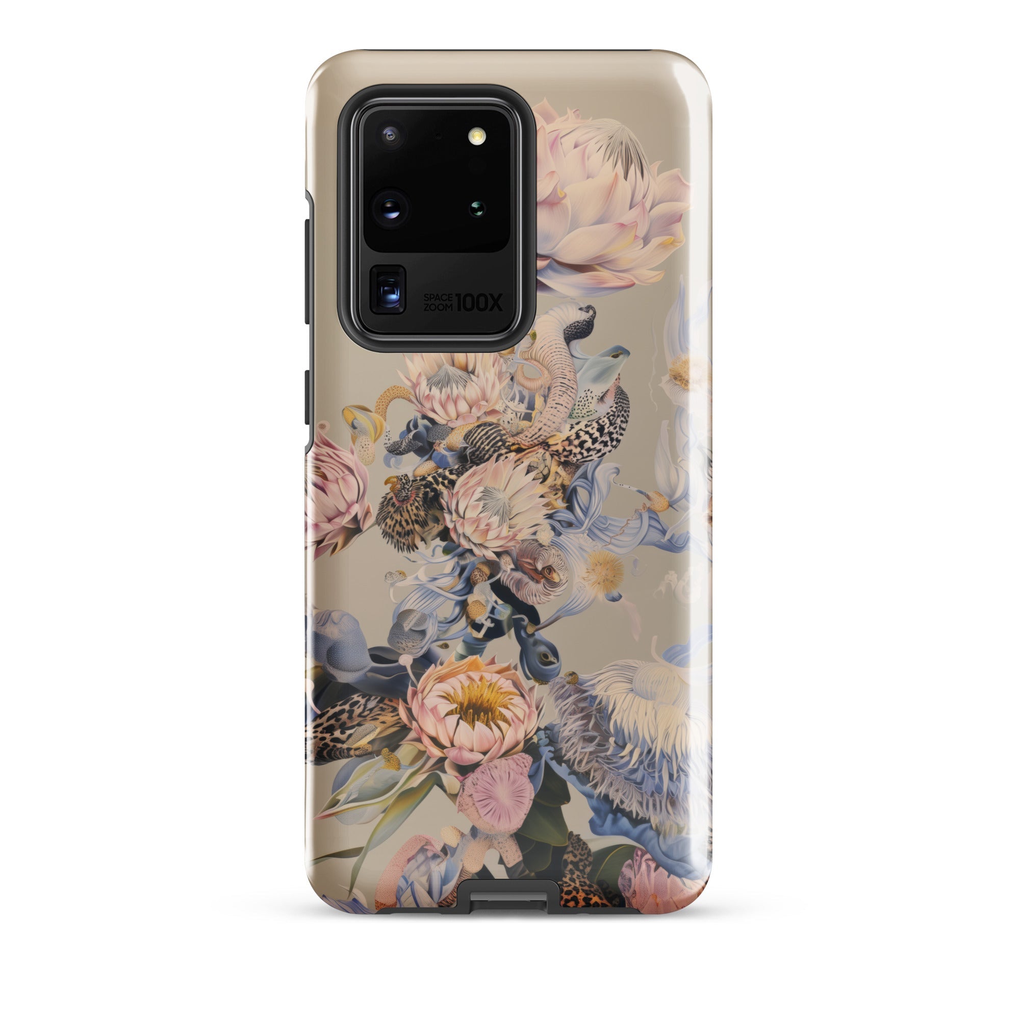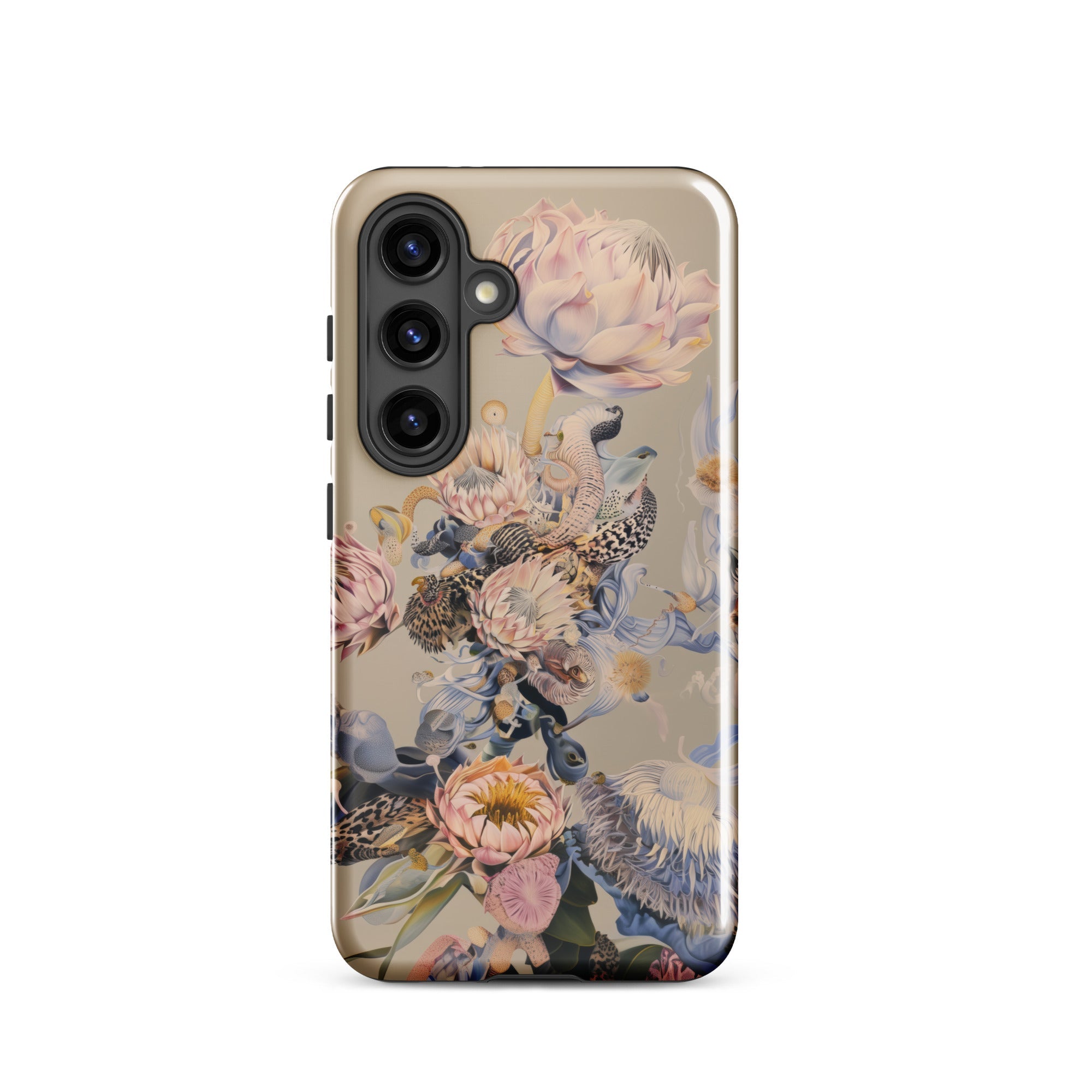 Grafischer Surrealismus schärft jede Kante und schichtet Farbverläufe in ein blühendes Emblem zeitgenössischer Kunst. Auf diesem Samsung-Case wird der Zuckerbusch zu einer surrealen botanischen Fantasie, einer Protea-Mythologie, die in ornamentale Permanenz lodert.