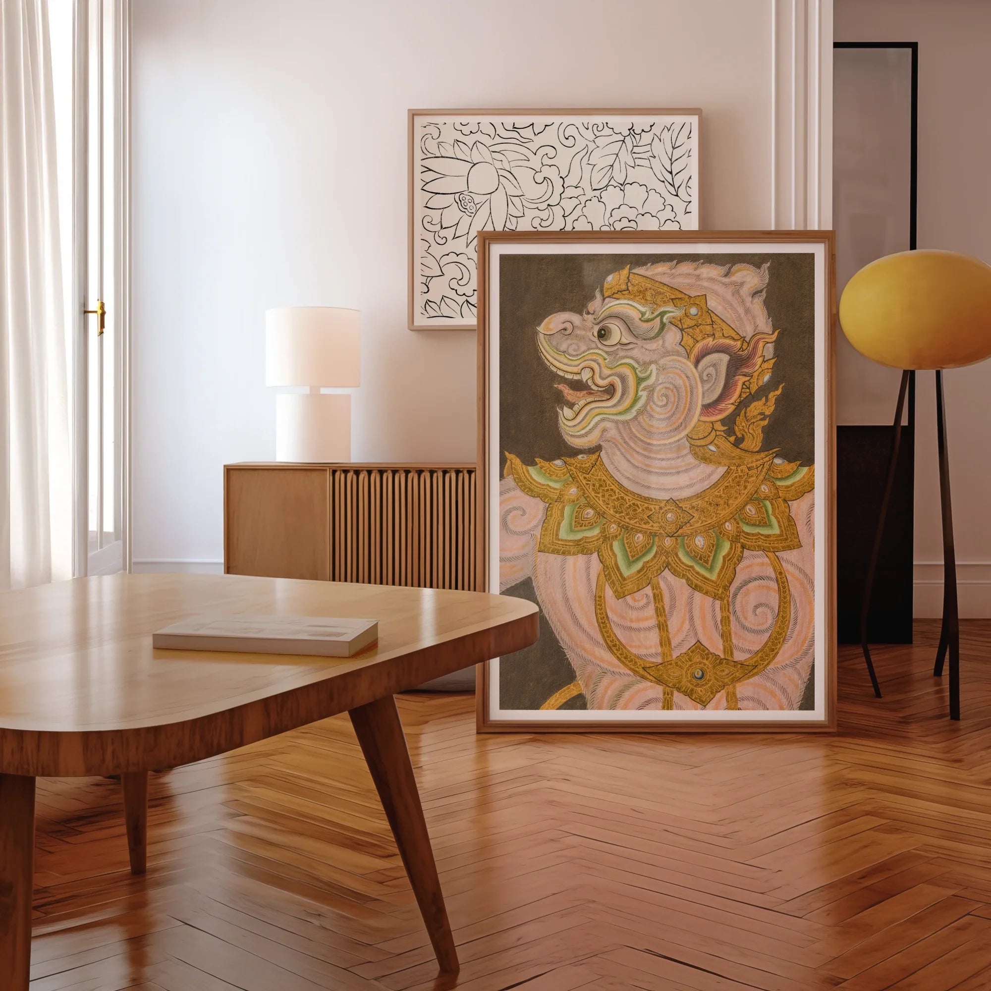 Dies ist nicht nur Pigment auf Papier—es ist ein Portal zum spirituellen Pantheon Südostasiens Asiens. Das spiralförmig geätzte Antlitz der Kreatur, gekrönt mit einem goldenen Kopfschmuck, strahlt eine Aura übernatürlicher Kraft aus. Sein kugeliges Auge, eingebettet in ein Gesicht aus Pastelltönen, scheint den Schleier zwischen sterblichen und mythischen Reichen zu durchdringen.