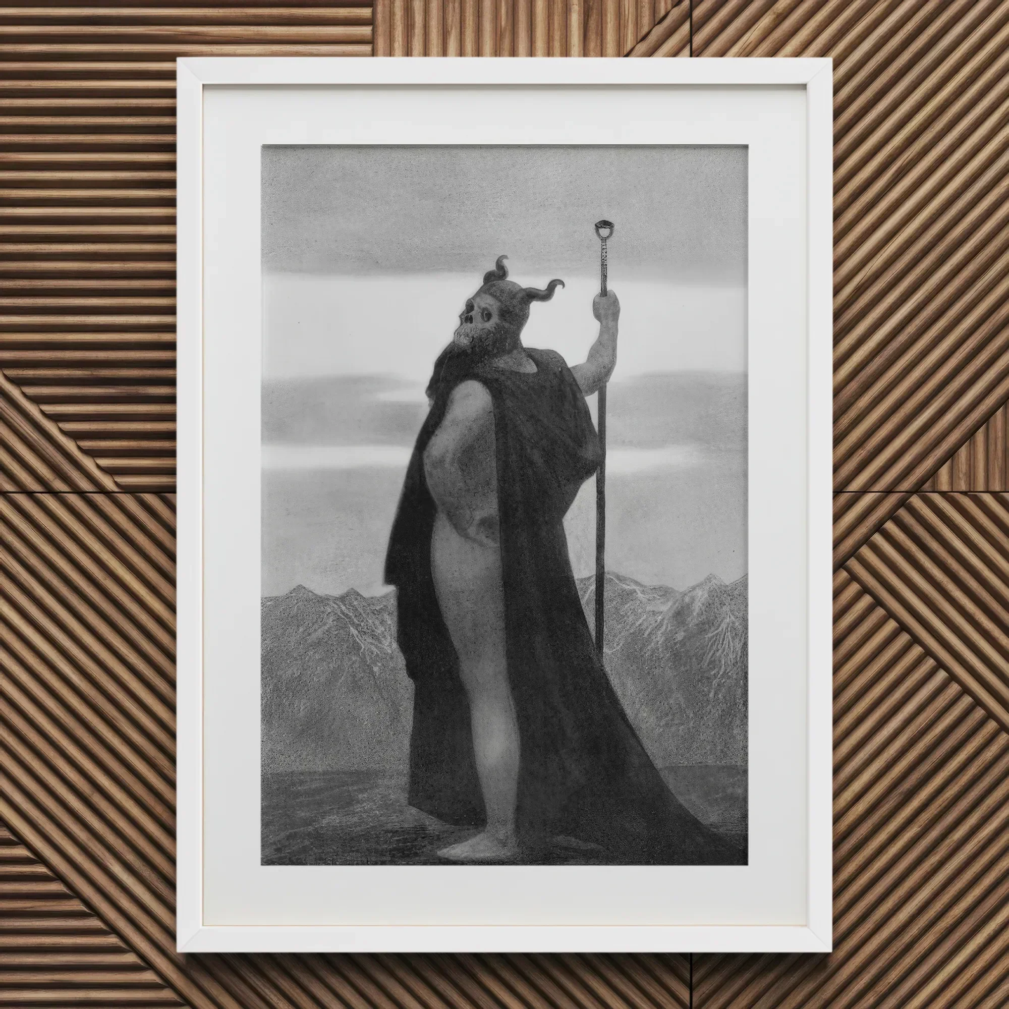 In "Der Tod" (1904) formt Sascha Schneider die Sterblichkeit zu Muskel und Stein. Der kolossale Akt, in ein schwarzes Tuch gehüllt, das das Licht verschlingt, verkörpert den fin-de-siècle Mystizismus und die nietzscheanische Trotz. Sein Schädelhelm starrt zum Horizont, wo nebelhafte Gipfel in bleiches Leuchten übergehen. Jede Sehne, jede gemeißelte Kontur glänzt wie Marmor, der von Prophezeiung erwärmt wird.