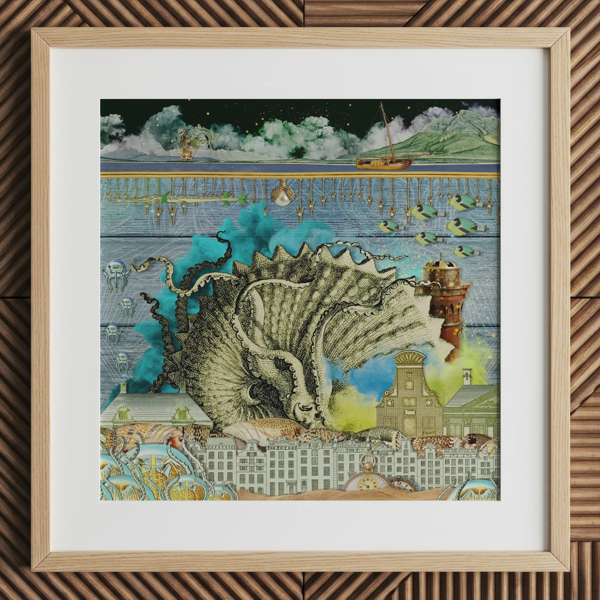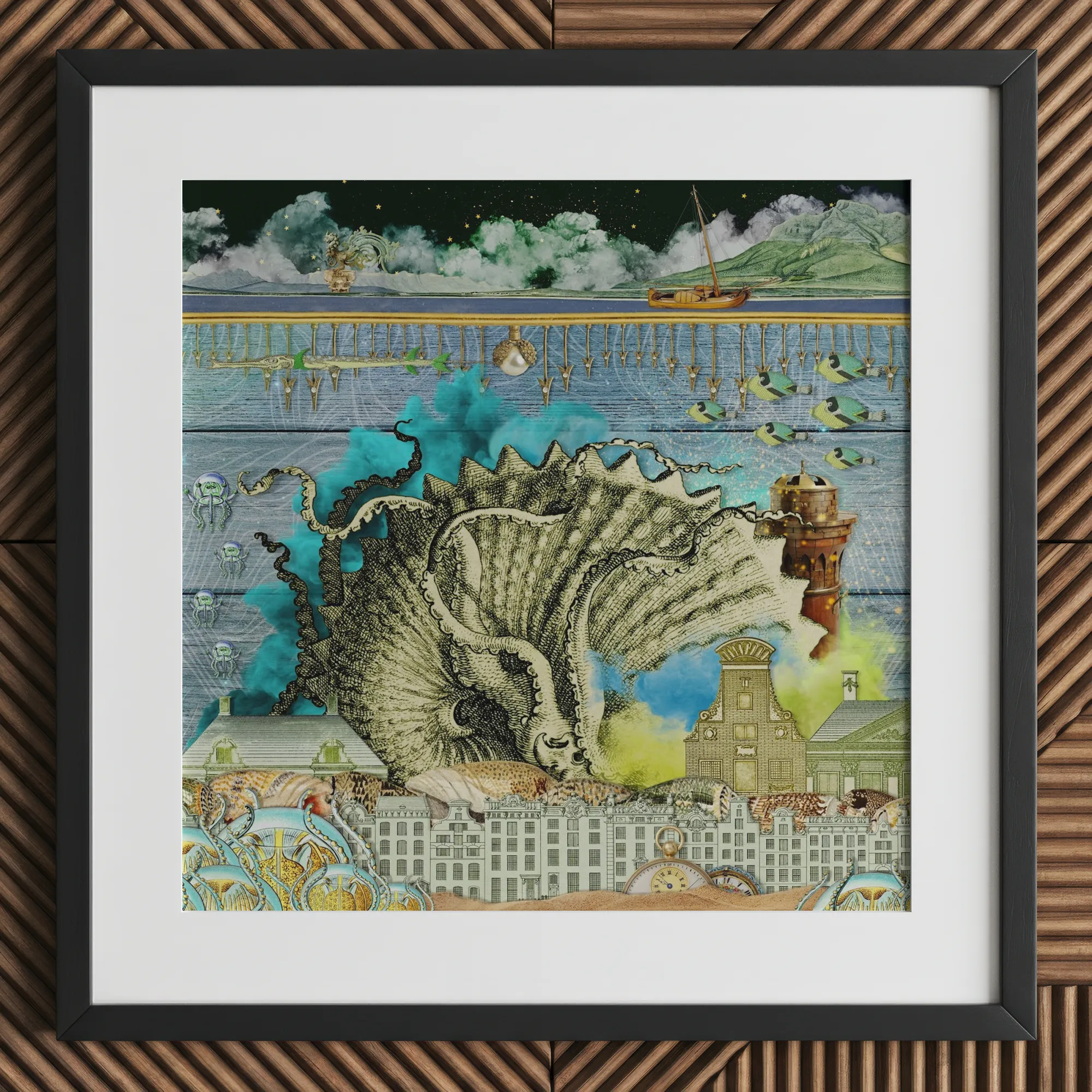 Diese 'Down Where It's Wetter'-Collage versetzt Sie in ein Reich, in dem nautische Fantasien und städtische Landschaften aufeinander treffen — sprudelnd mit surrealistischem Glanz um ein riesiges Meereswesen, das in wogenden Wolken aus farbigem Rauch eingebettet ist. Diese fesselnde surreale Collage stellt viktorianische Architektur marinen Wundern gegenüber und schafft eine visuelle Symphonie, die an die Werke von Ernst und Dali erinnert.