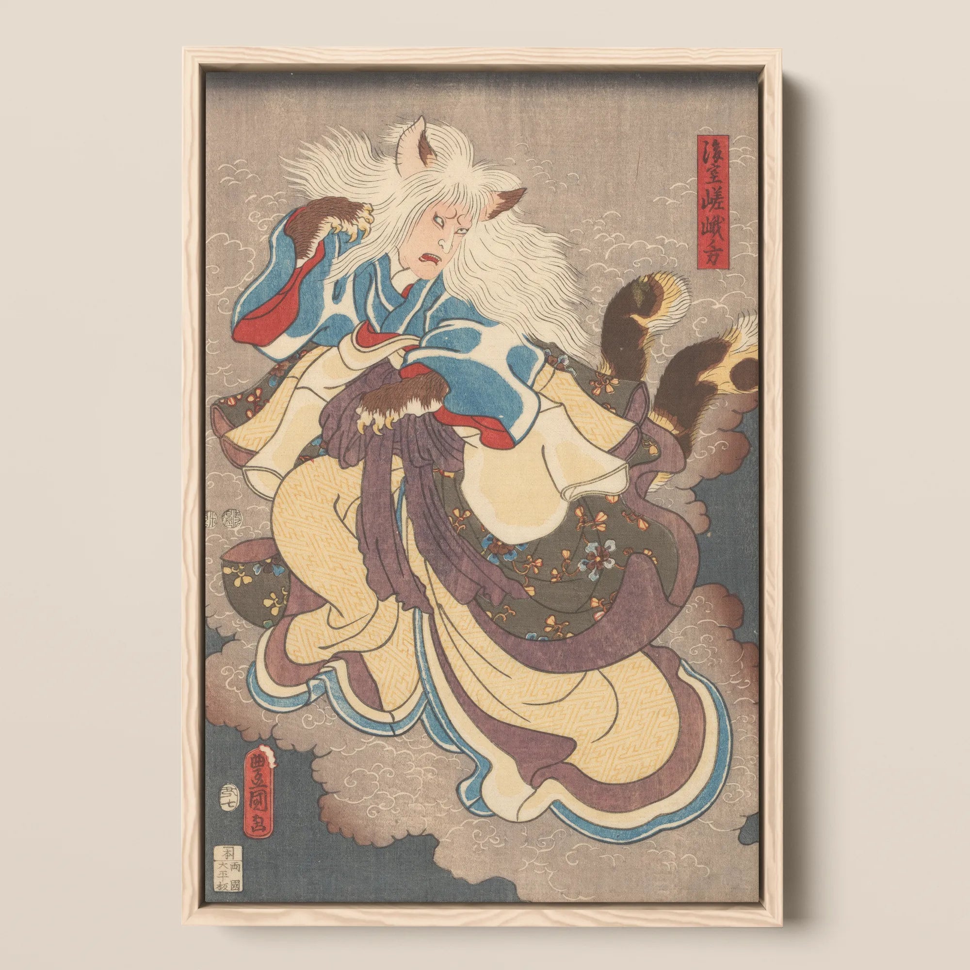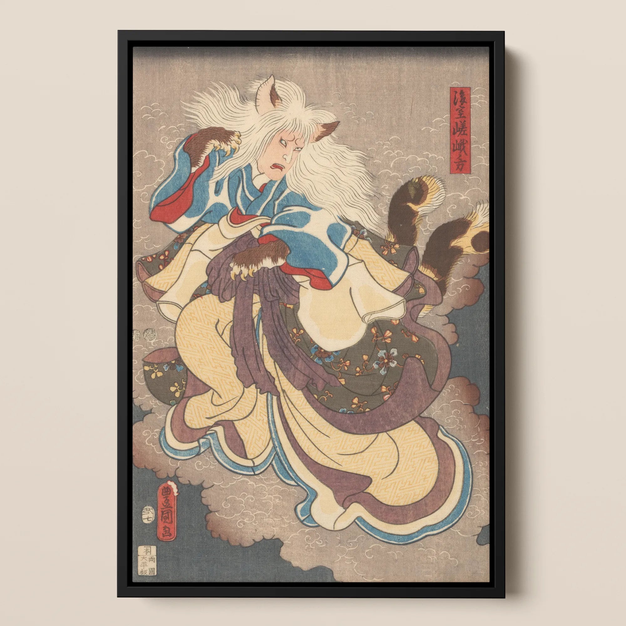 Wolkenbänke heben sich, während die Vampirkatze von Nabeshima vorrückt, der Kimono flattert im Wind, die Schwänze wie dunkle Fächer gefächert. Kunisadas Ukiyo-e-Grammatik ist exakt: indigoblaue Verzierungen, ockerfarbene Muster, scharlachrote Schocks an den Manschetten, ein lavendelfarbener Fluss von Obi, der die Haltung durchzieht.