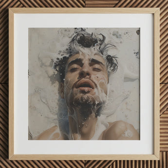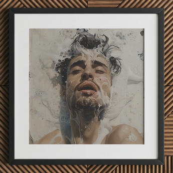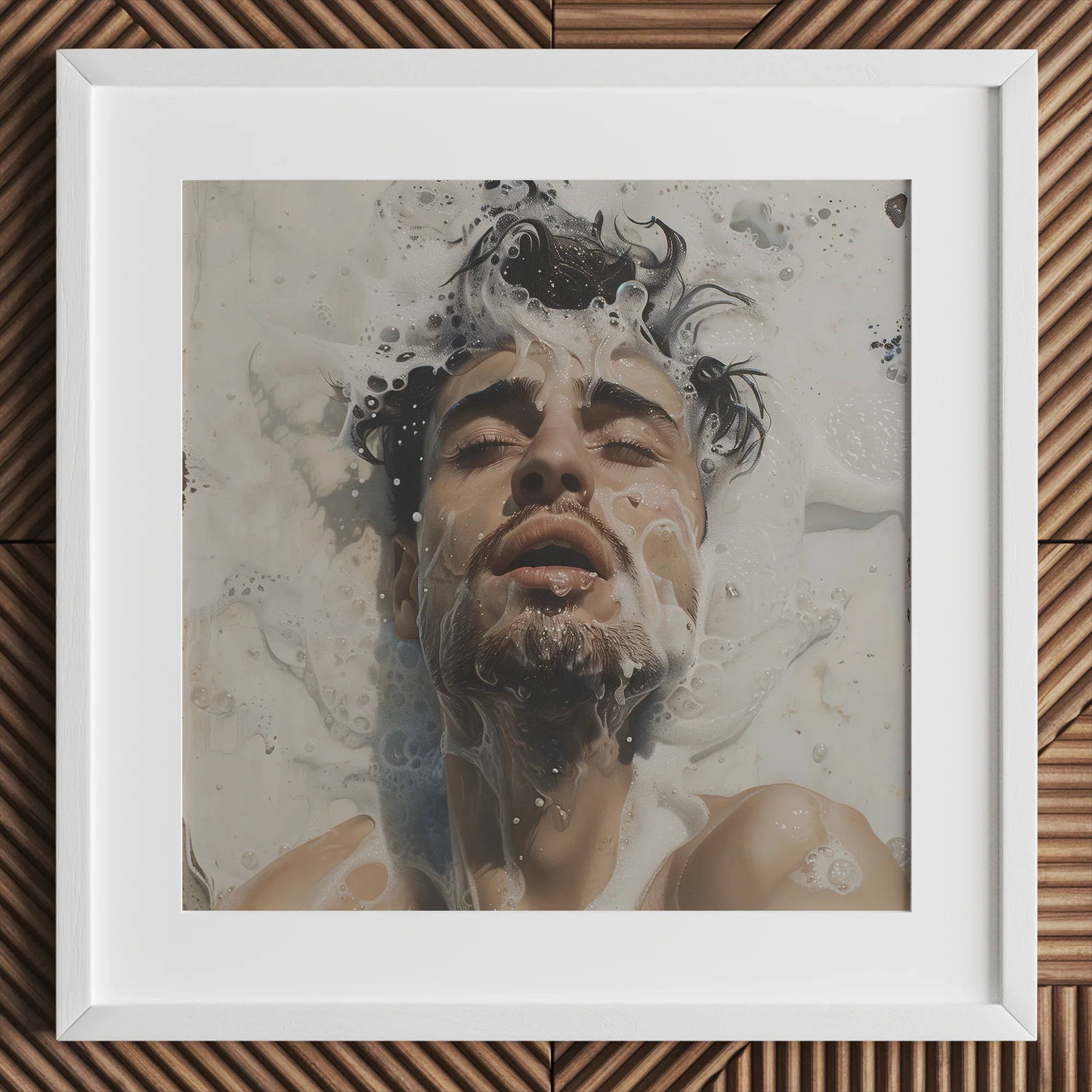 In den Tiefen seiner feuchten Träume umarmt ihn ein Ozean aus milchigen Wassern wie die Liebkosung eines Geliebten. Sein Gesicht, umrahmt von wilden Strähnen dunklen Haares, spricht von Hingabe. Loslassen der Kontrolle, die er einst so fest hielt. Der Schaum, der über seine Haut fließt, wie das Flüstern uralter Gezeiten. Jede Blase ein flüchtiges Zeugnis des stillen Kampfes zwischen Spannung und Entspannung.