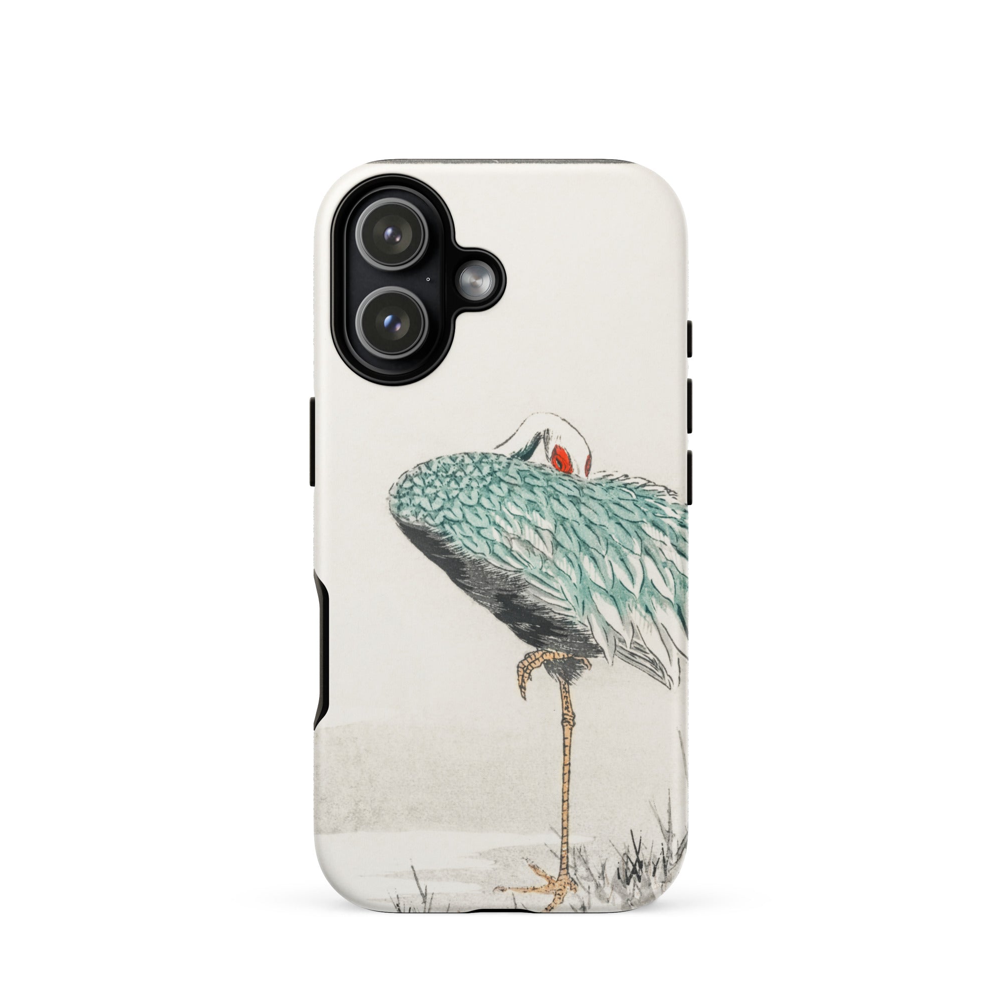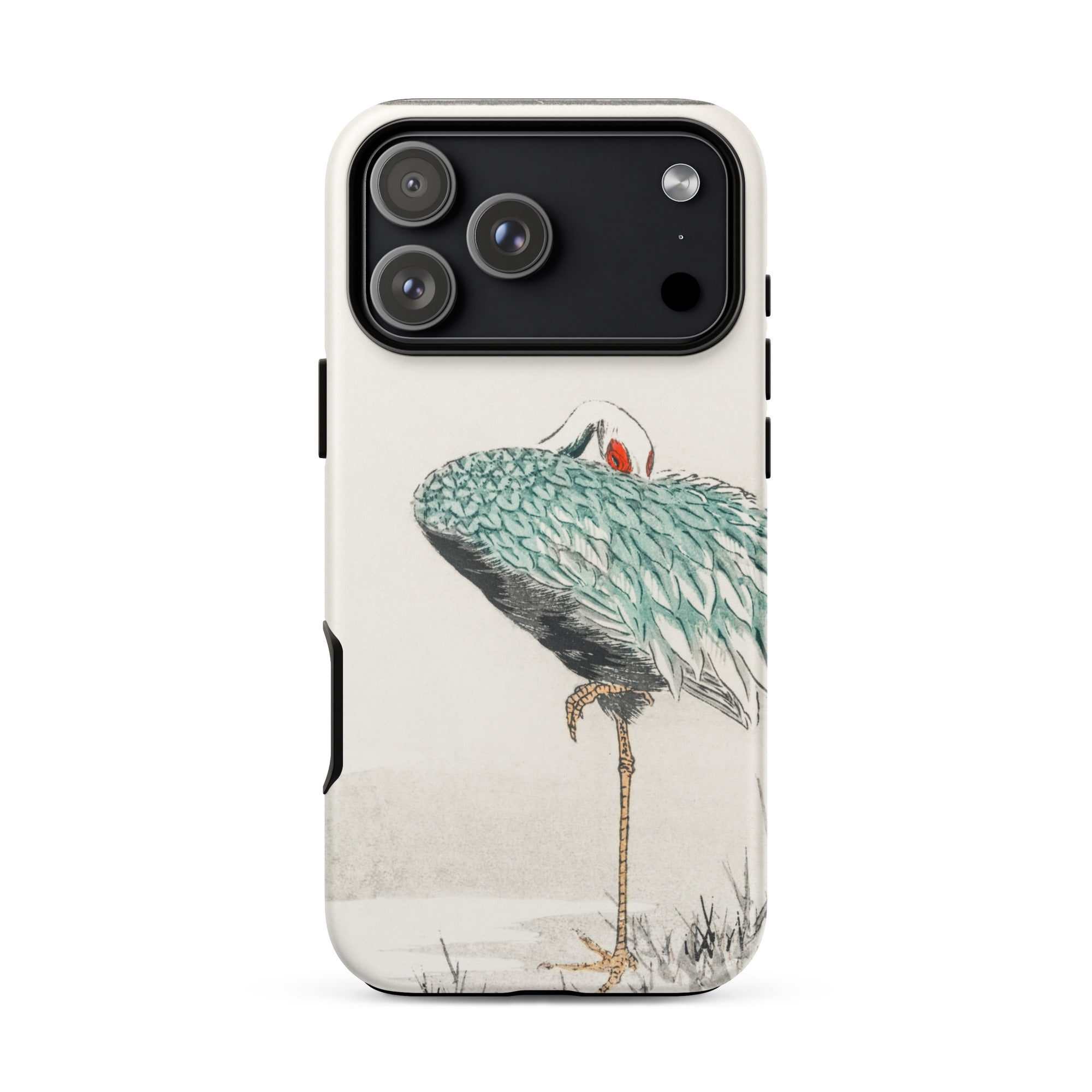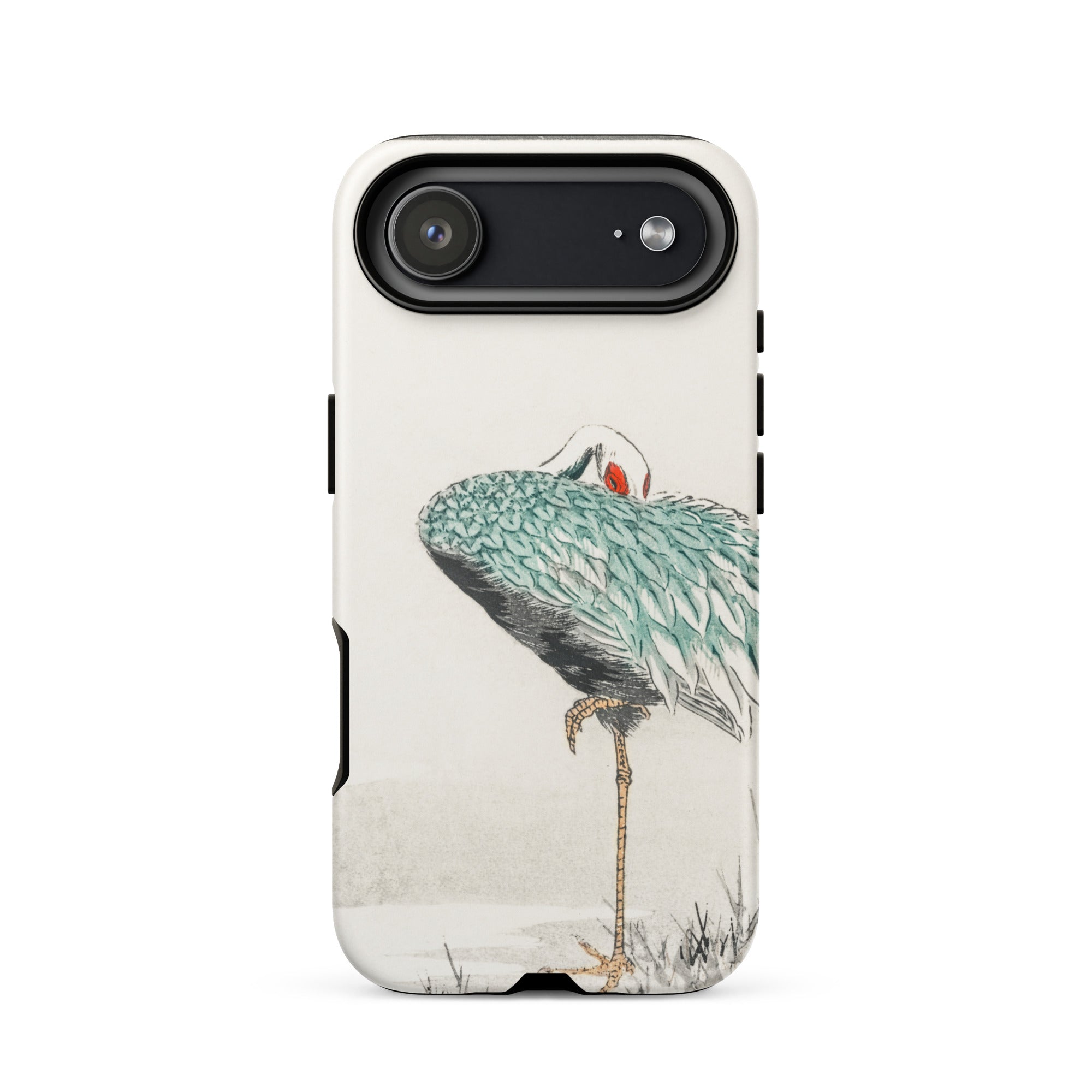 Das gefiederte Phantasm auf Ihren Fingerspitzen, Numata Kashu's Crane Struts Digital Realms. Weißes Wunder, Emerald-skaliertes Enigma, sitzt an iPhoneRand. Sie, moderner Samurai, Katana von Wield Art - durch die weltliche Technologie mit dem Durchschnitt Meiji-era Mojo.