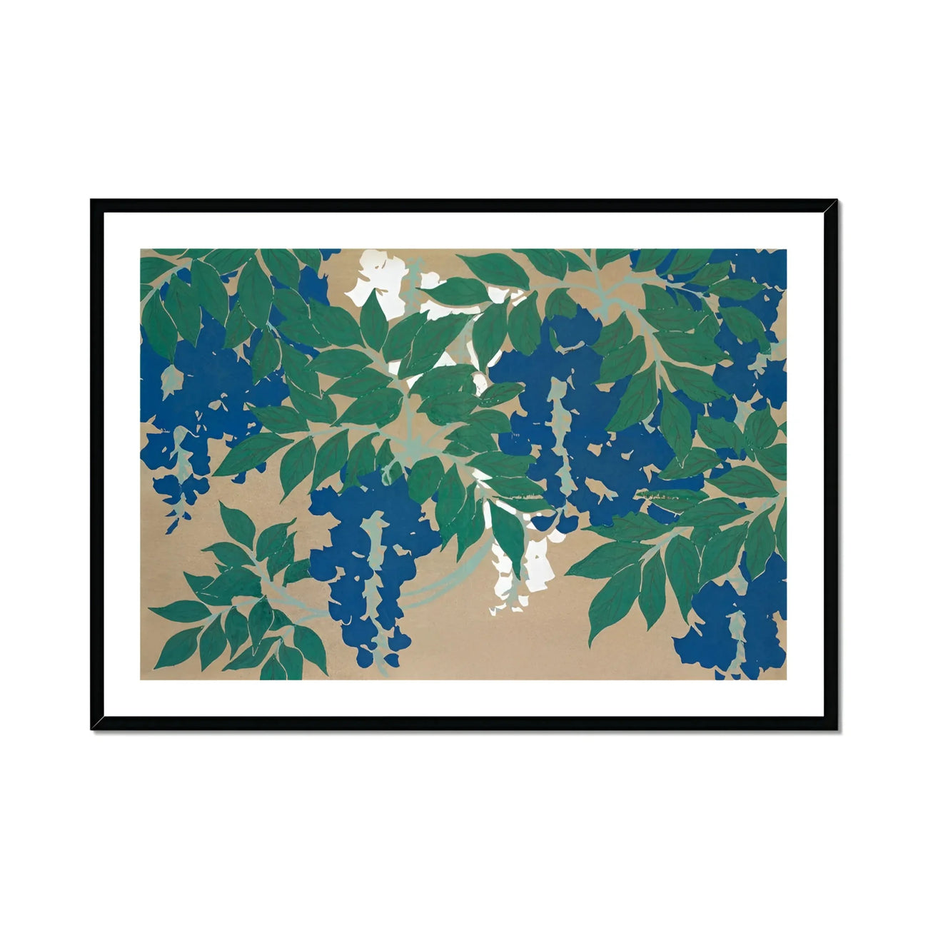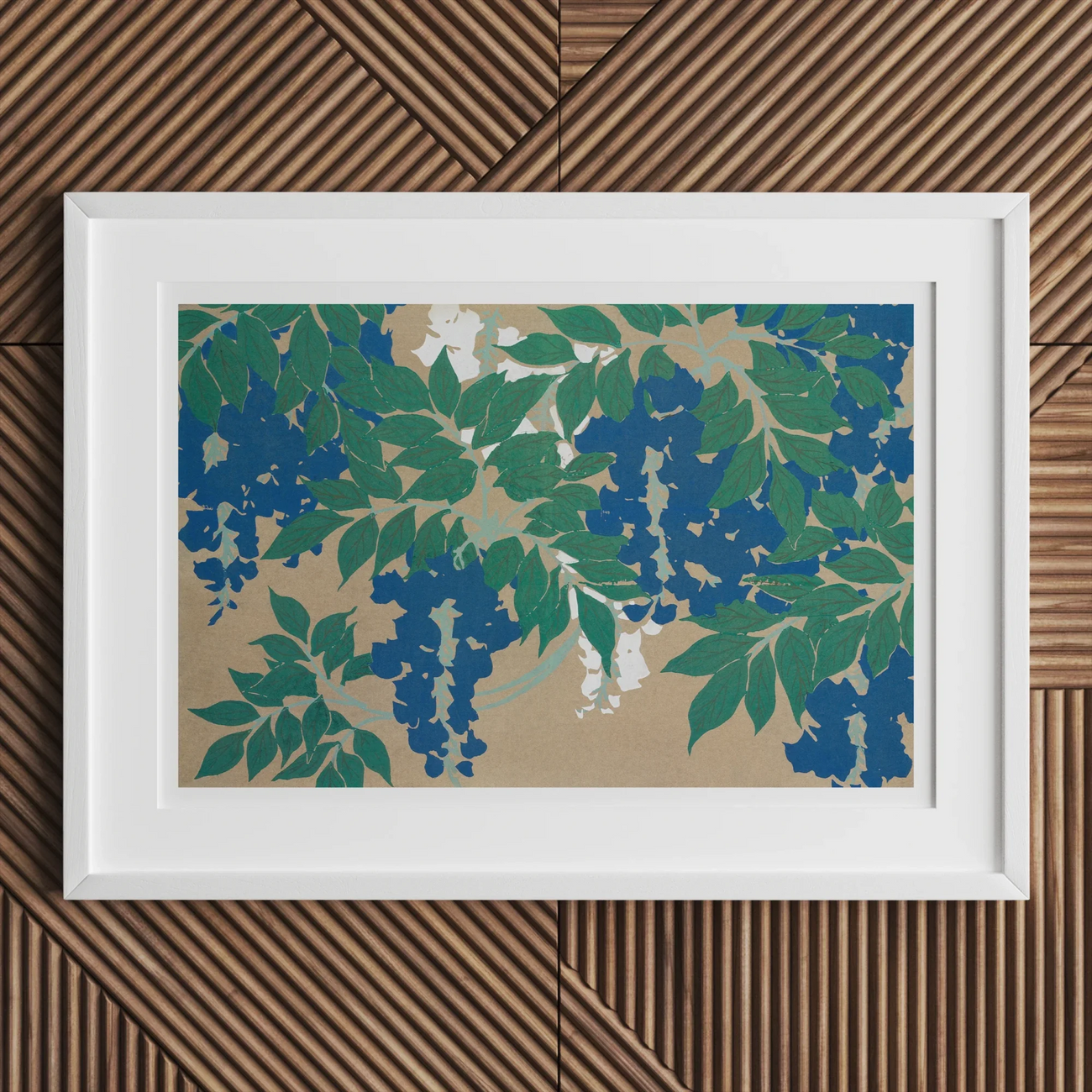 Sekkas Druck "Wisteria from Momoyogusa" wird Ihren Raum mit seinem hypnotischen Tanz von Indigo Blooms und Emerald Laub verzaubern. In eine faszinierende Welt von transportiert werden Meiji-era Kunst. Setzen Sie Sgainst eine sandige Hintergrund Jugendstil's fließende Gnade.
